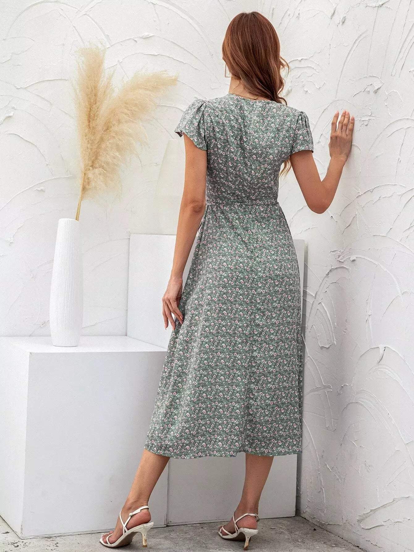 فستان Ditsy بطبعة زهور وبحواف شق بدون حزام