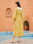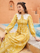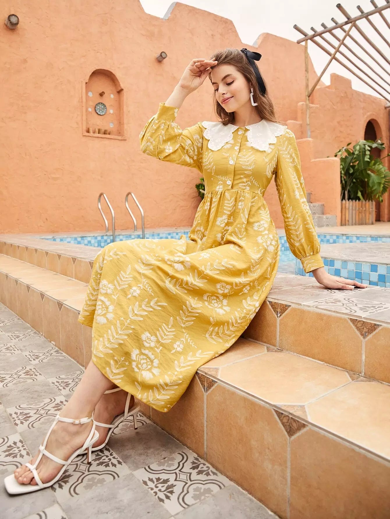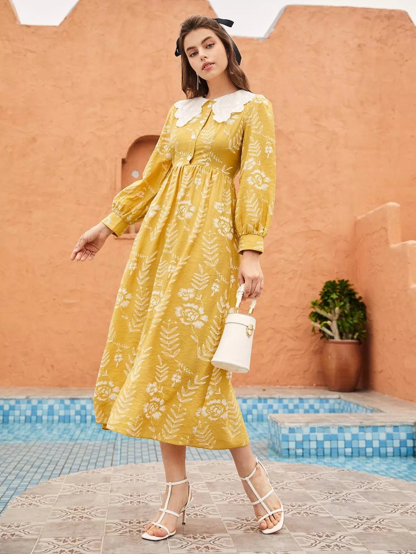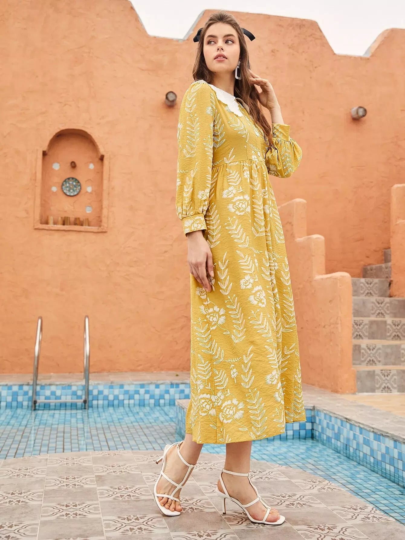 فستان بياقة دمية بياقة على شكل حرف A بياقة زهور وأوراق بلون مغاير