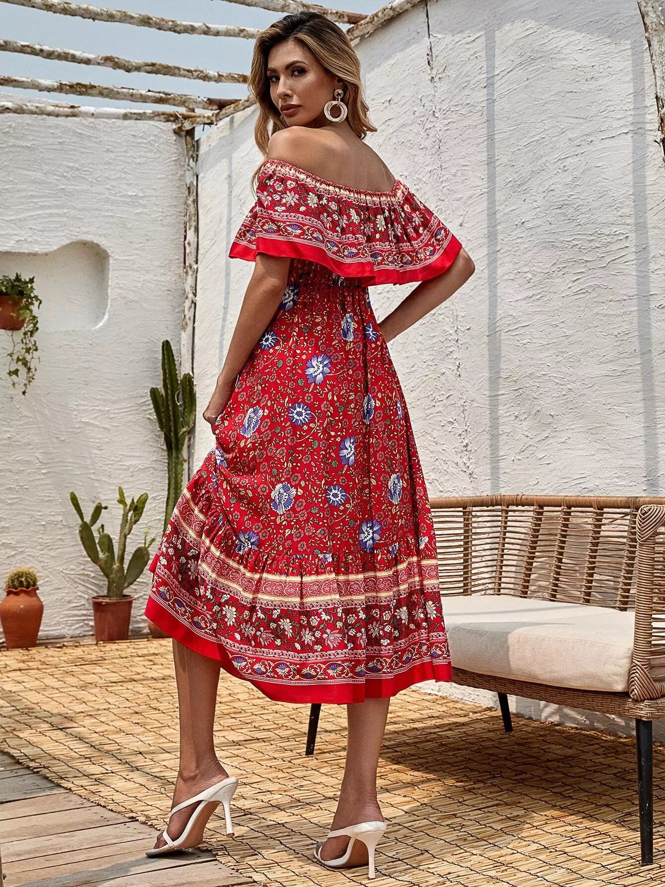 فستان بحافة كشكش بطبعة زهور بطبعة كشكش على شكل حرف A