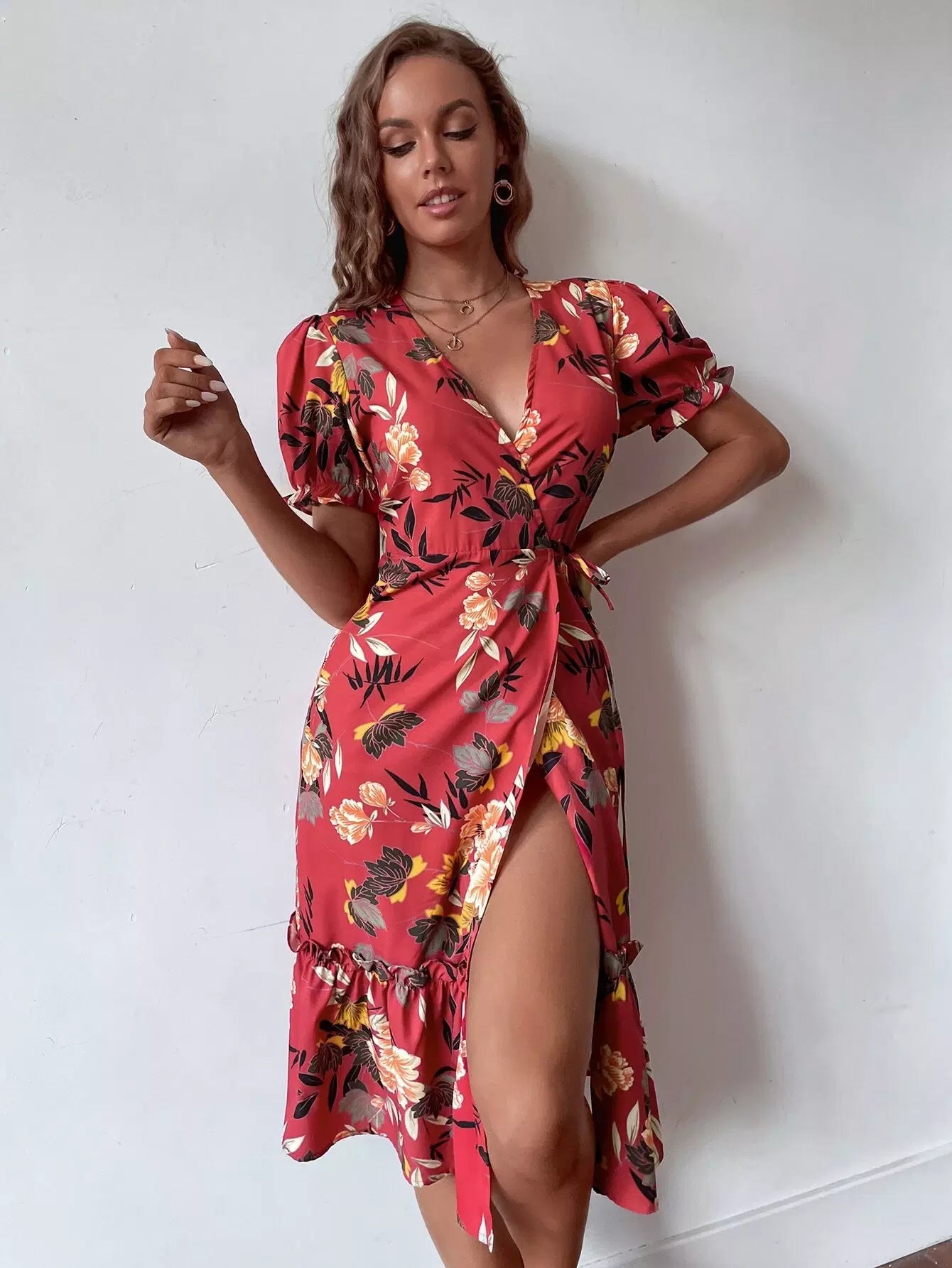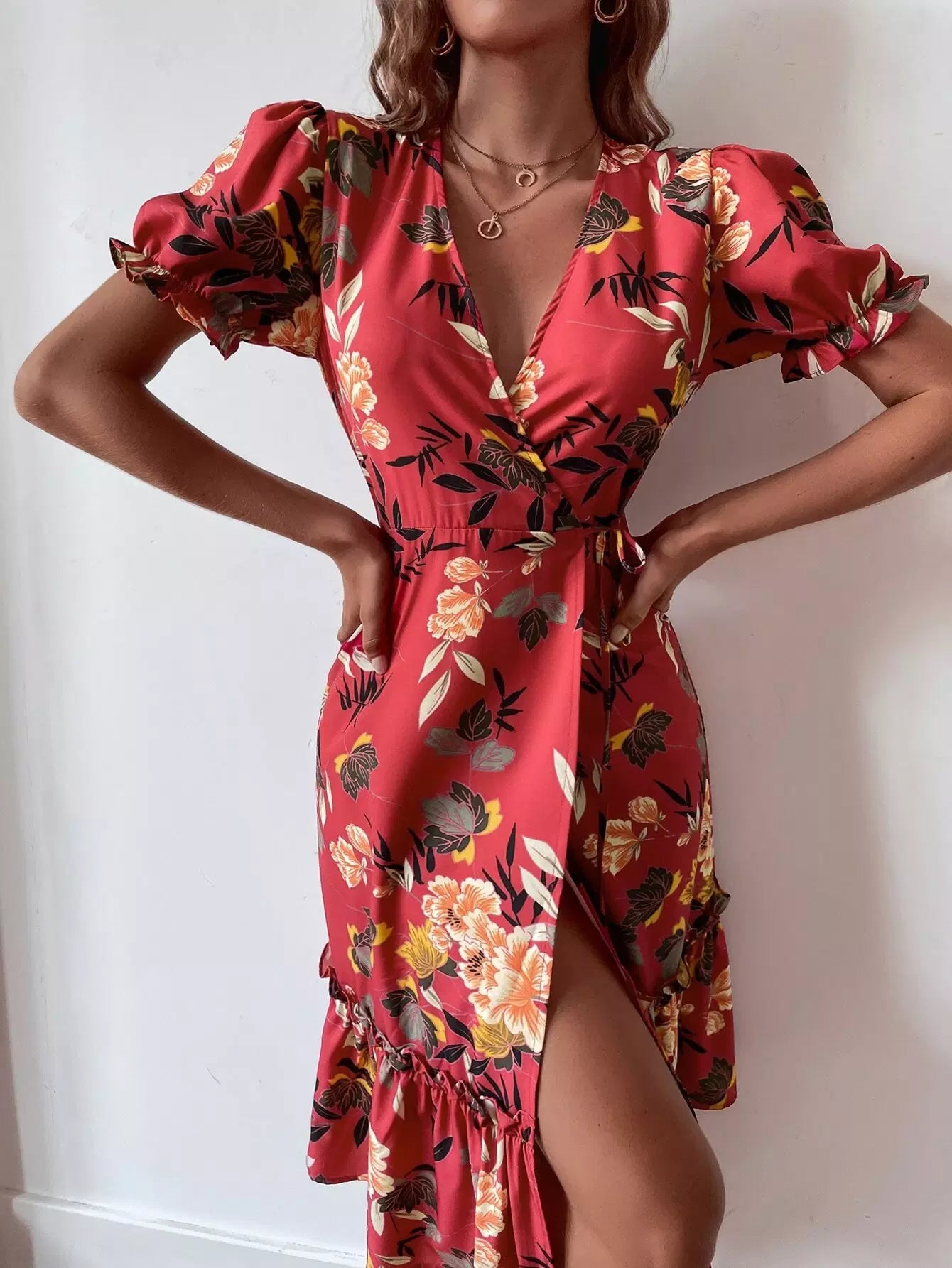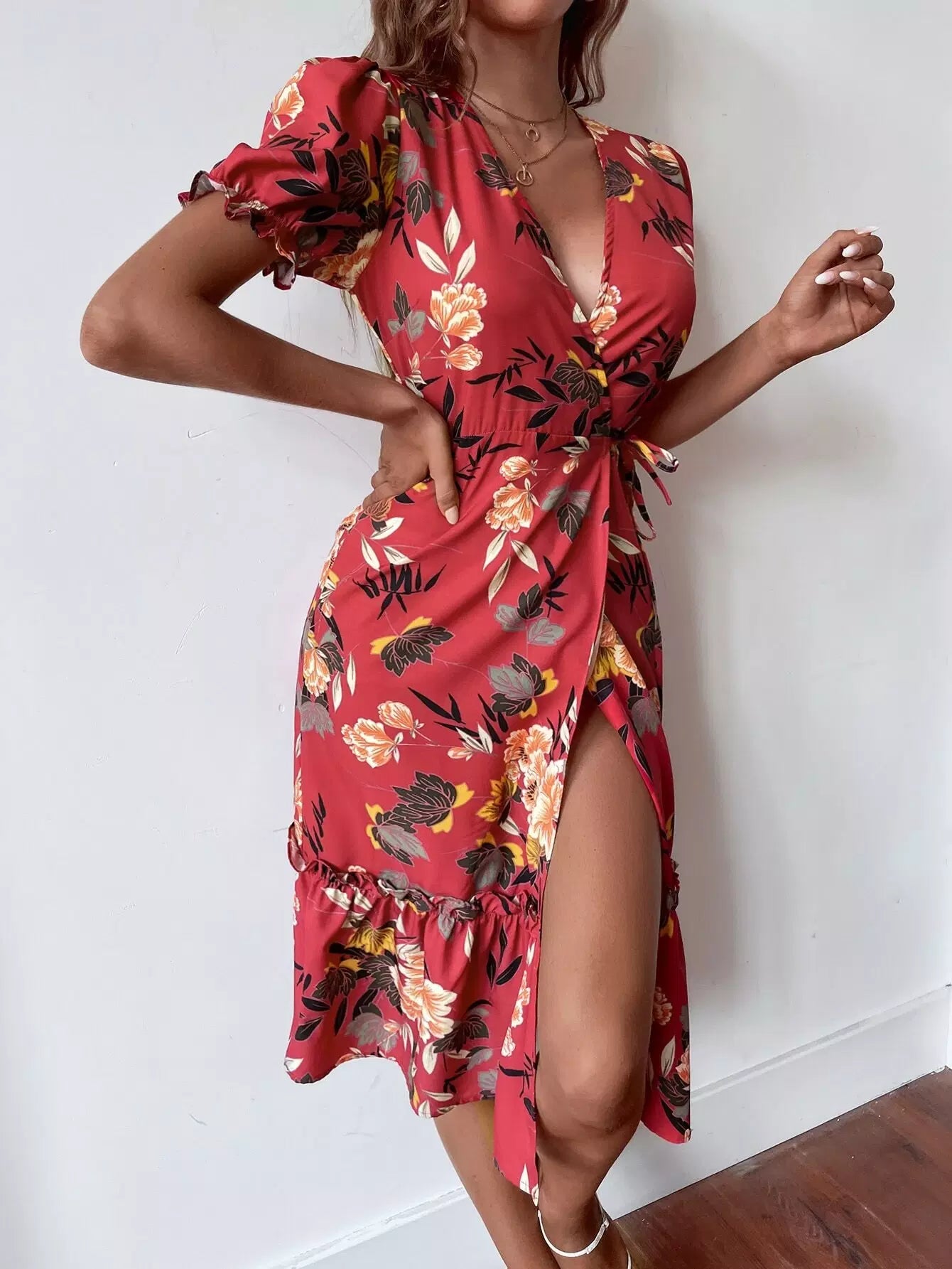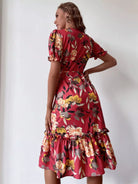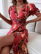 فستان بأكمام زهرية بأكمام كشكش ملفوفة على شكل كشكش