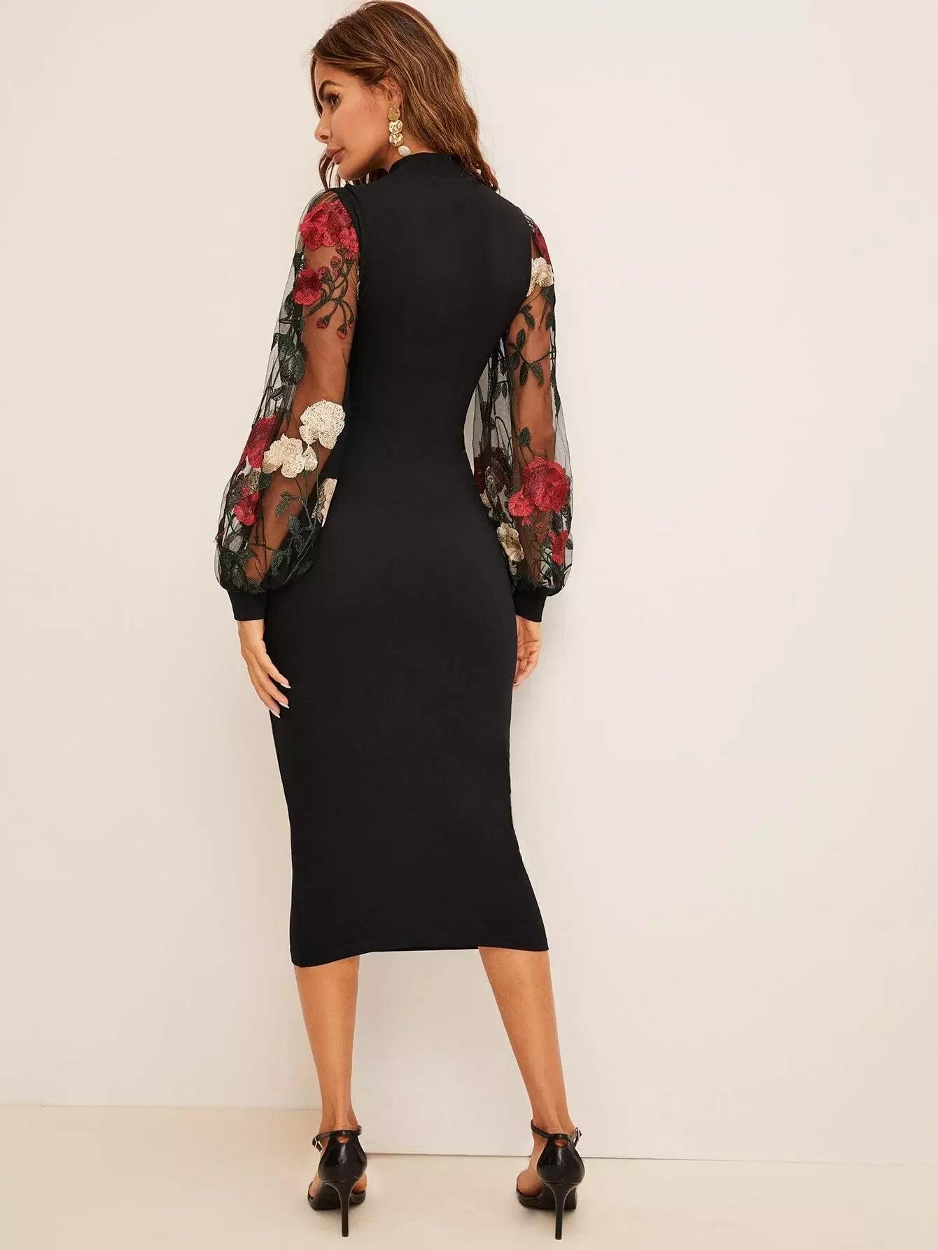فستان بأكمام شبكية مطرزة بالزهور بأكمام شبكية