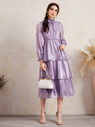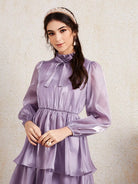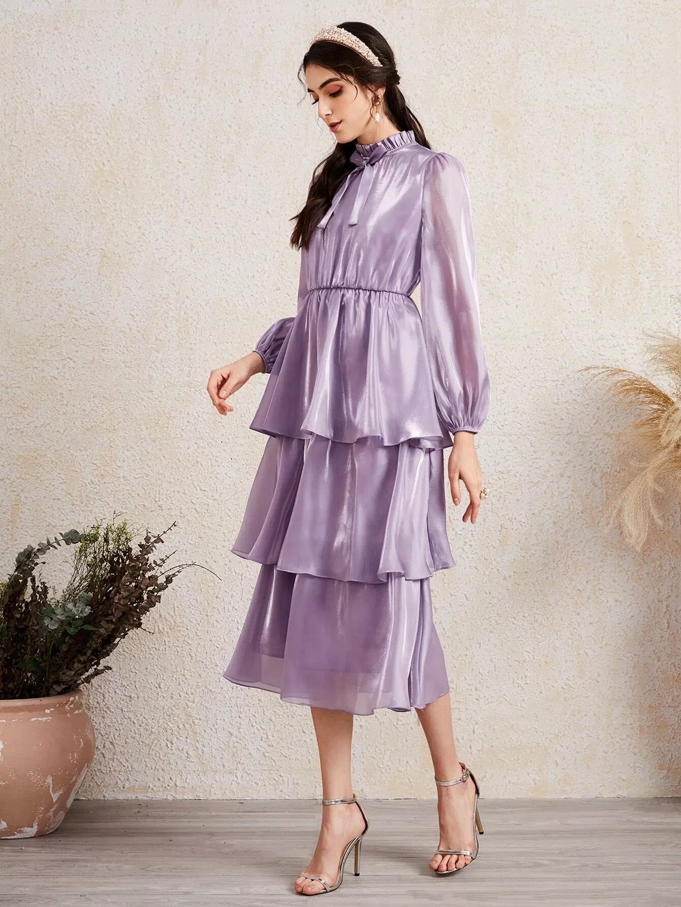 فستان بياقة مزركشة بربطة عنق أمامية بربطة عنق أمامية بأكمام متعددة الطبقات