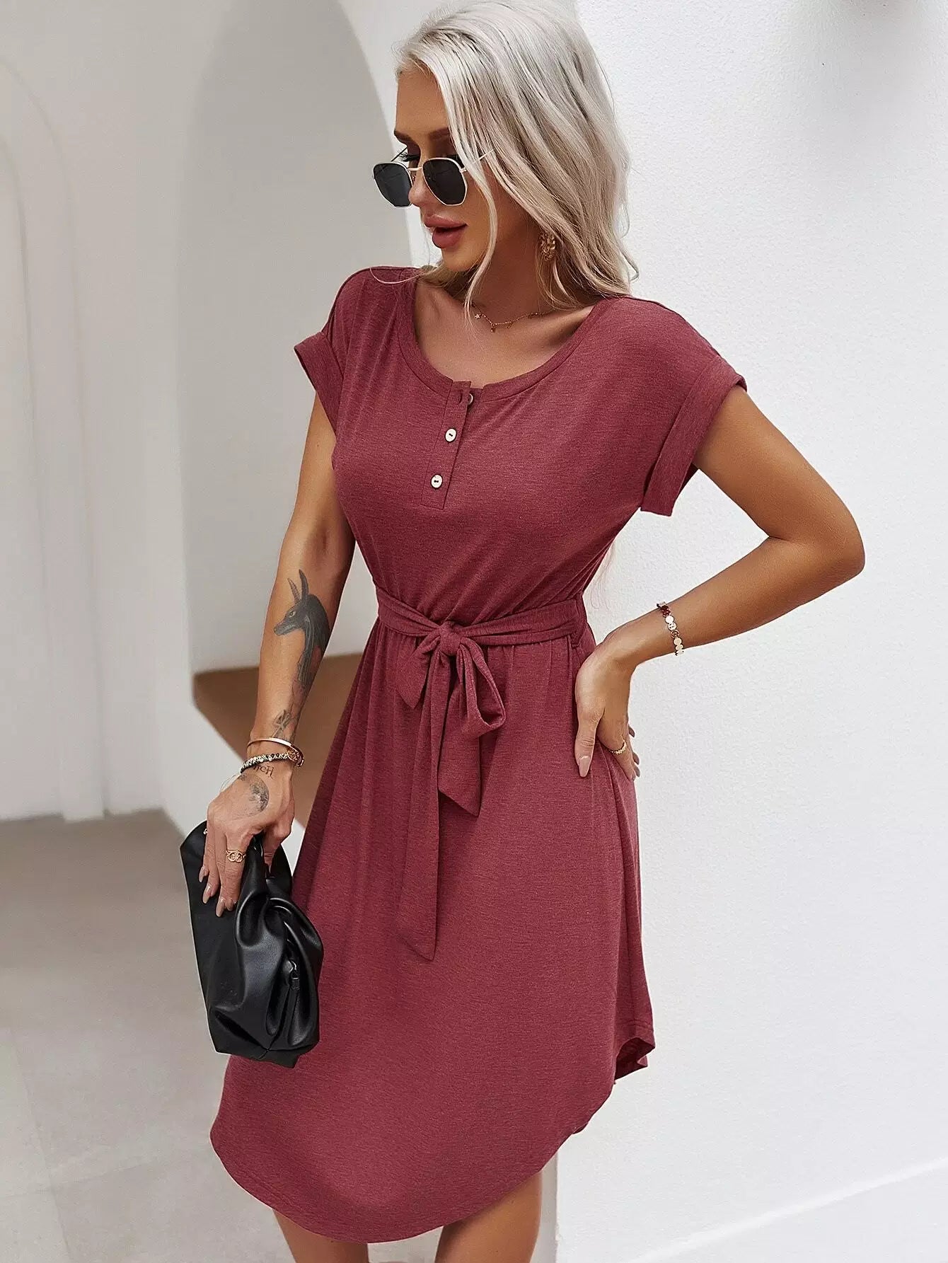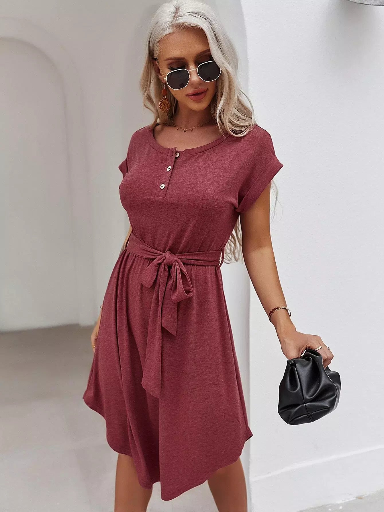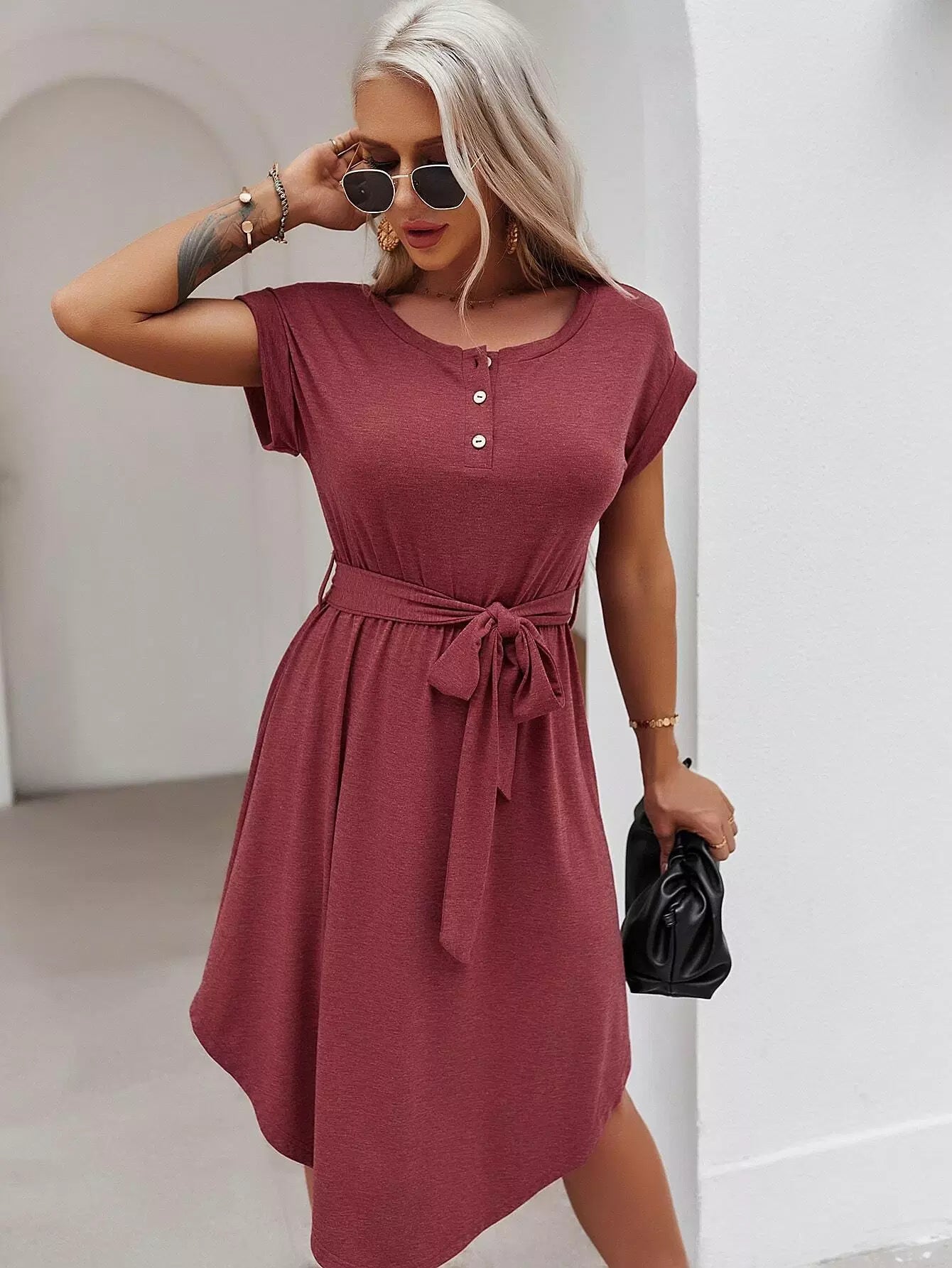 للنساء - فستان بحزام وحاشية منحنية بنصف أزرار