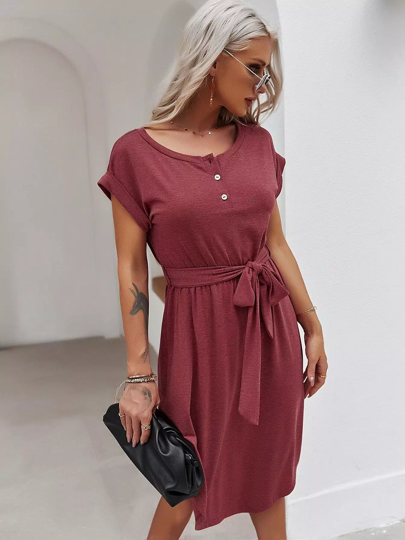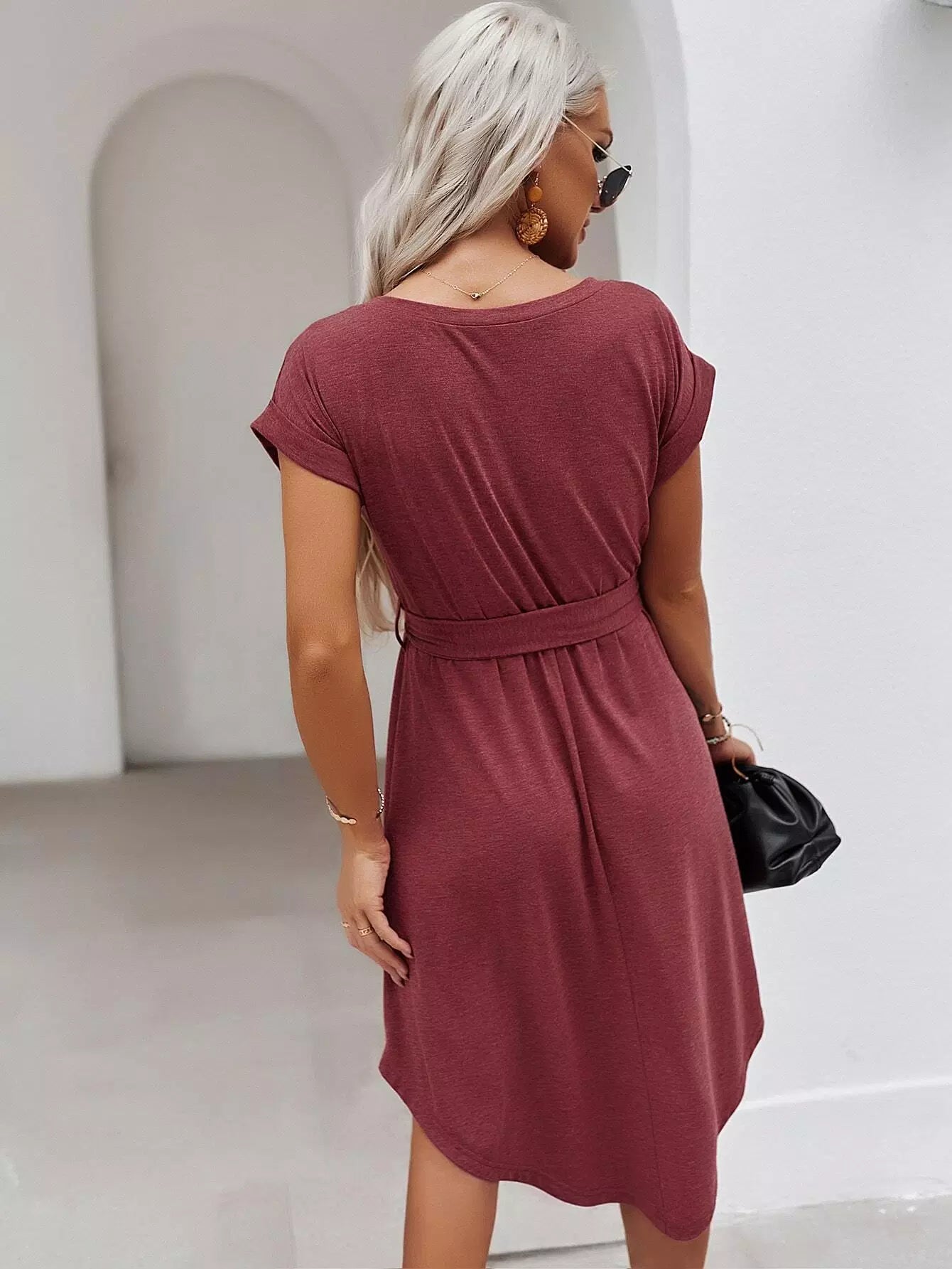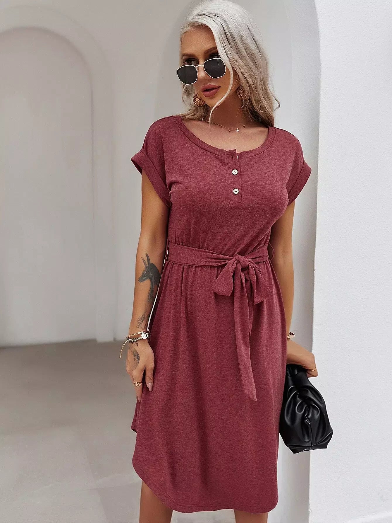 للنساء - فستان بحزام وحاشية منحنية بنصف أزرار