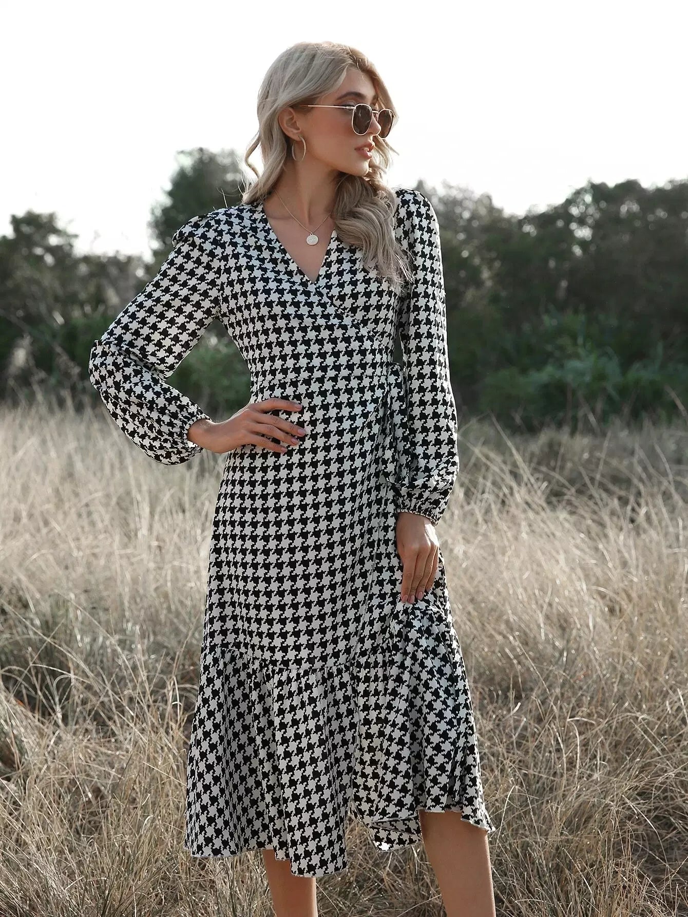 فستان ملفوف بحاشية مكشكشة بنقش مربعات بدون حزام