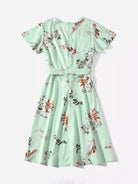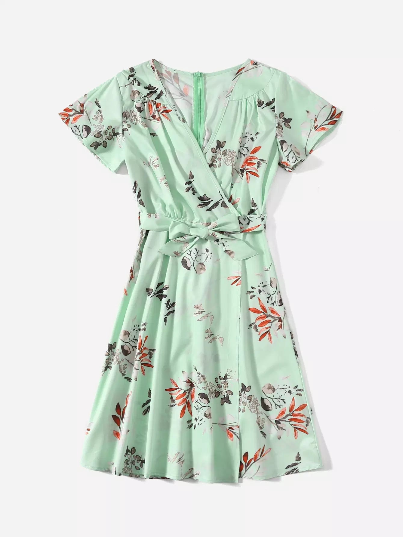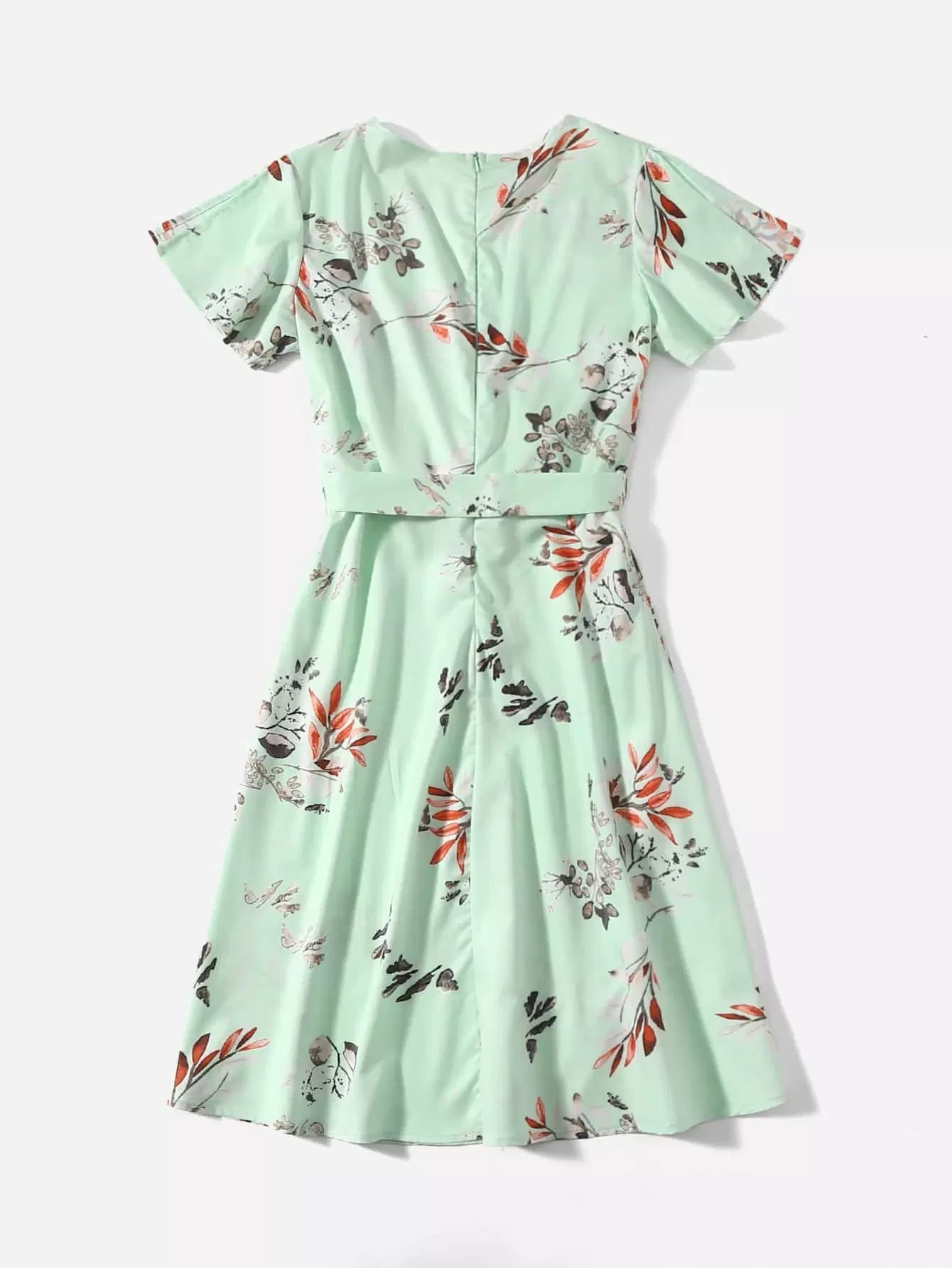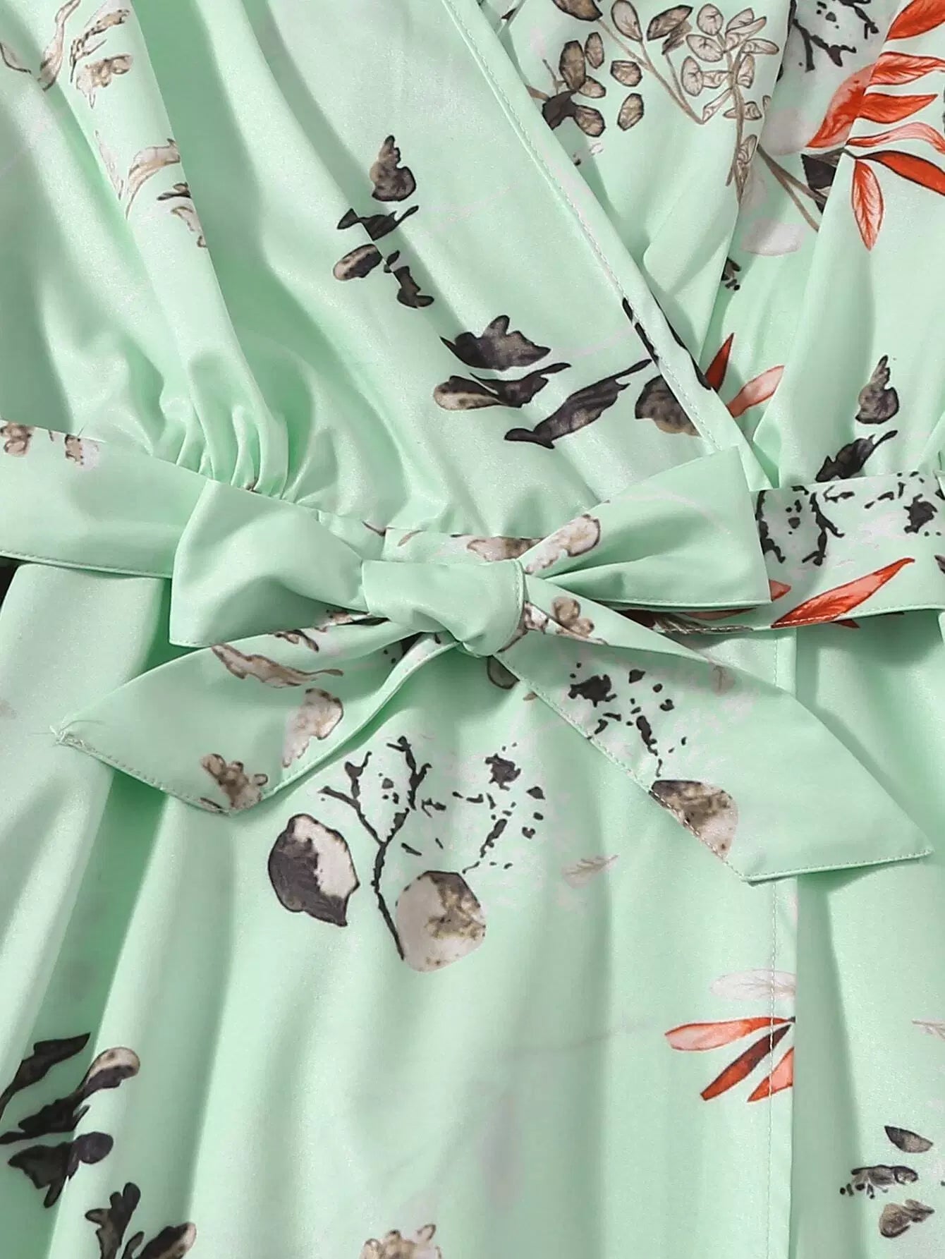 فستان على شكل حرف A ملفوف بطباعة أوراق الشجر بدون حزام