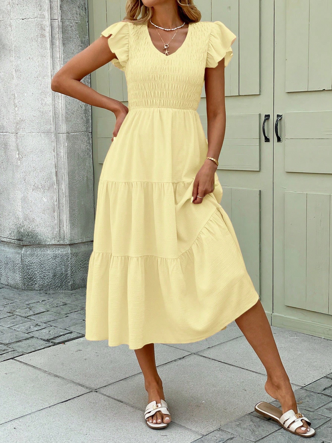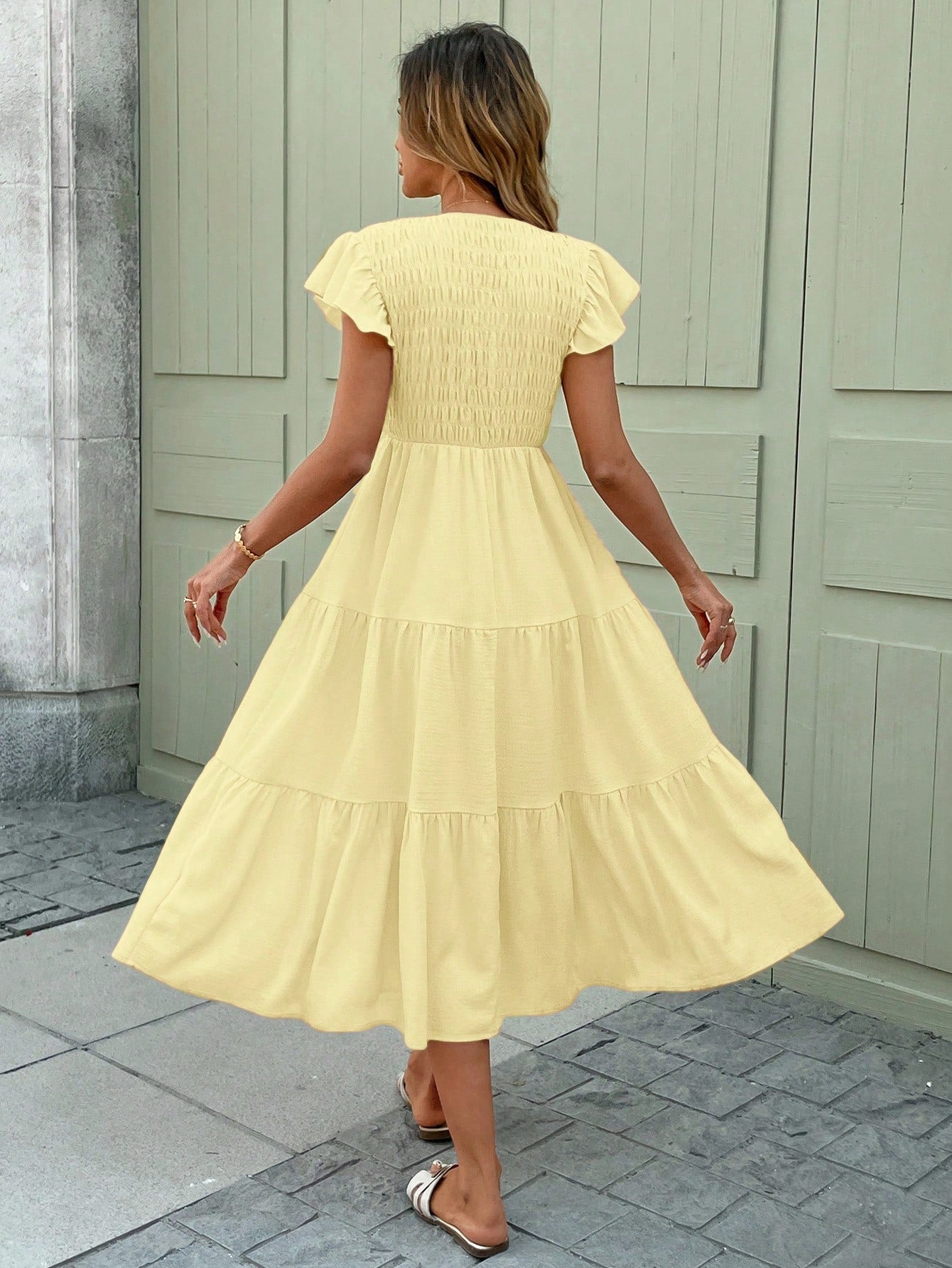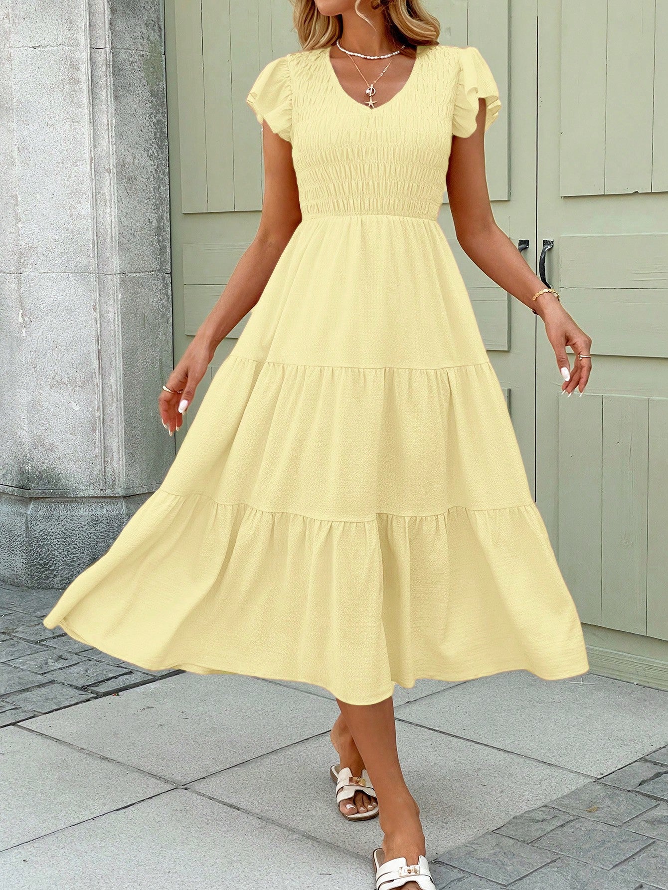 فستان LUNE بلون أصفر زبدة رومانسي ربيعي، مزين بكشكشة وحافة مكشكشة، متوسط الطول، للنساء، بوهيمي صيفي