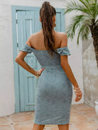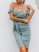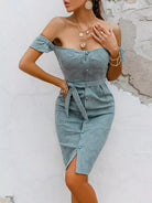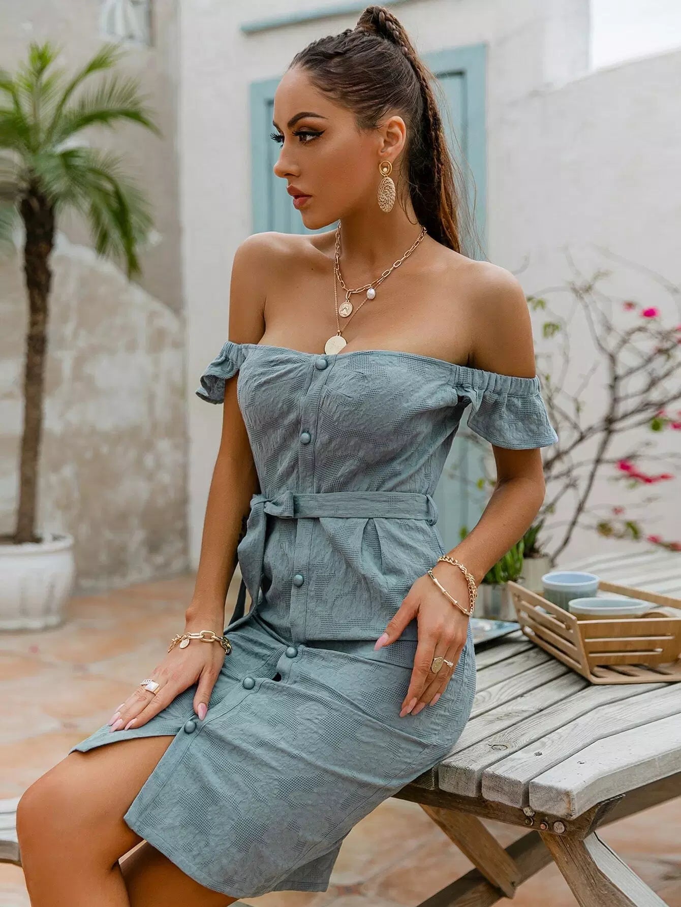 فستان جاكار بأزرار أمامية وأكتاف مكشوفة بدون حزام