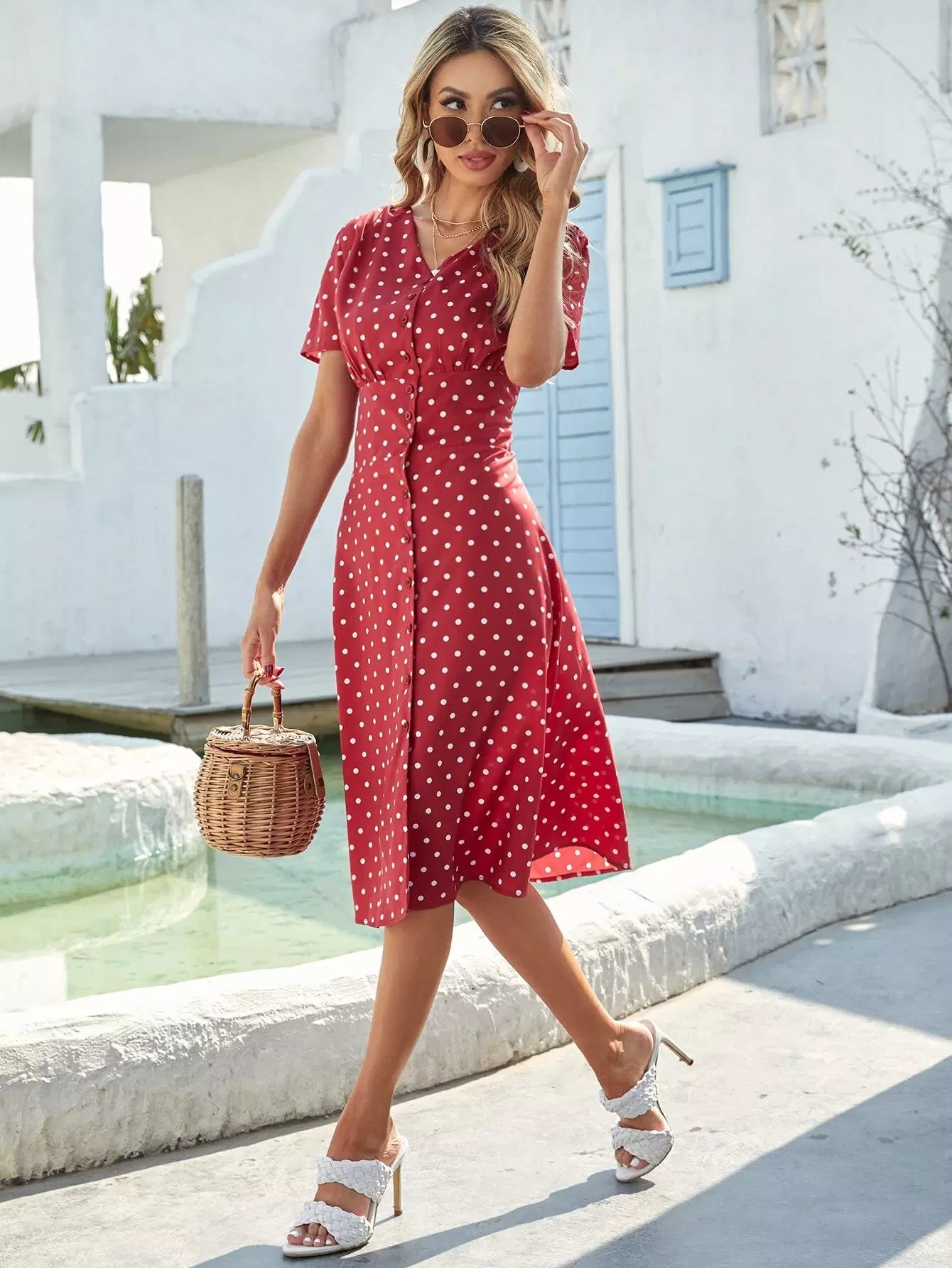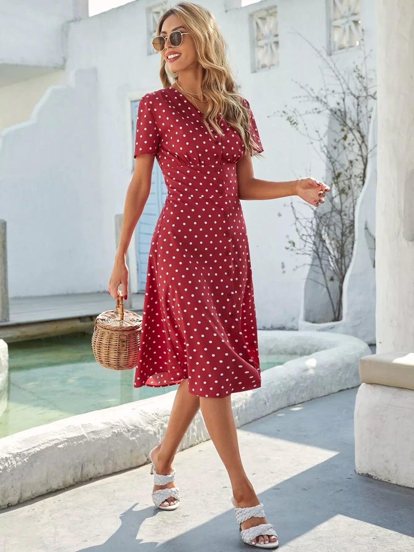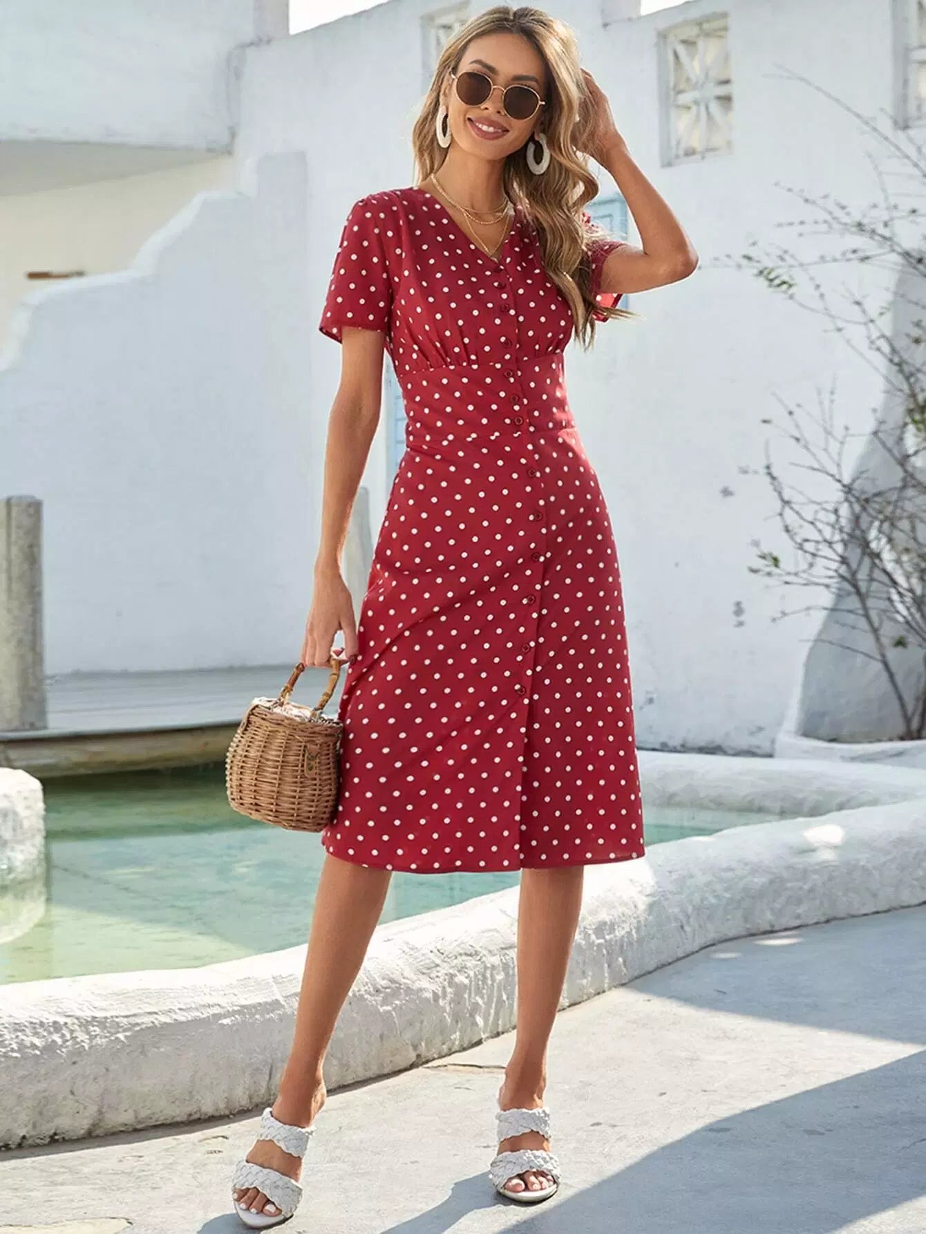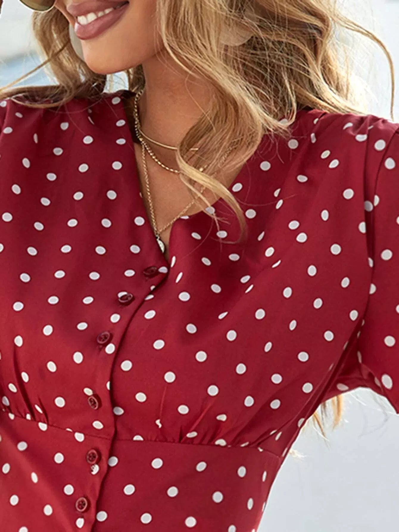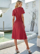 فستان منقّط بأزرار منقّطة بأزرار أمامية على شكل حرف A