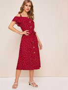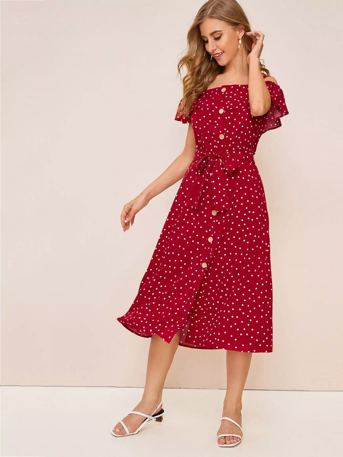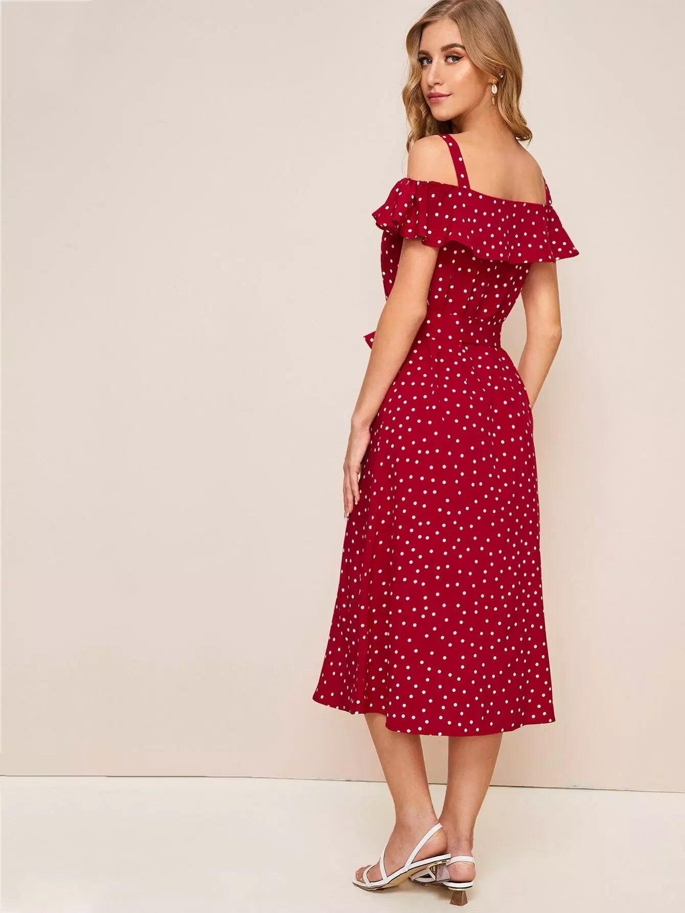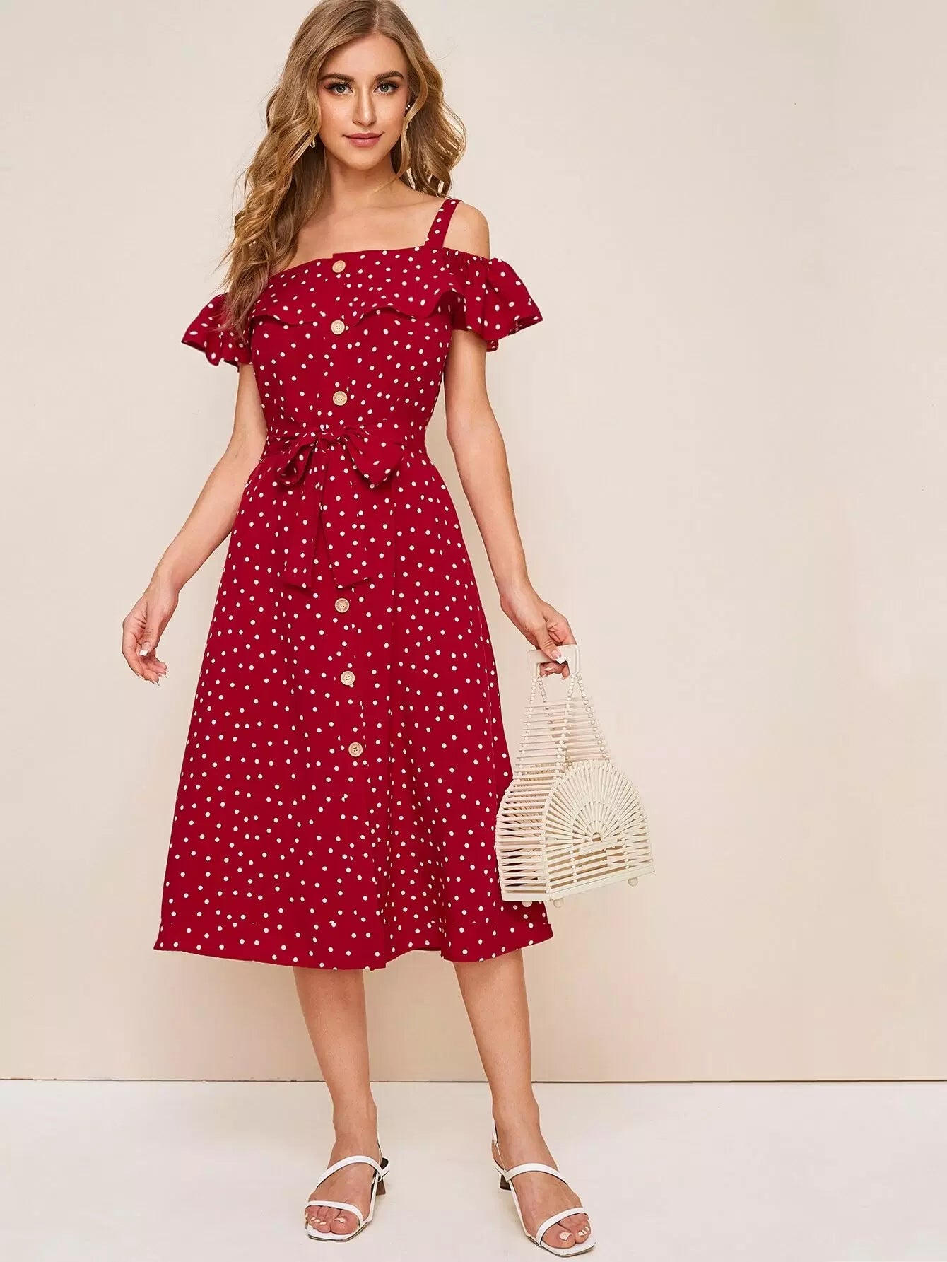 فستان بولكا دوت بأزرار أمامية وبزخرفة كشكش بدون حزام