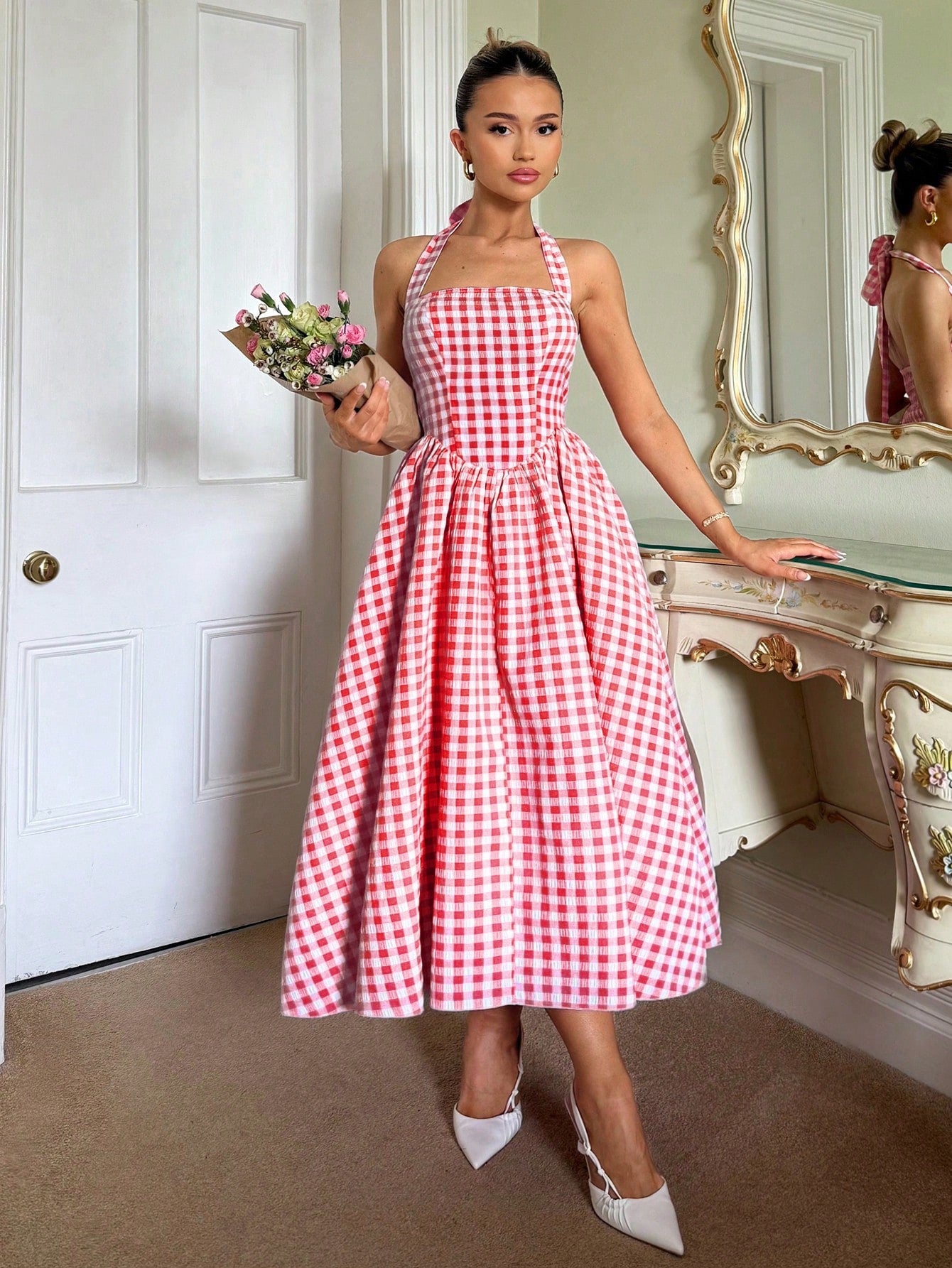 فستان ريلينا ربيعي وصيفي بتصميم أميري ريفي بقصة ضيقة من القماش الشبكي الصلب الناعم بنقشة مربعات متأرجحة وحزام حول الرقبة