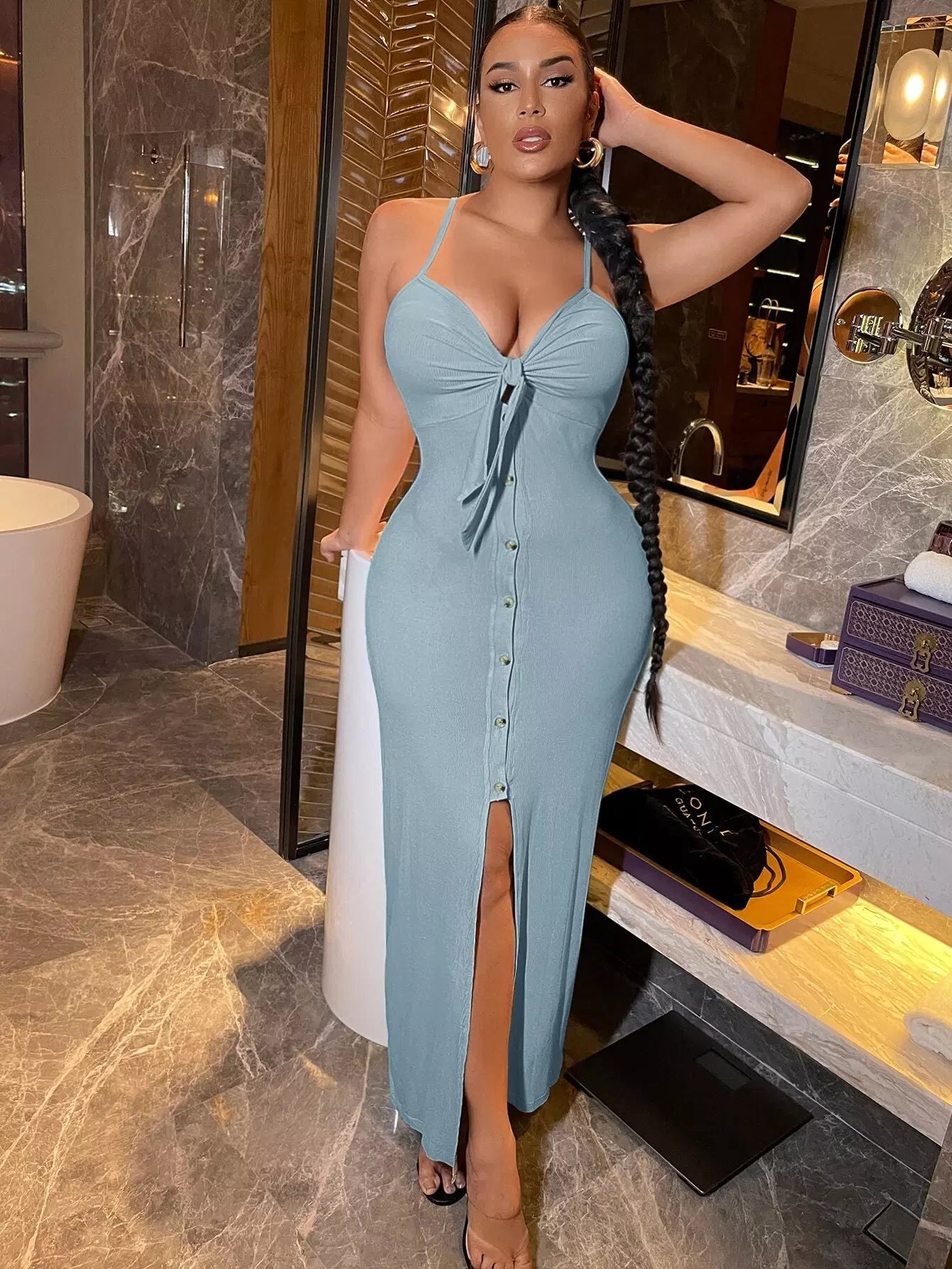 فستان محبوك بعقدة من الأمام بأزرار أمامية محبوكة على شكل ضلع