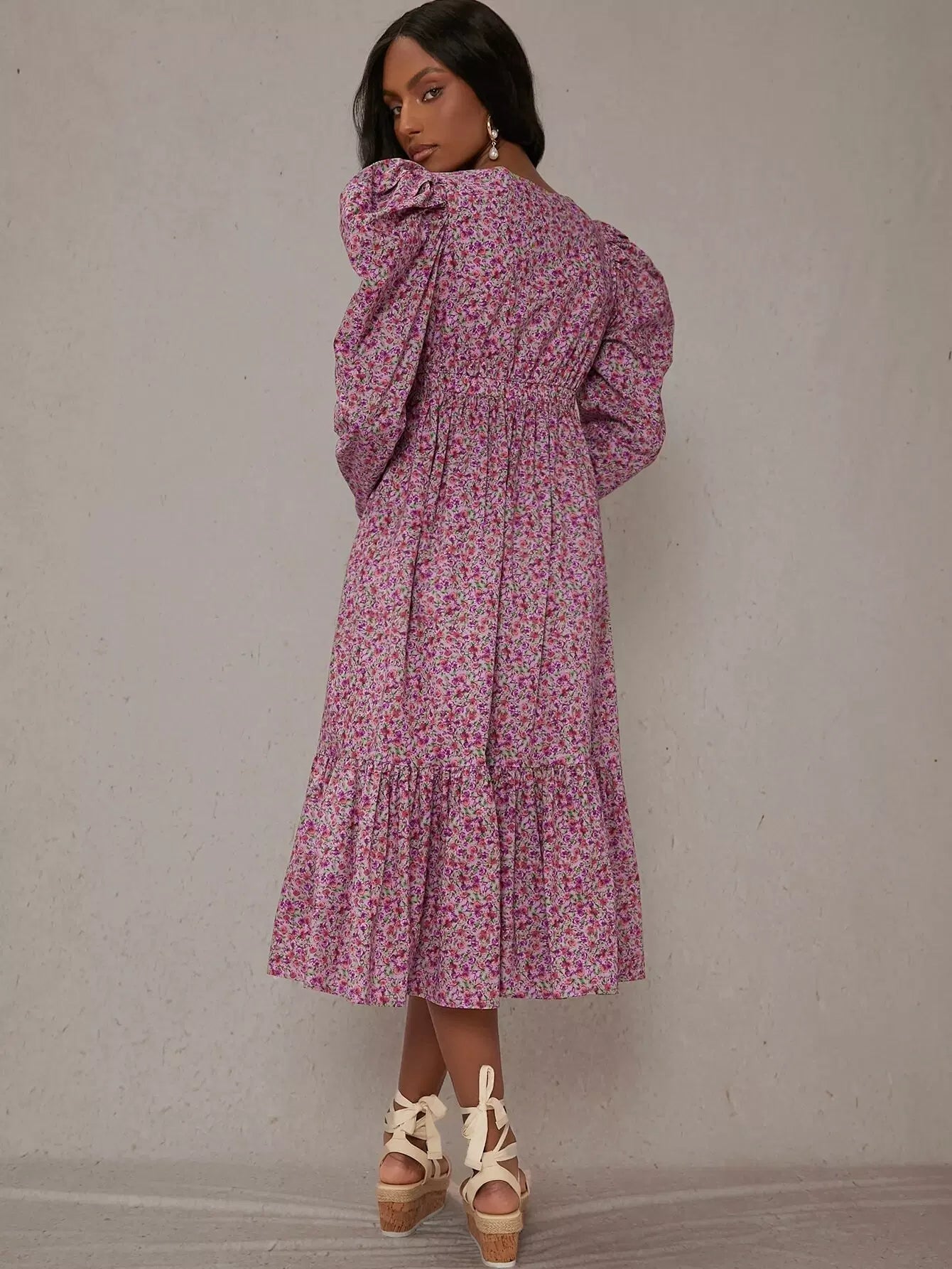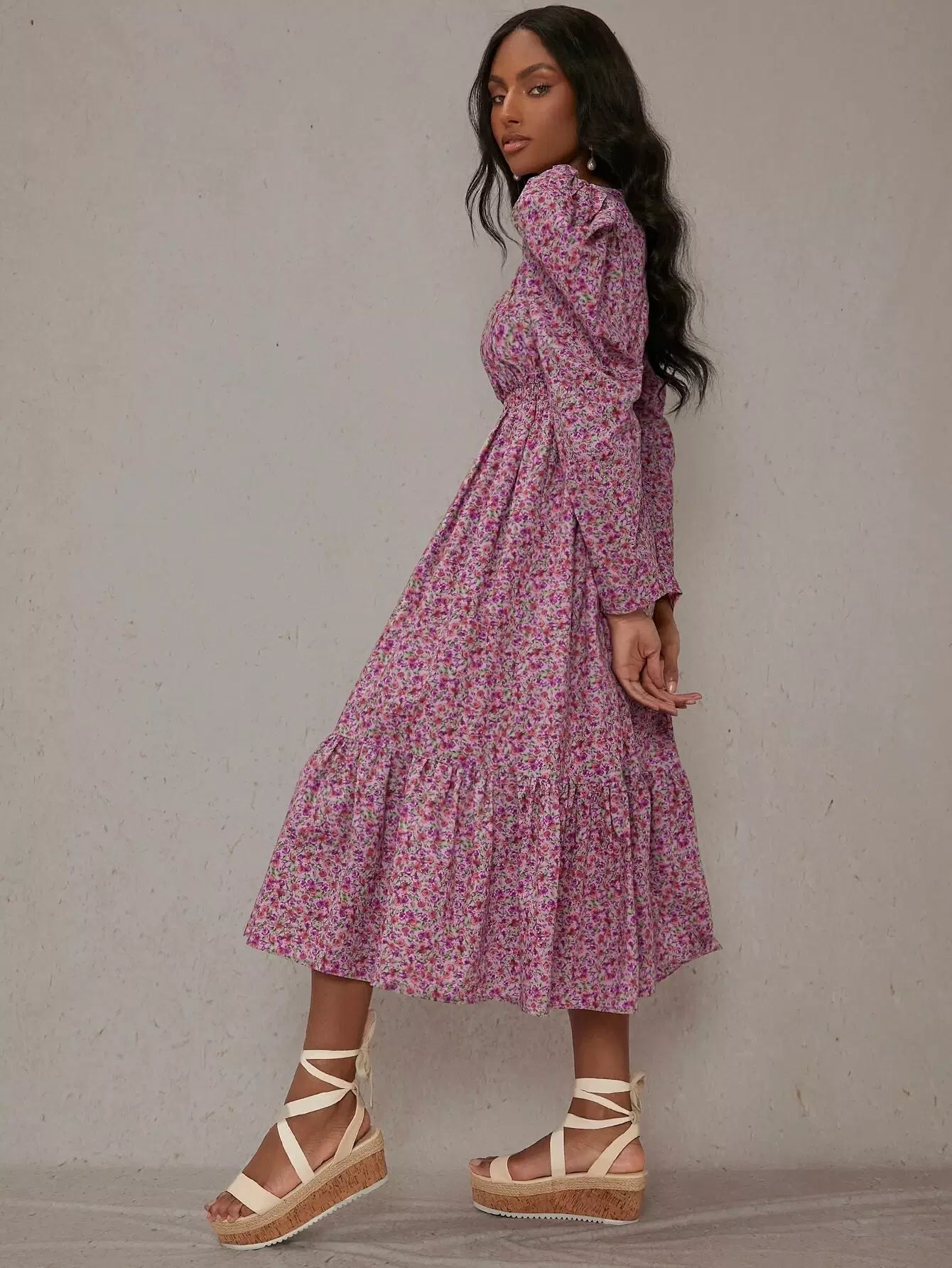 فستان بأكمام مكشكشة عند الصدر بأكمام ديتسي مزين بالزهور