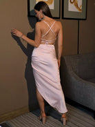 فستان كشكش بياقة منسدلة منسدلة بحافة غير متناظرة من الدانتيل بدون أكمام من الساتان