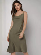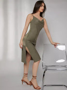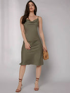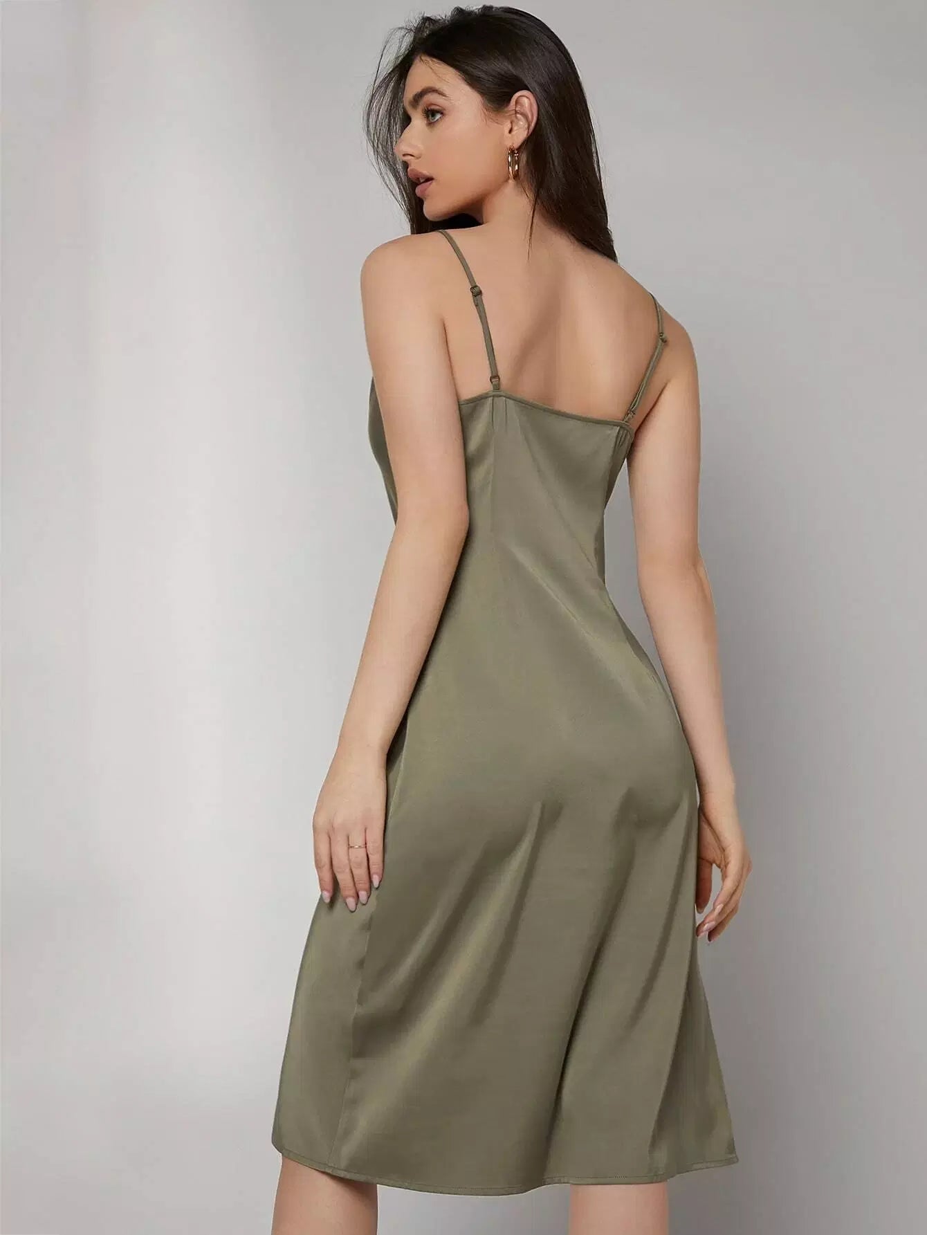فستان ساتان كامي بحافة منقسمة من الساتان