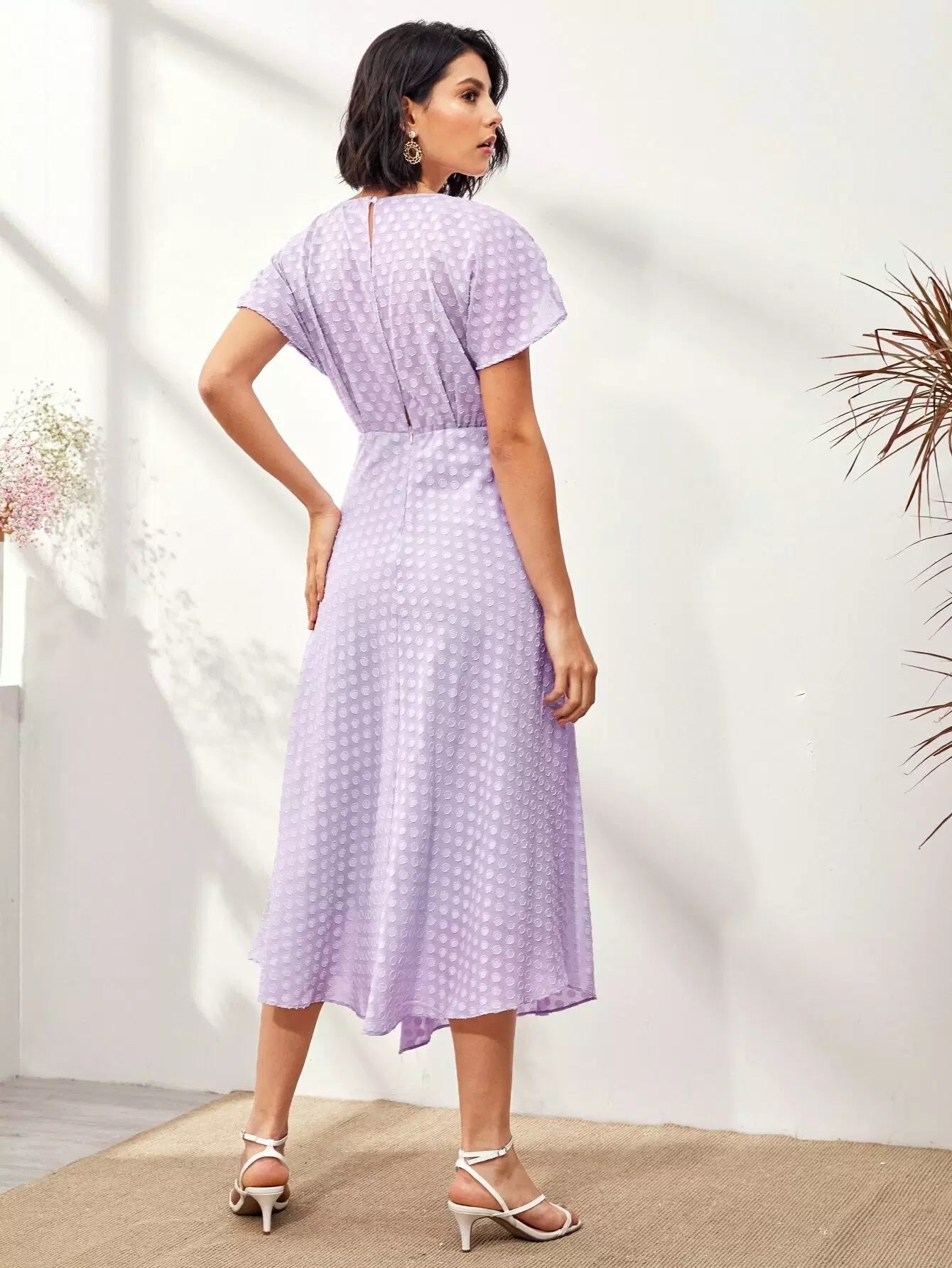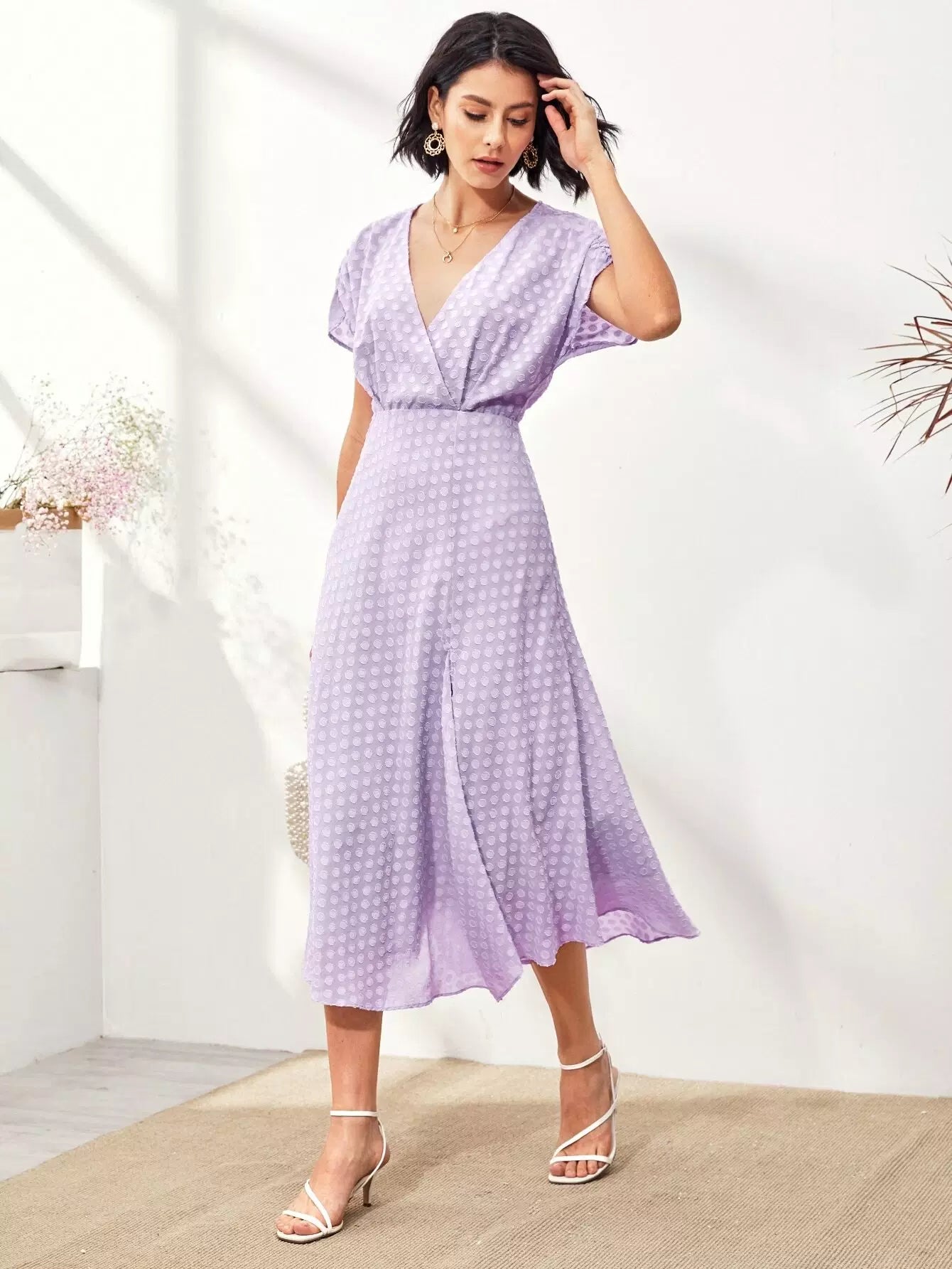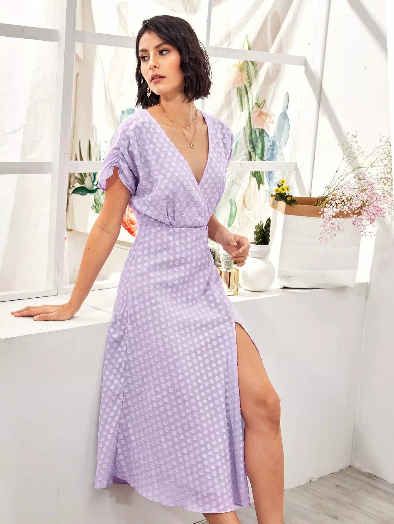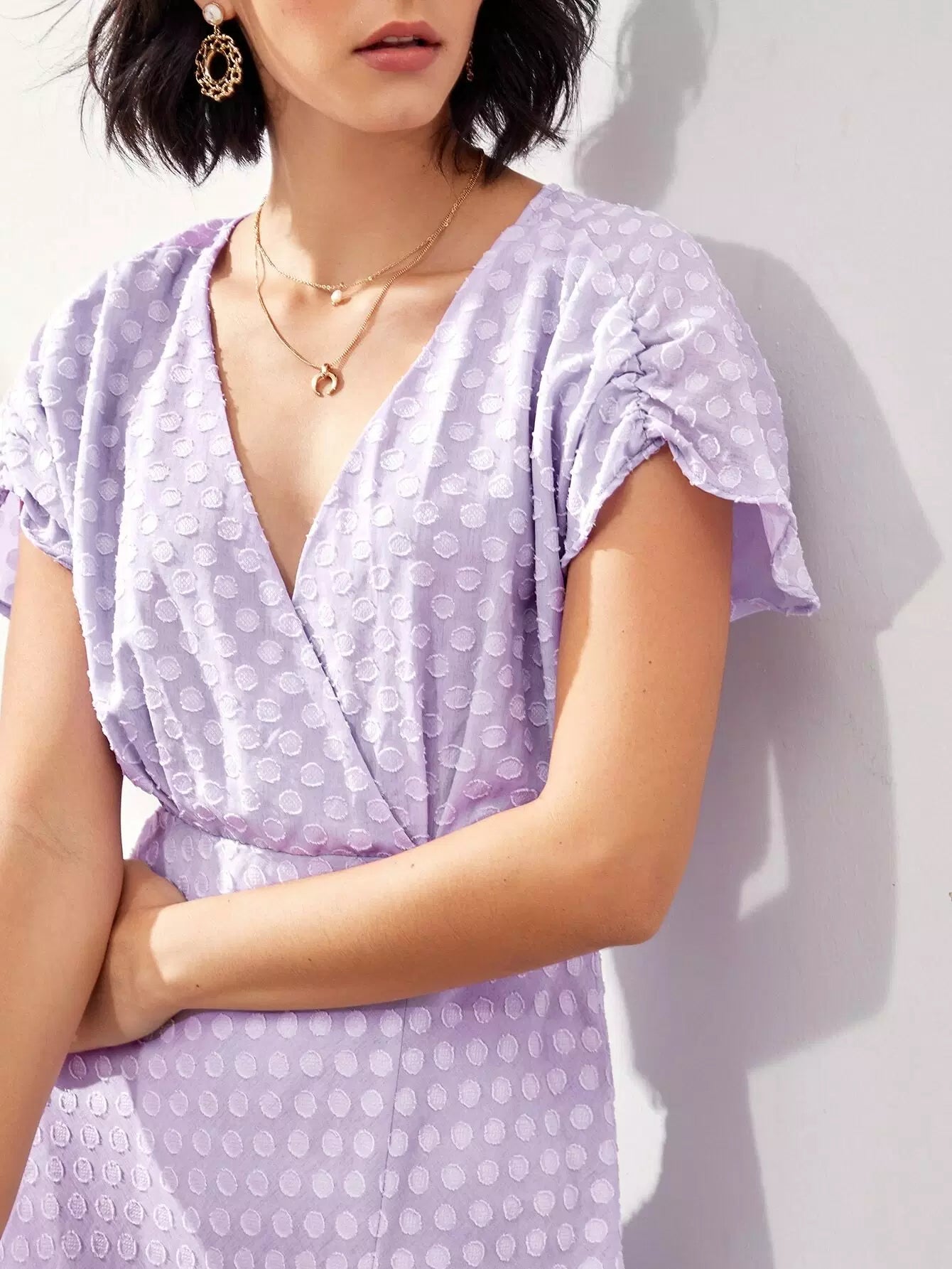 فستان برقبة كشكش بفتحة عنق منقسمة من الأمام على شكل حرف A