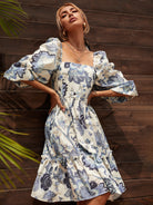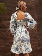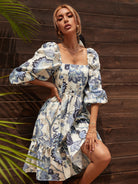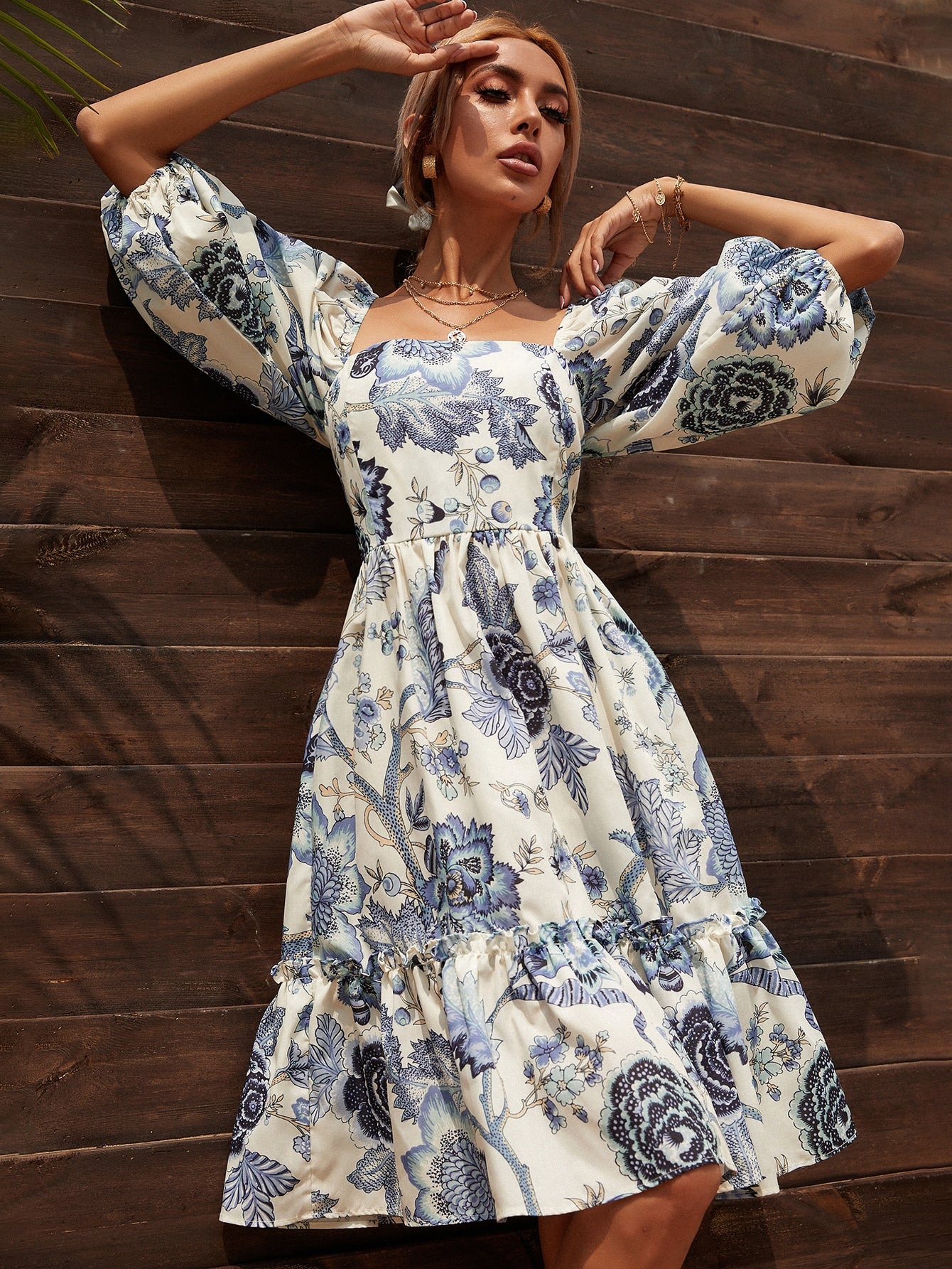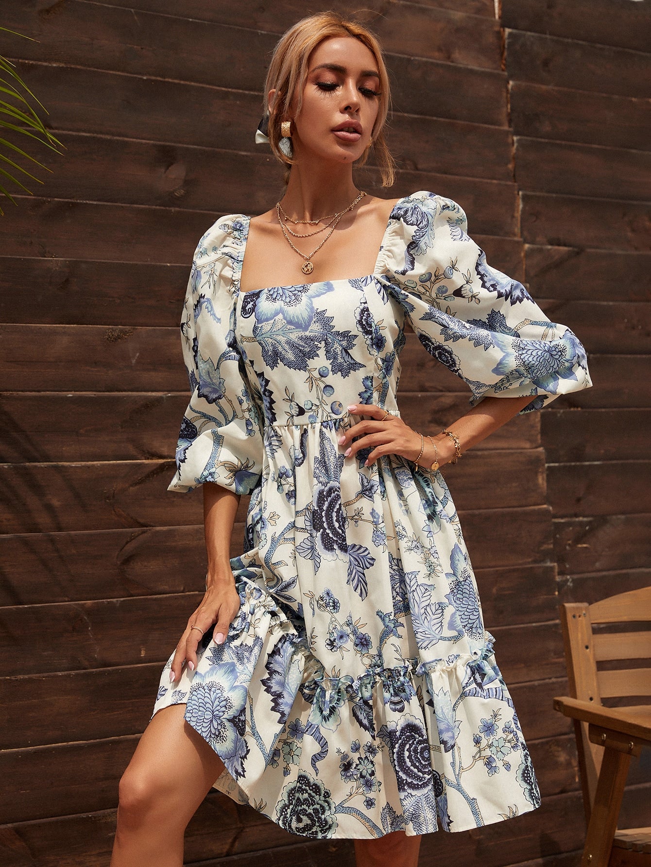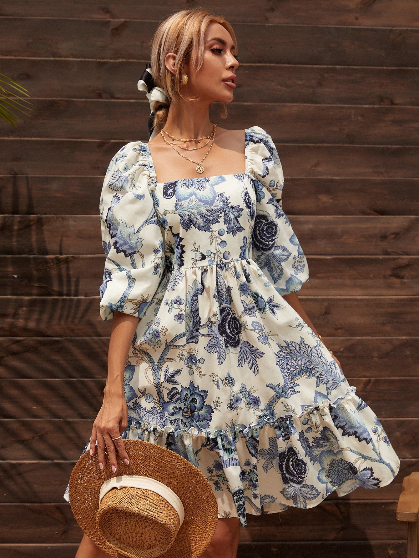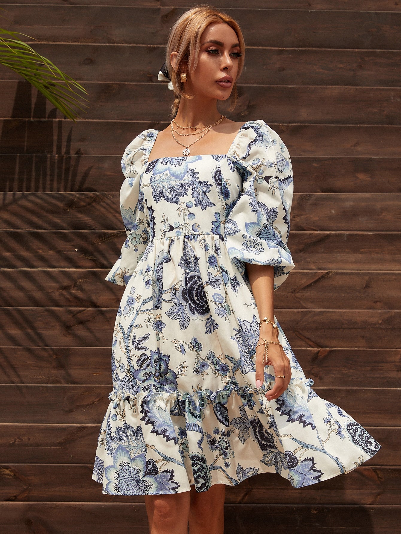 Floral Print Puff Sleeve Ruffle Hem Dress