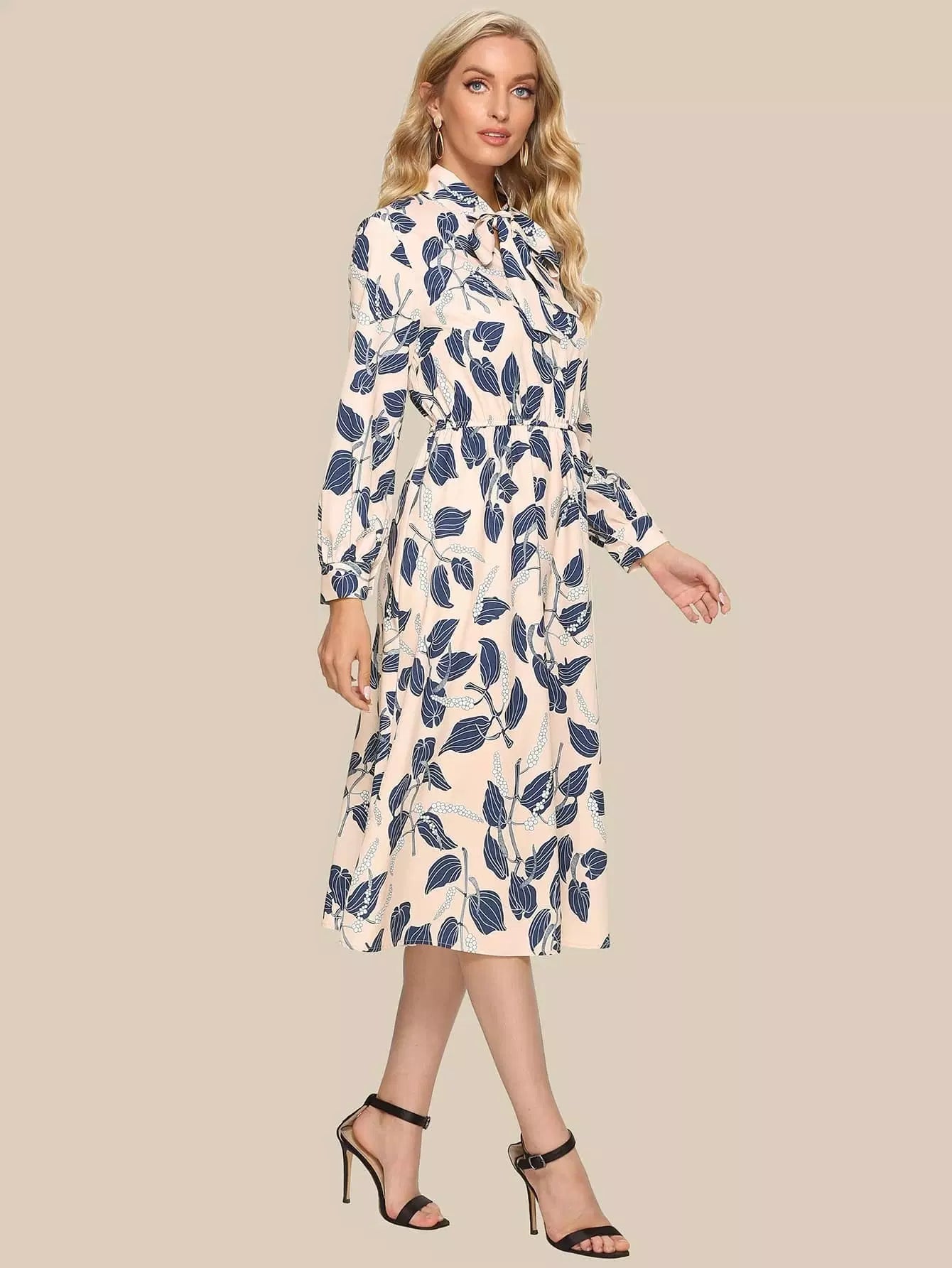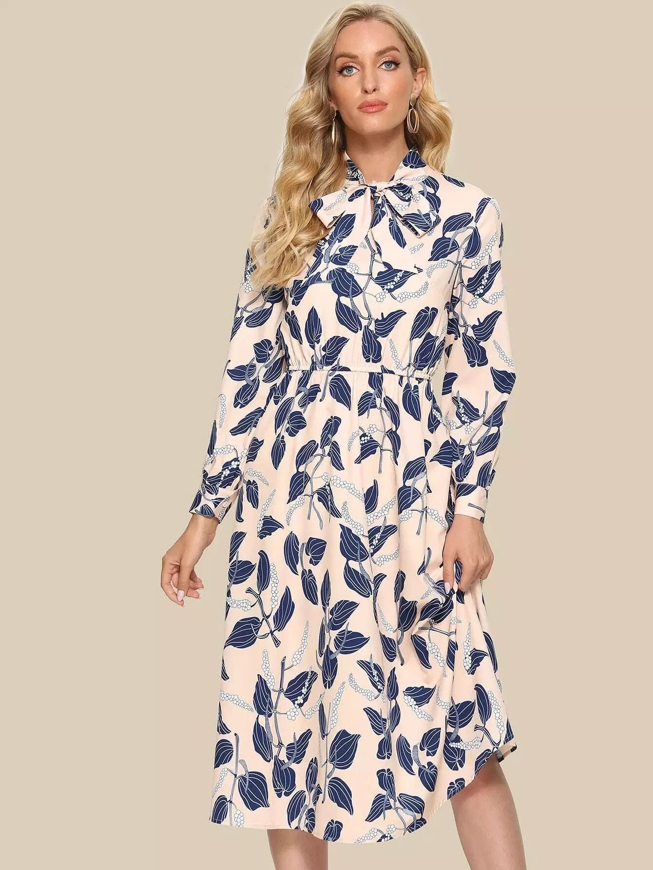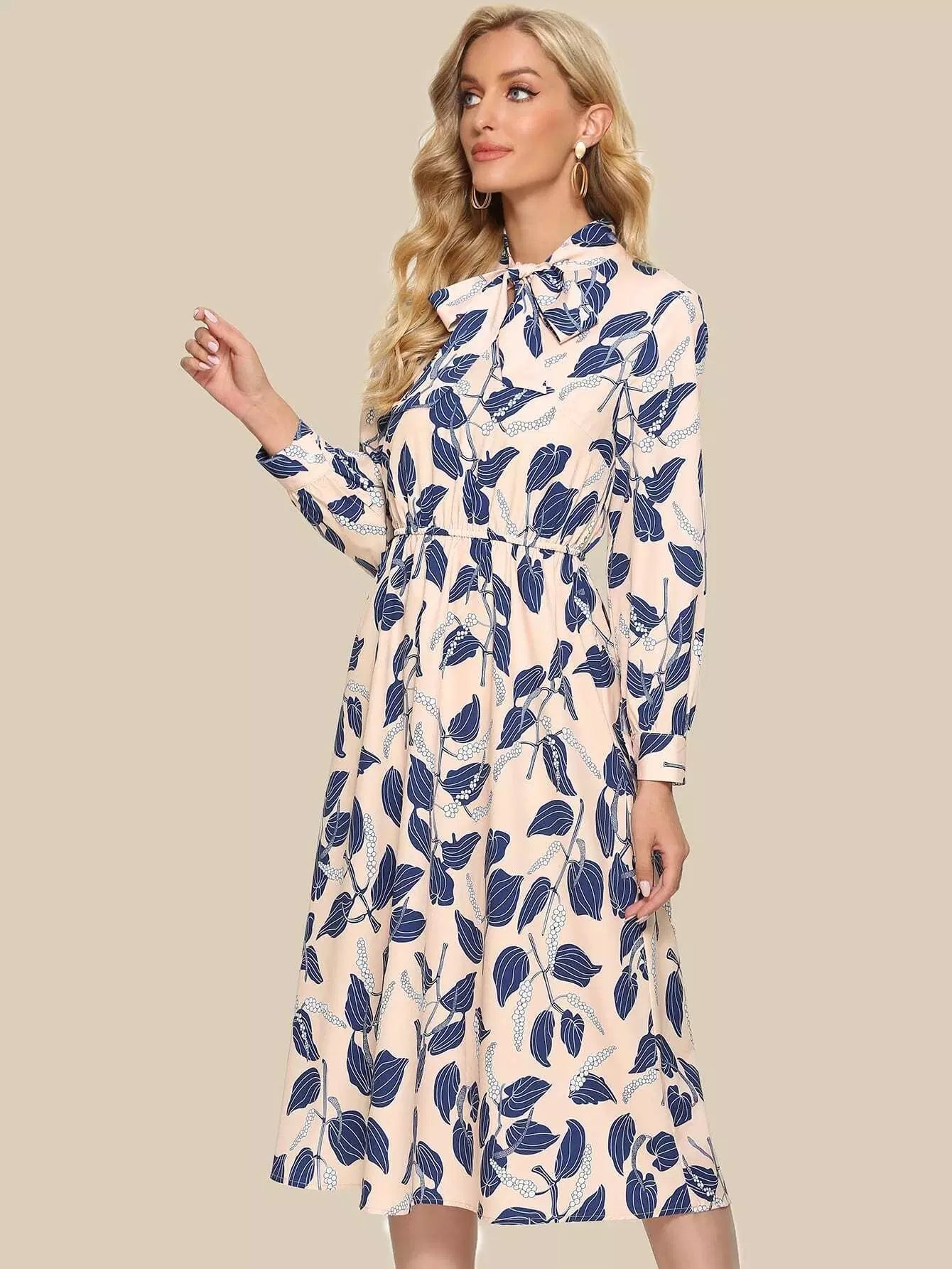 فستان بطبعة نباتات بربطة عنق على شكل ربطة عنق