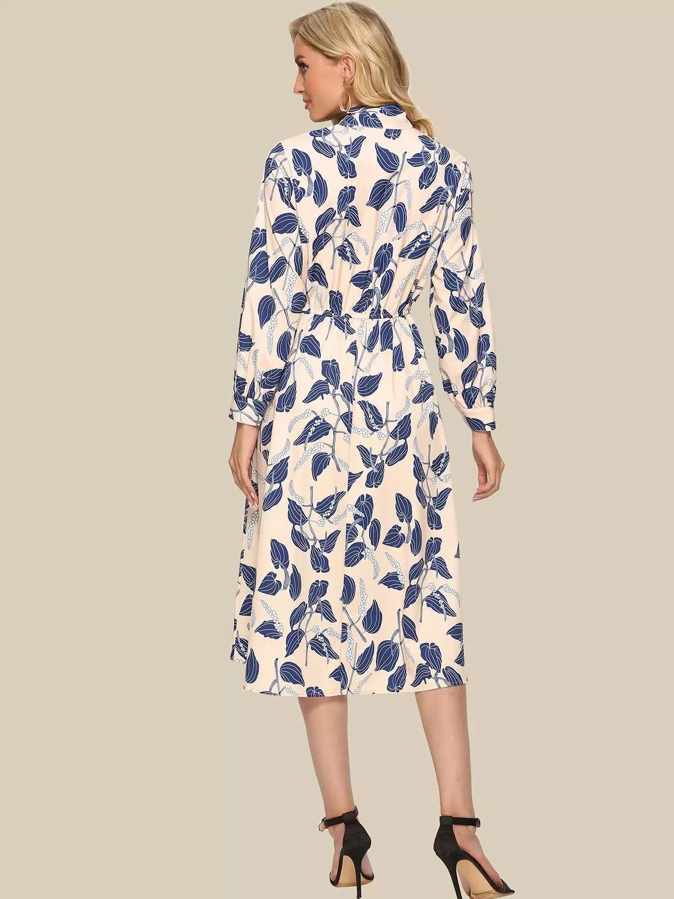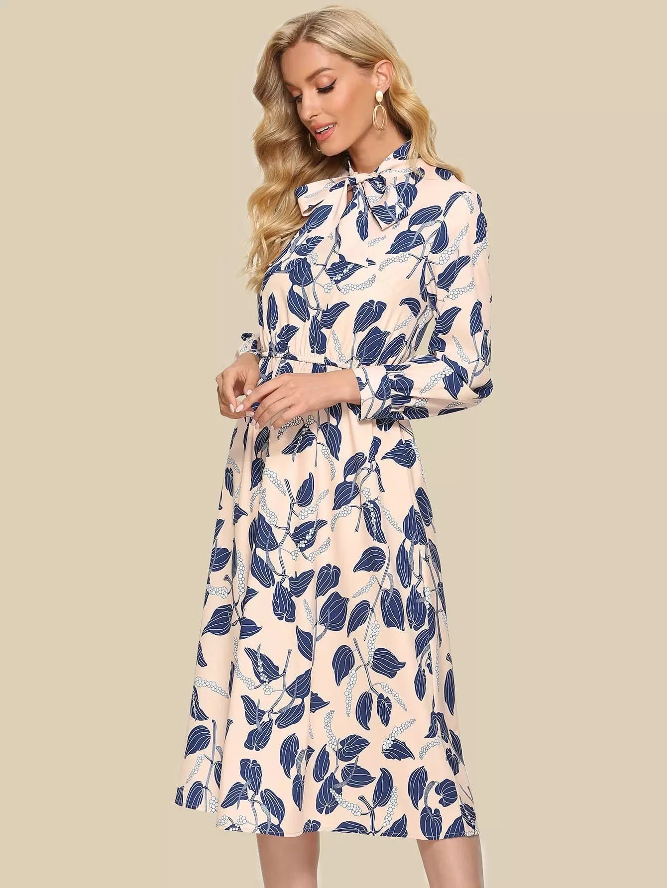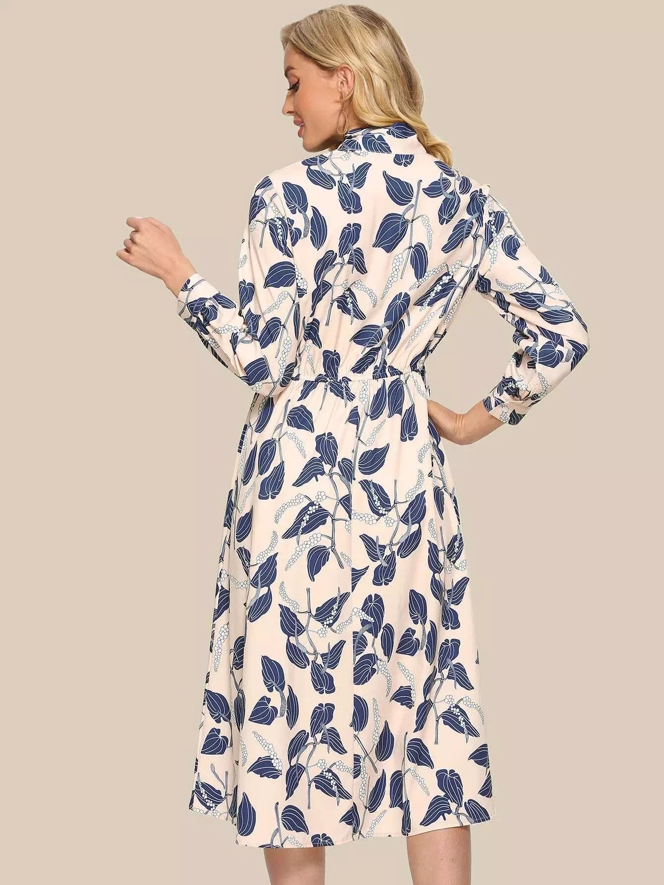 فستان بطبعة نباتات بربطة عنق على شكل ربطة عنق