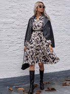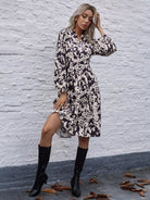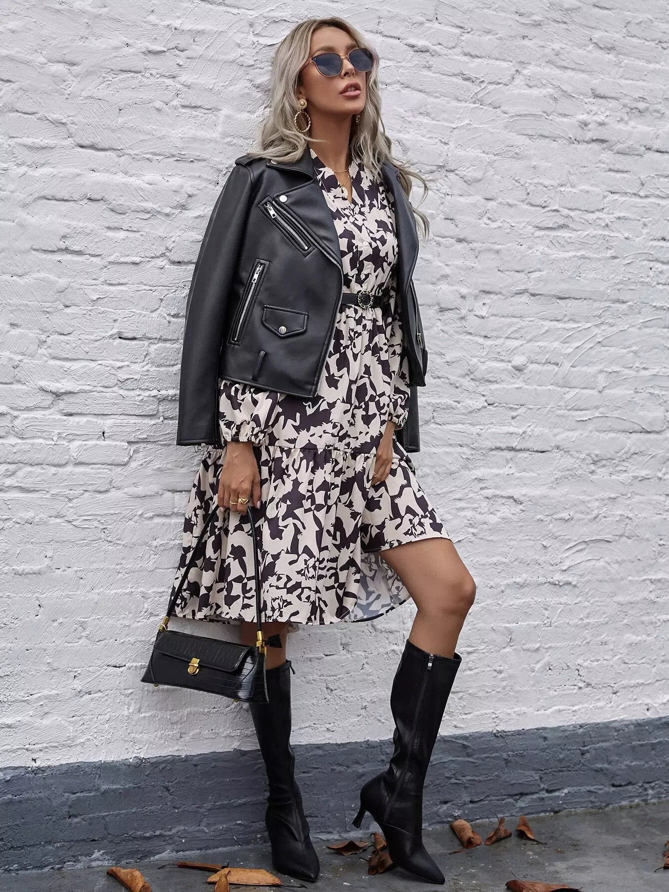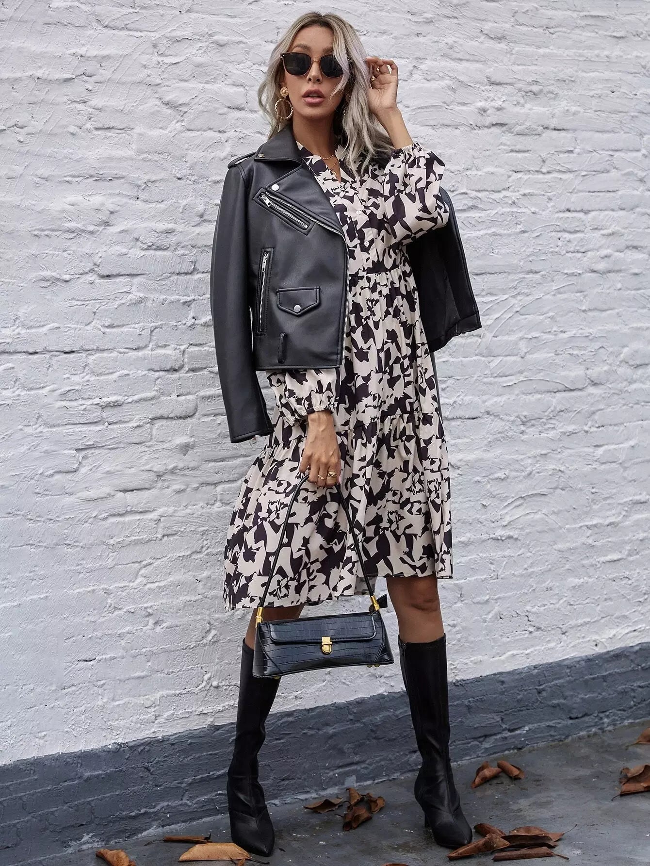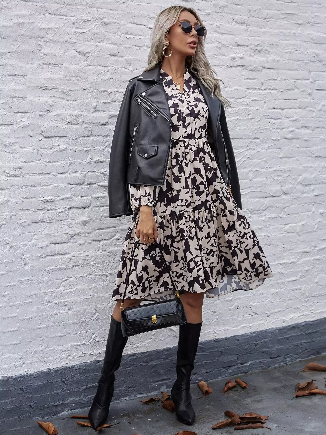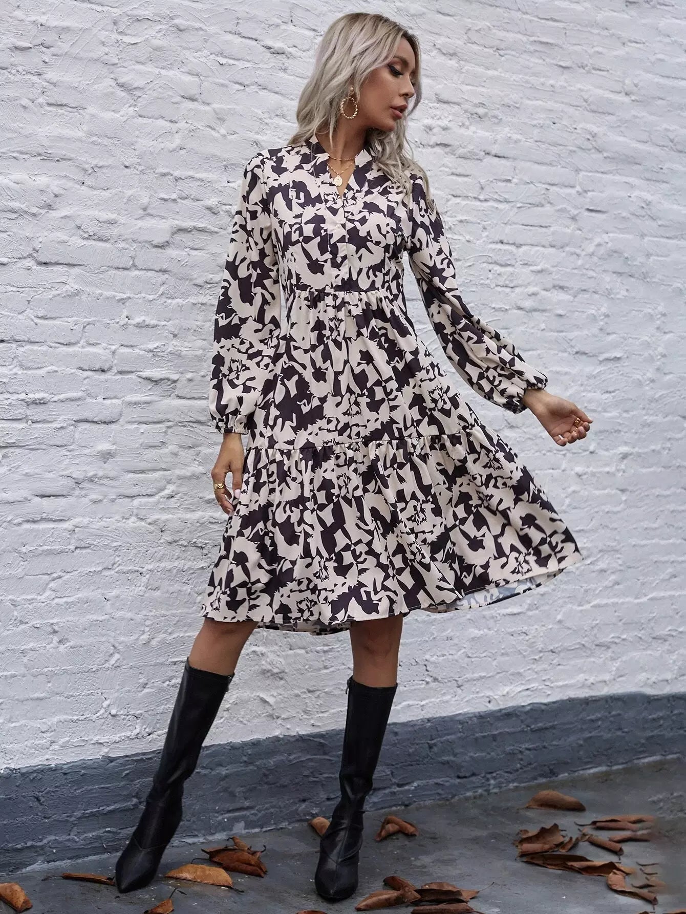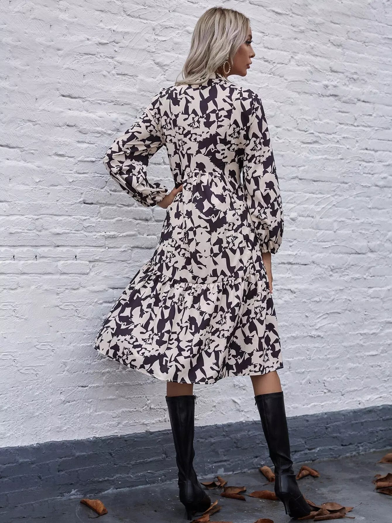 فستان برقبة مطبوع فوقها بالكامل بدون حزام