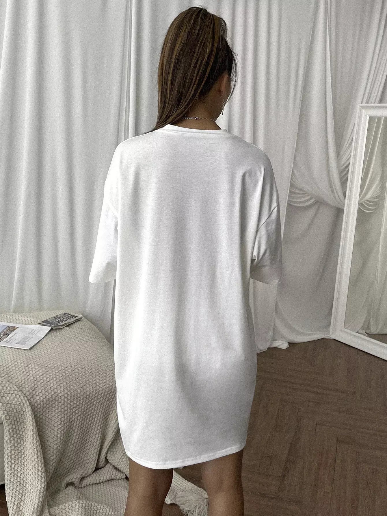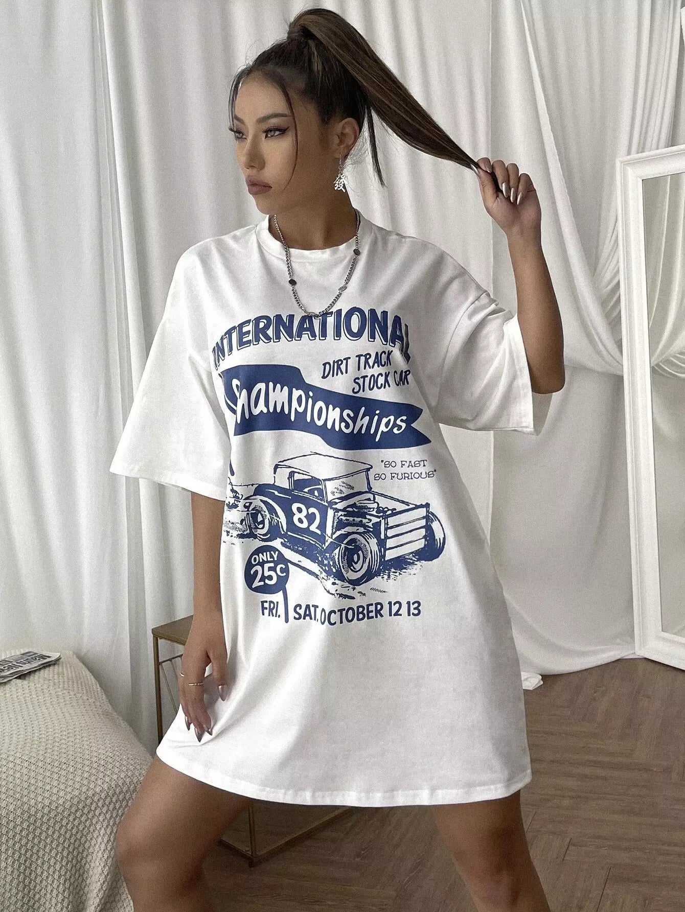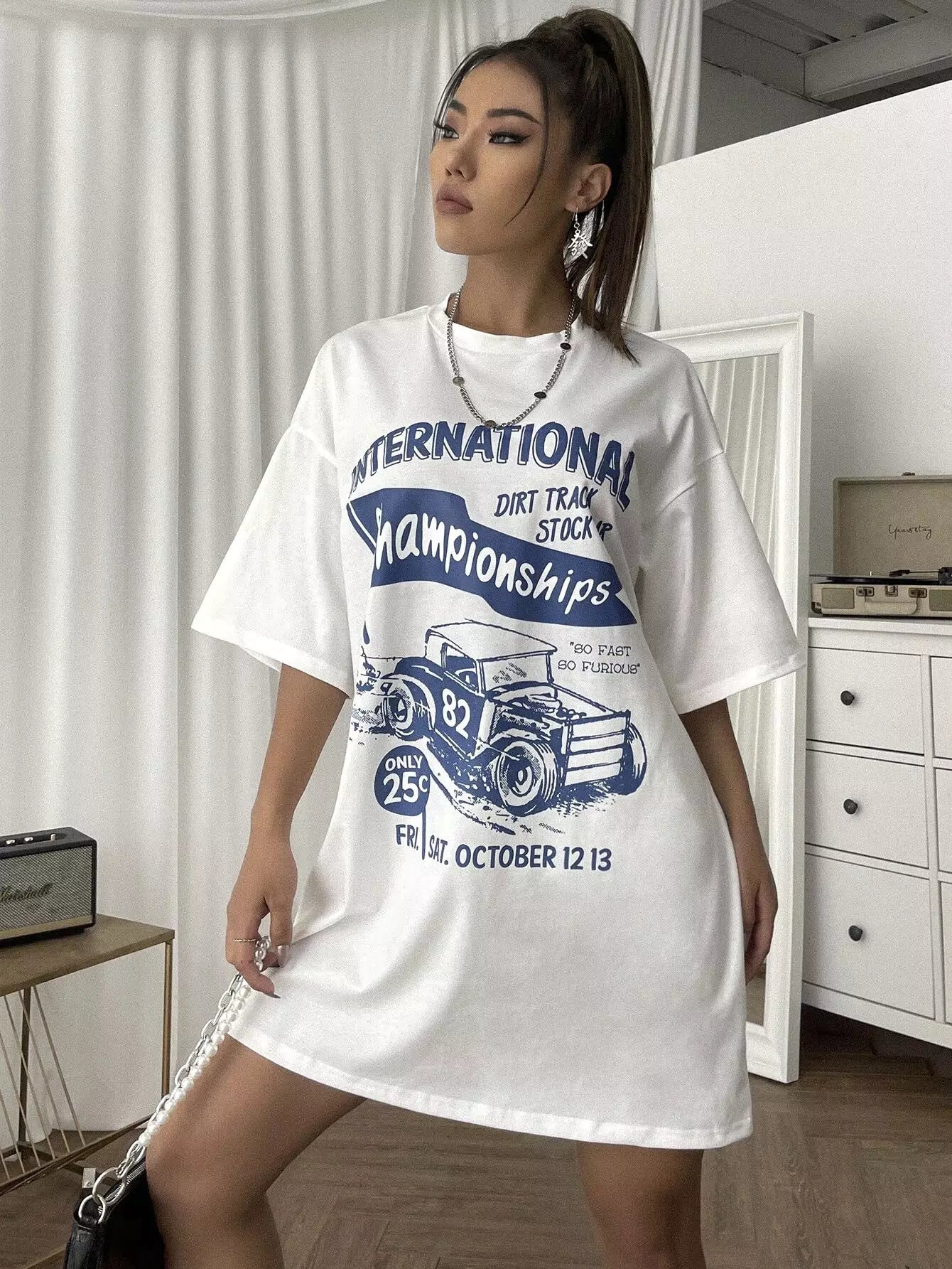 للنساء - فستان تي شيرت بأكتاف منسدلة برسومات سيارة وشعار