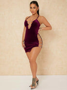 فستان كامي مخملي بقصّة مخملية بتفاصيل سلسلة