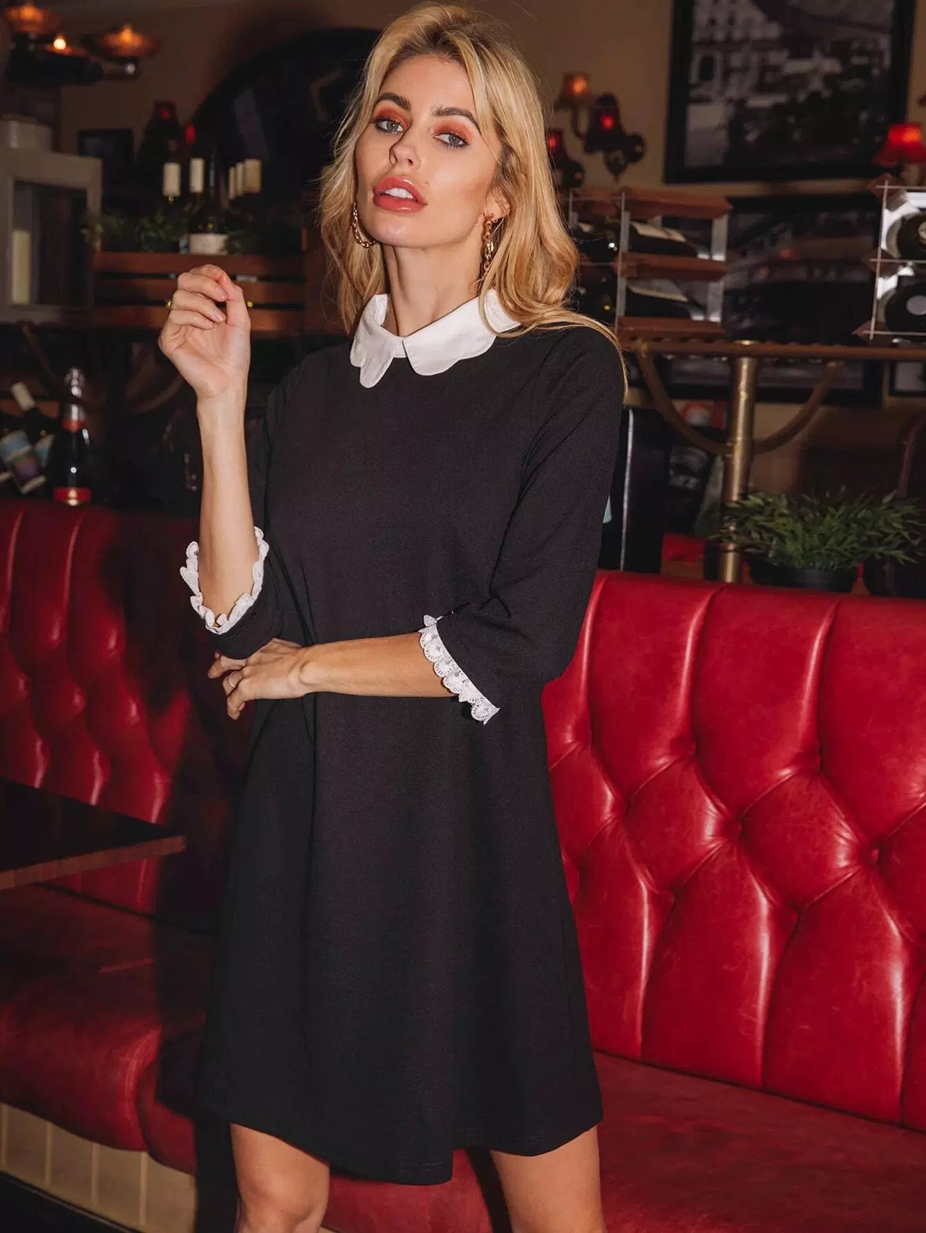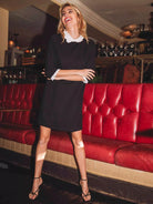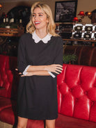 فستان بياقة بلون مغاير مطرز بأساور شبكية