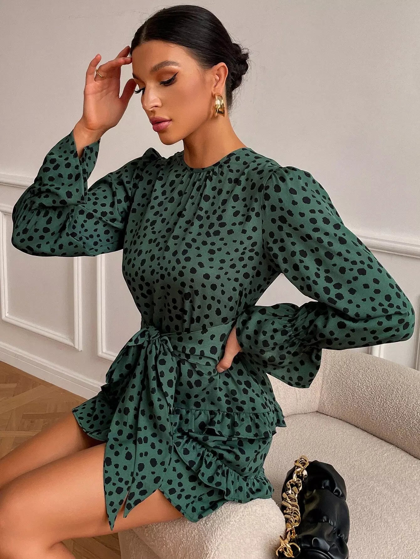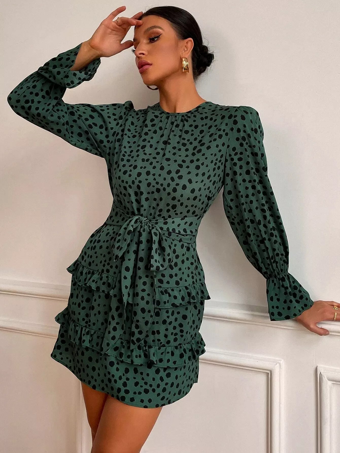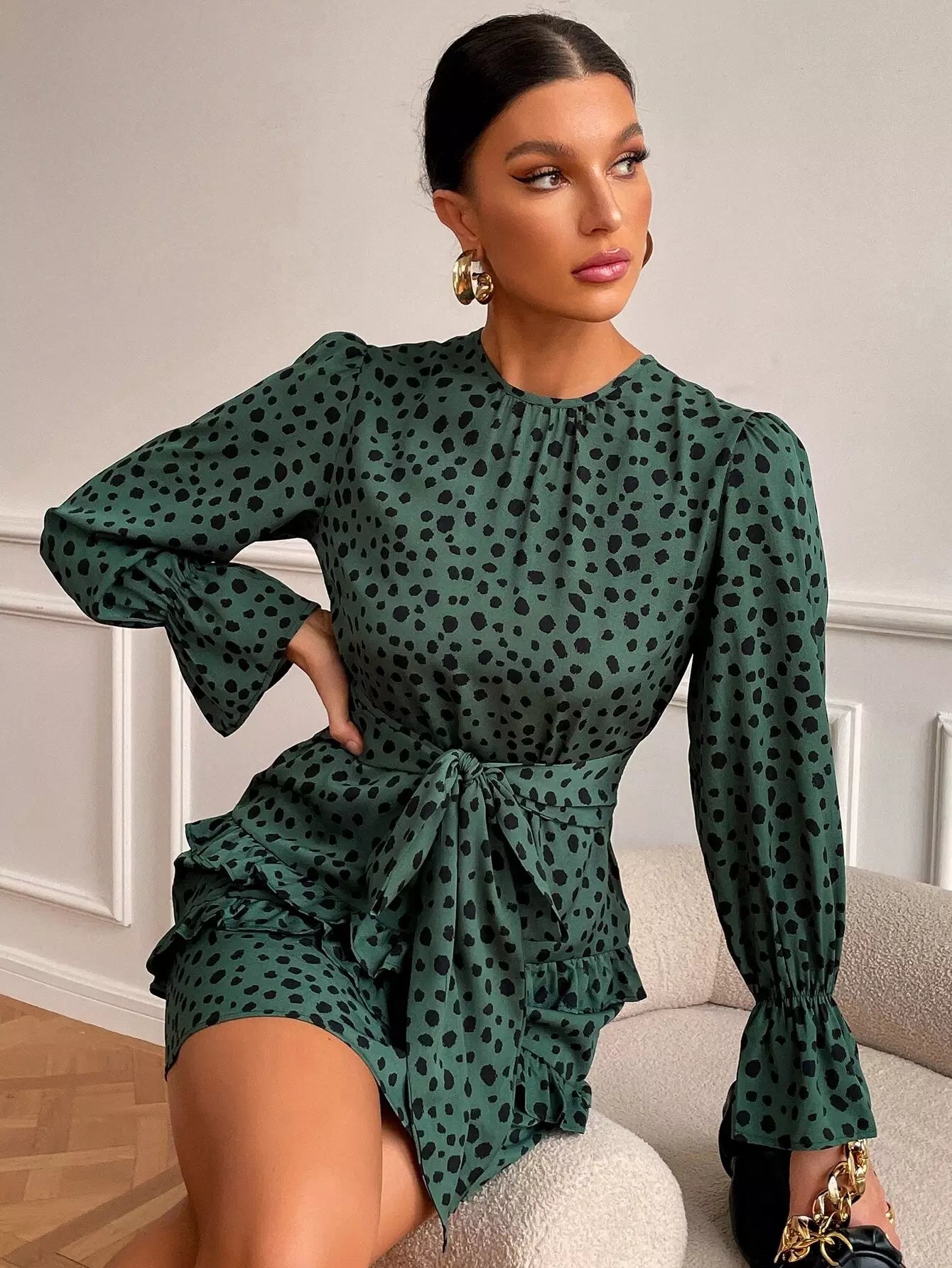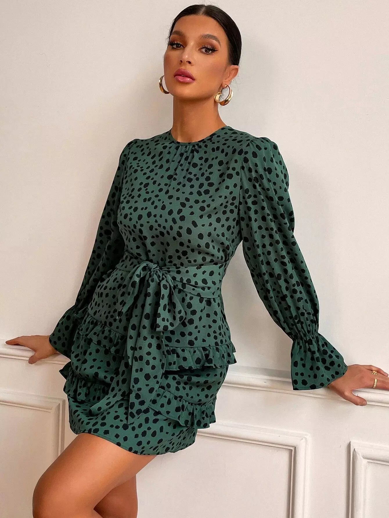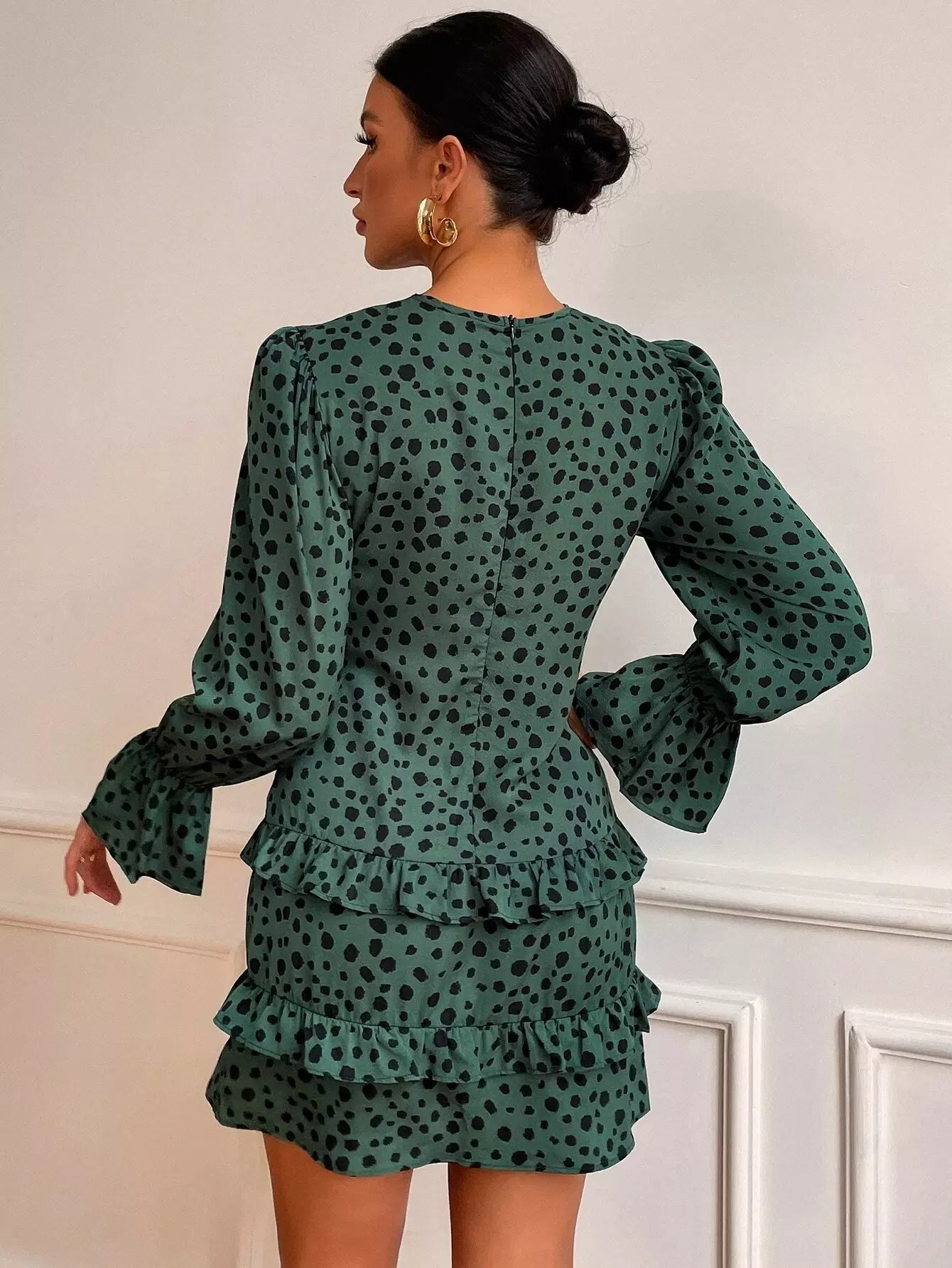 فستان بأكمام كشكش مطبوع بطبعة كلب مرقش بأكمام كشكش بحواف كشكش من الأمام