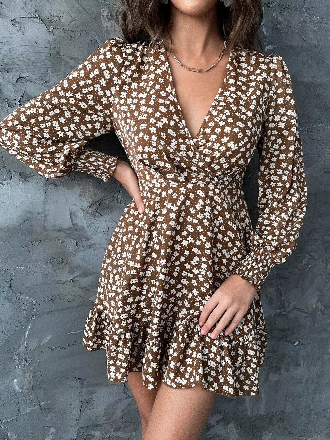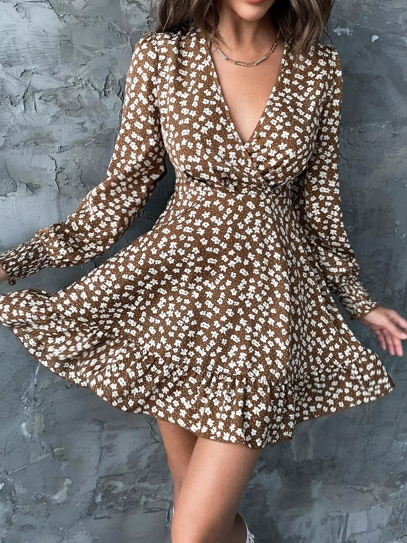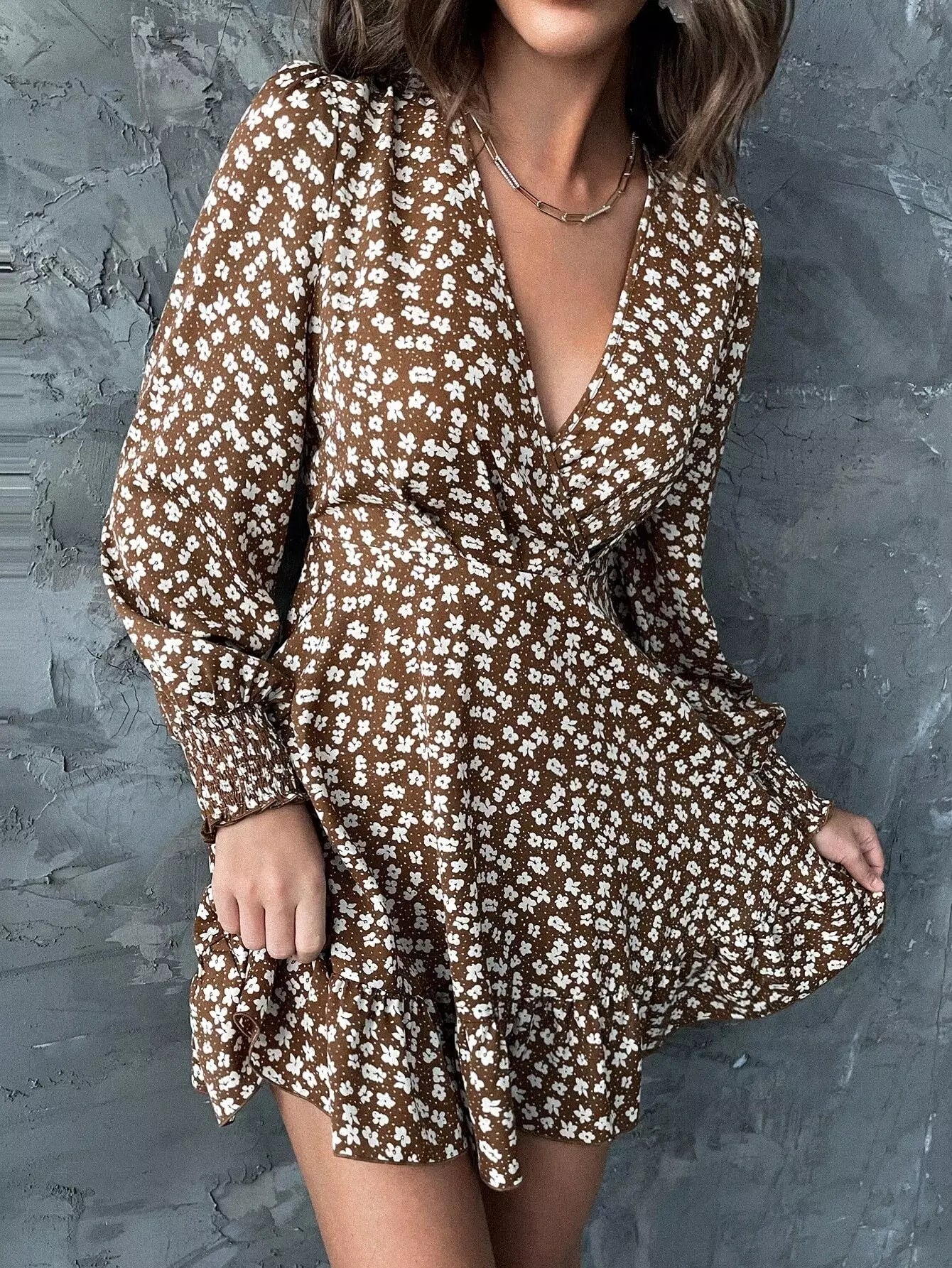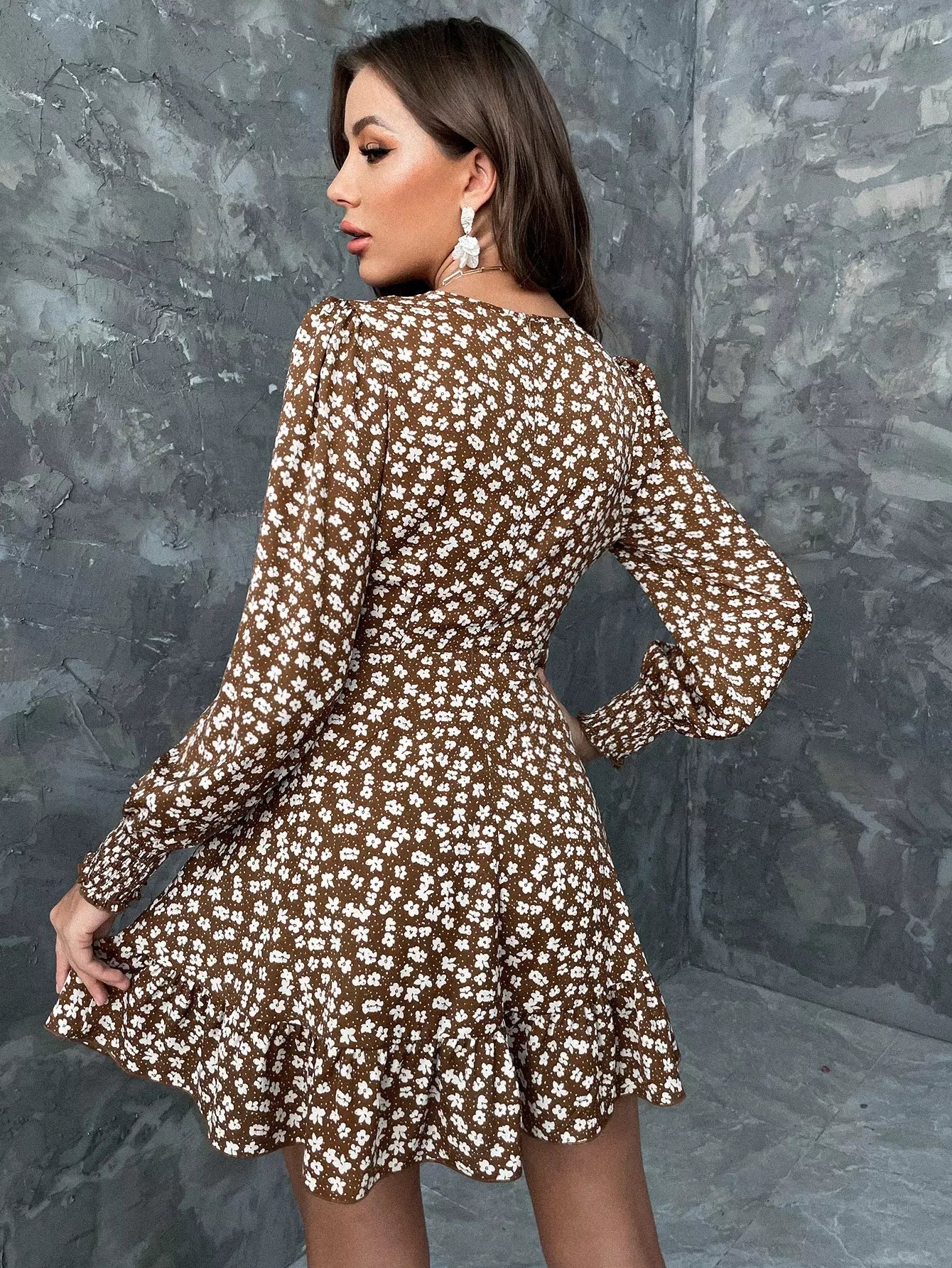 فستان ديتسي بطبعة زهور بياقة مكشكشة برقبة مكشكشة