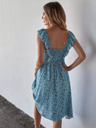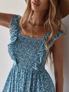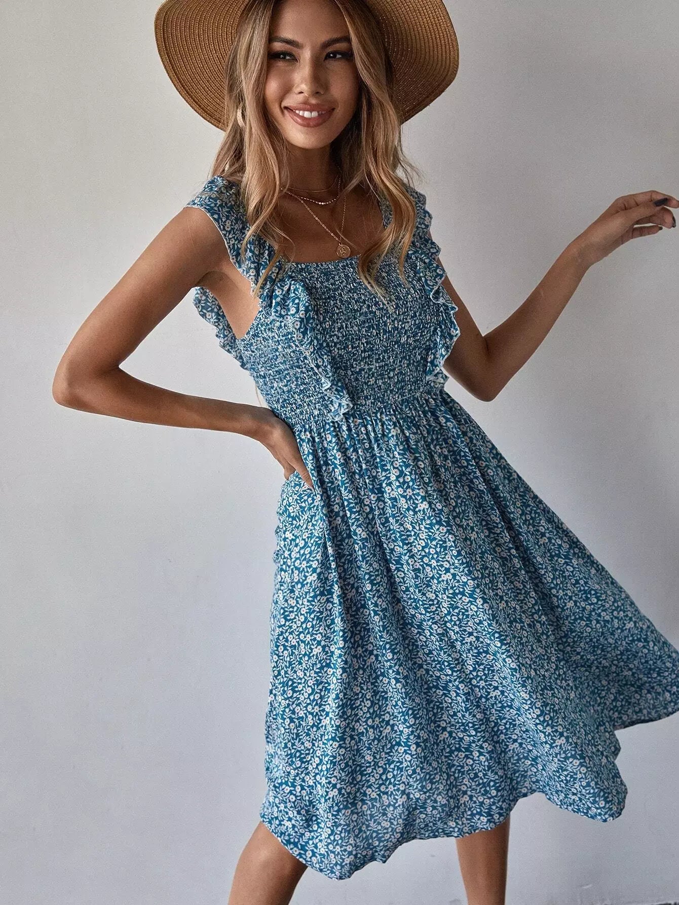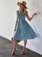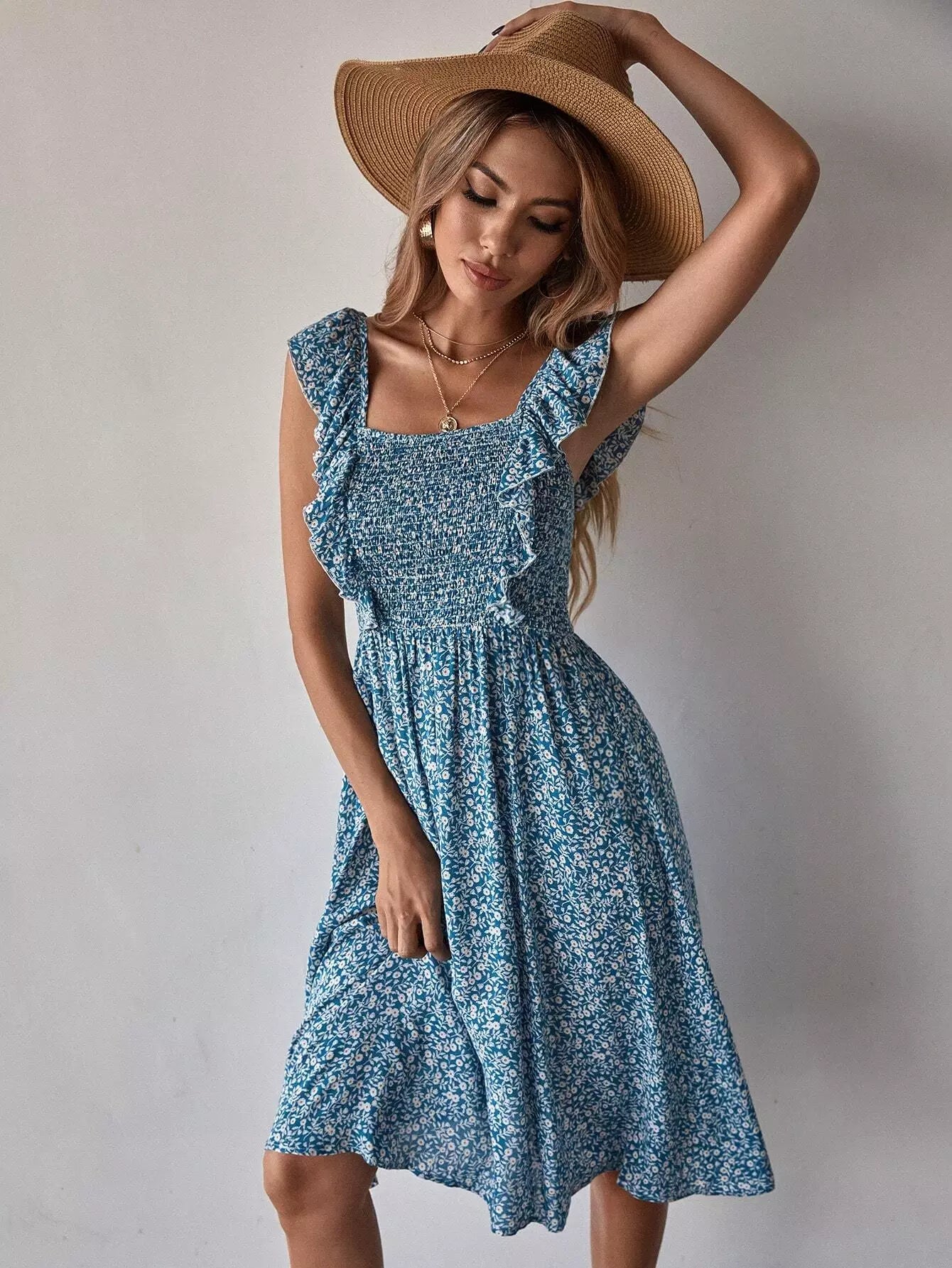 فستان زهري مزخرف بفتحة رقبة مربعة وحواف كشكش