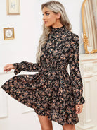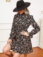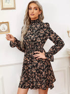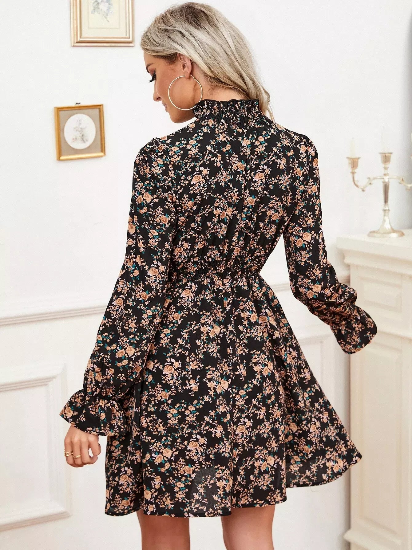 فستان بطبعة زهور وأكمام مكشكشة وخصر مجعد