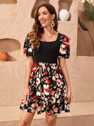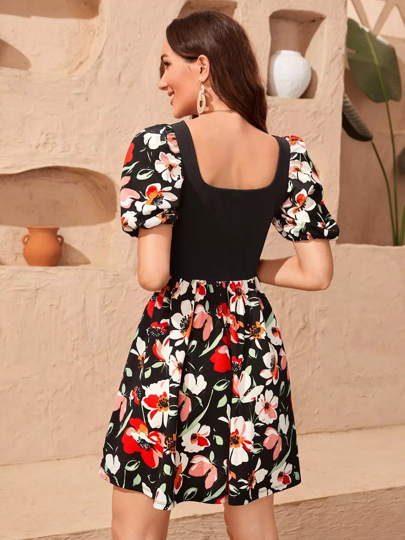 فستان بأكمام منفوشة برقبة مربعة زهرية