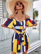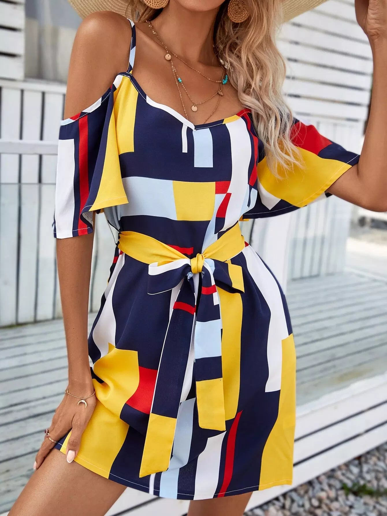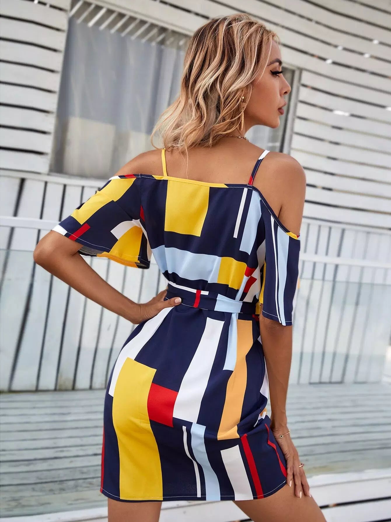 فستان بأكتاف مكشوفة وطبعة جغرافية بدون حزام