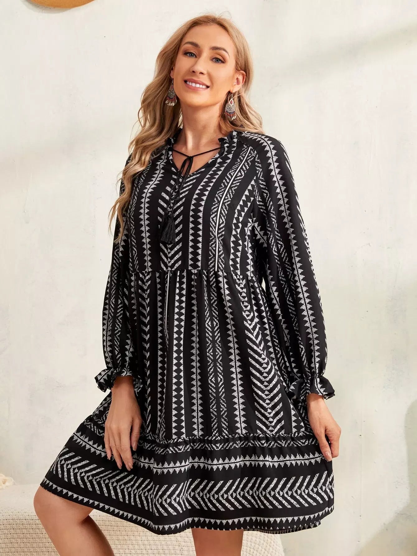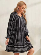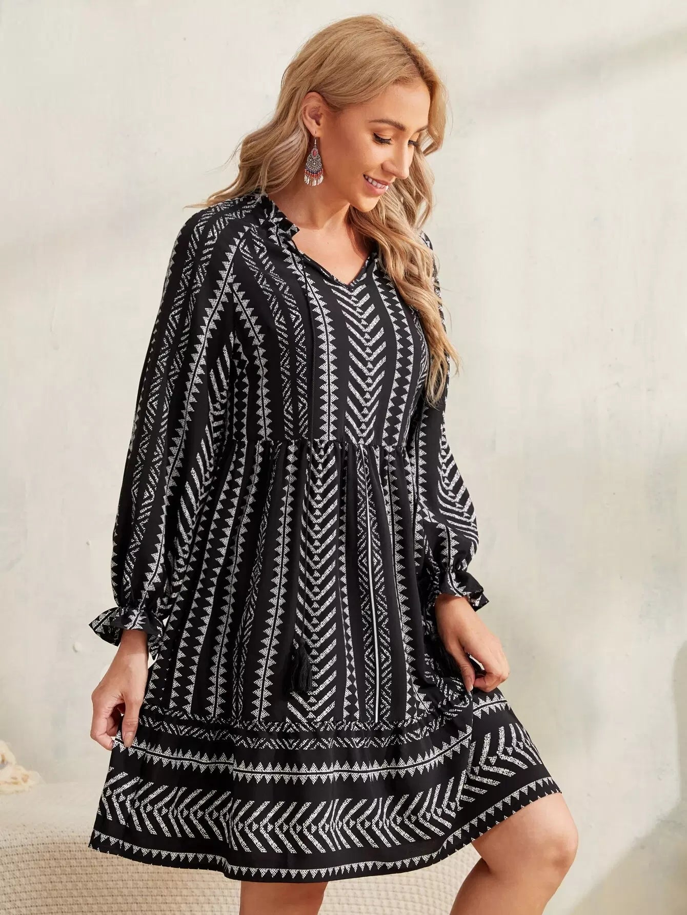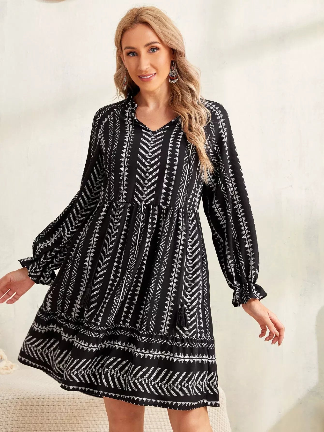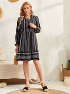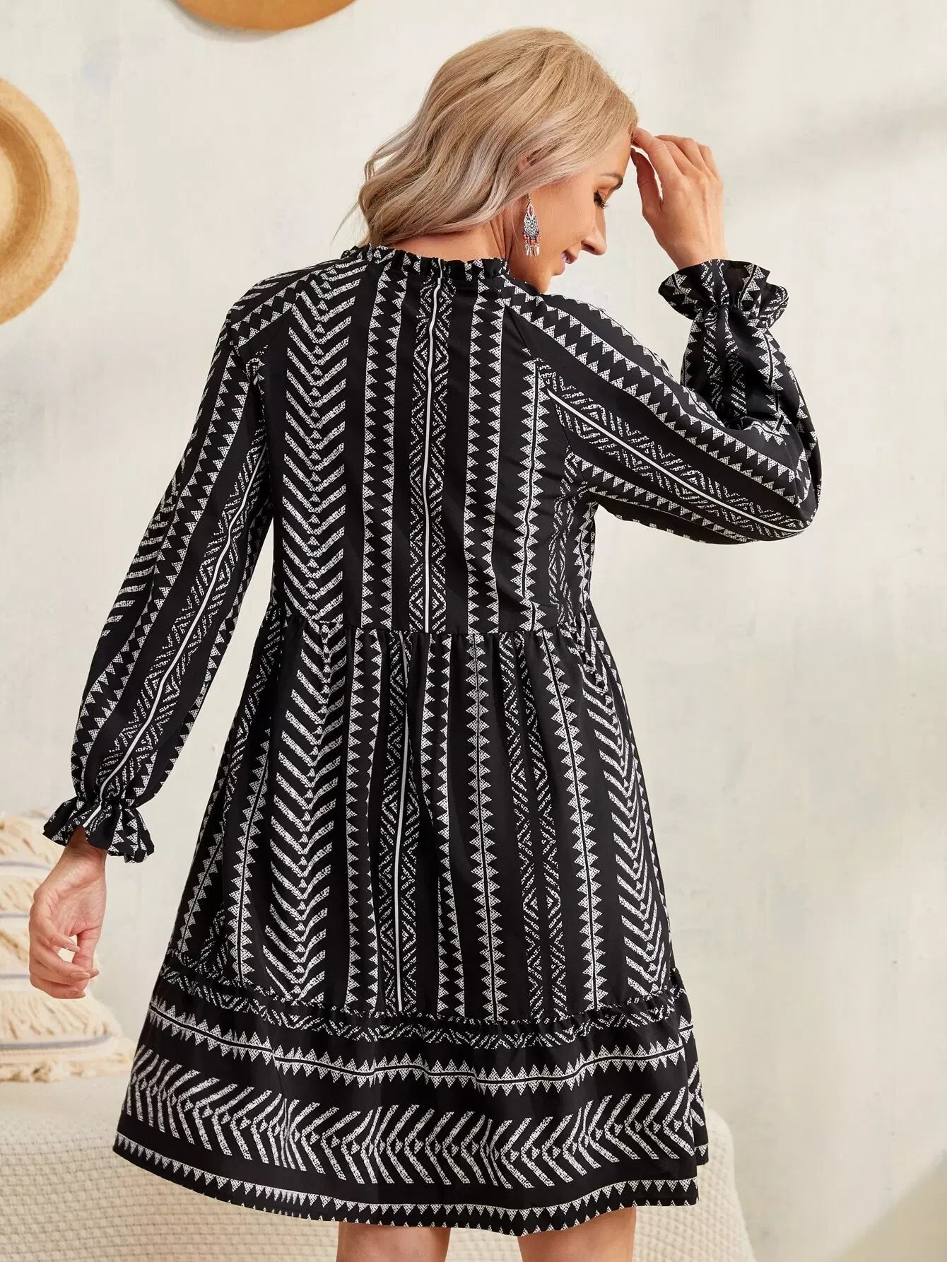 فستان بطبعة هندسية مع رباط على الخصر وأكمام مكشكشة وحواف مكشكشة