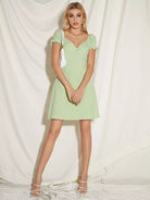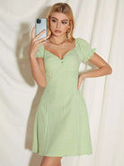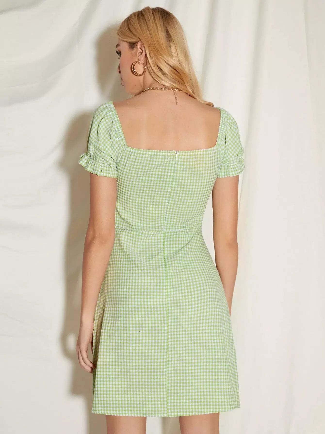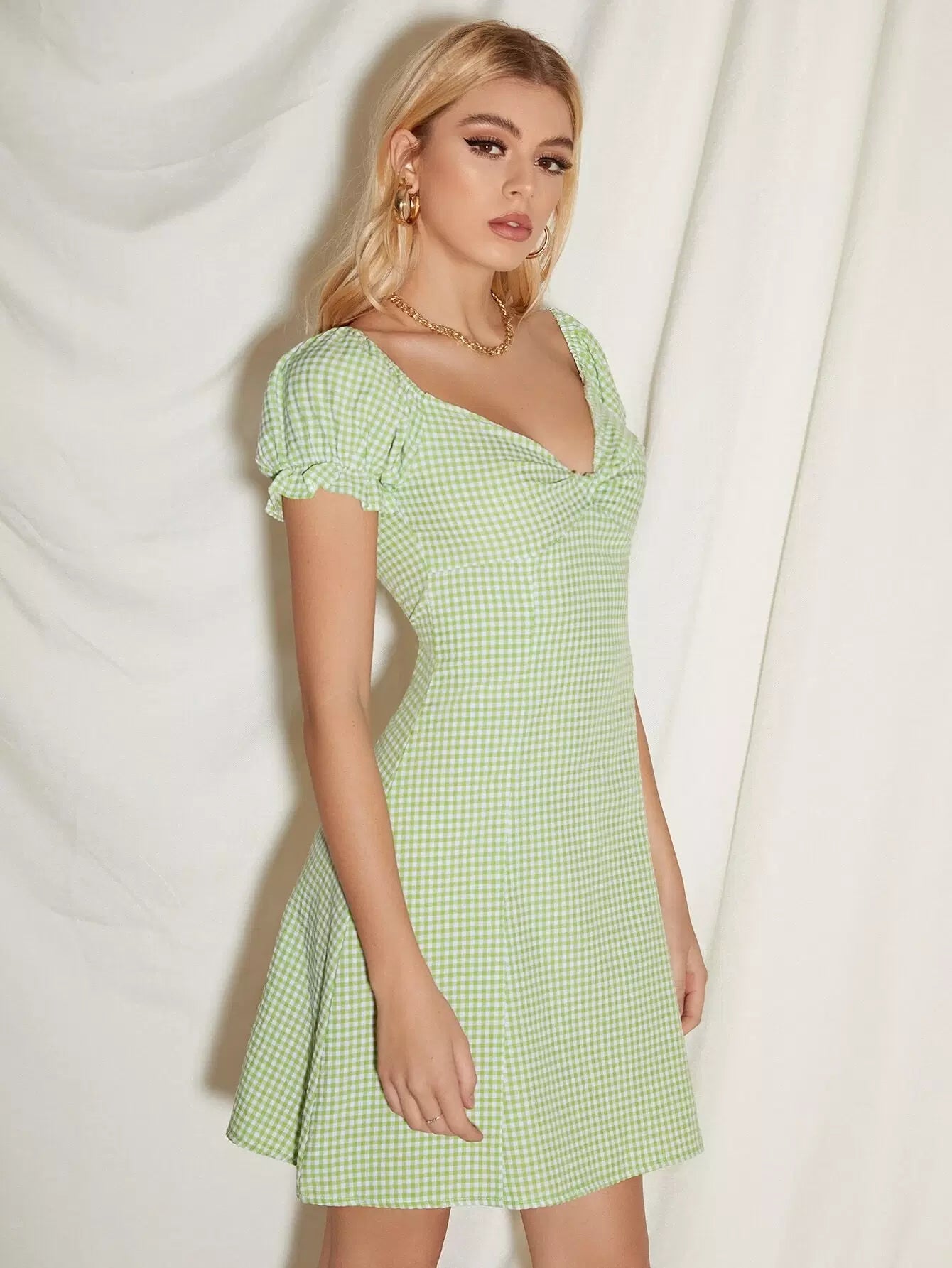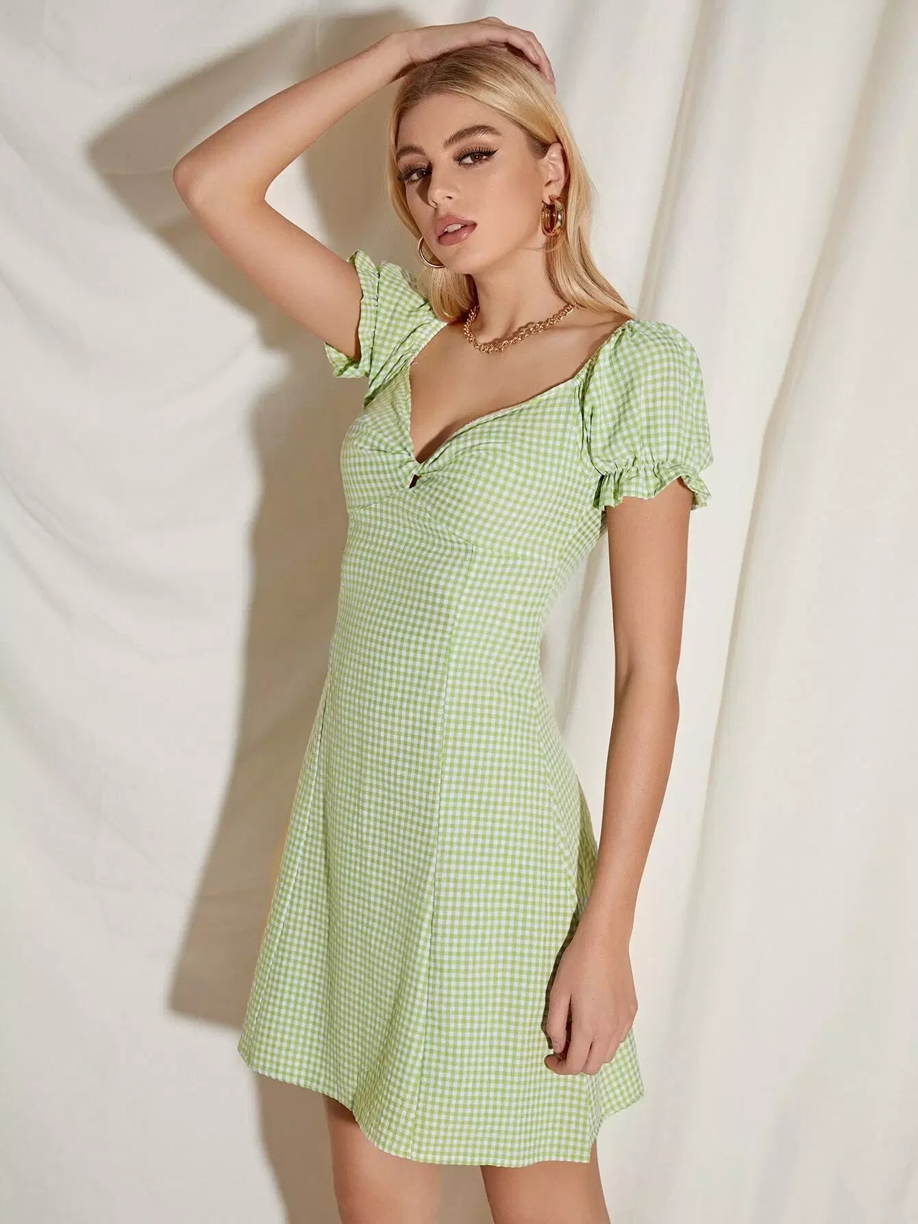 للنساء - فستان بفتحة عنق على شكل قلب وأكمام منتفخة من القماش القطني