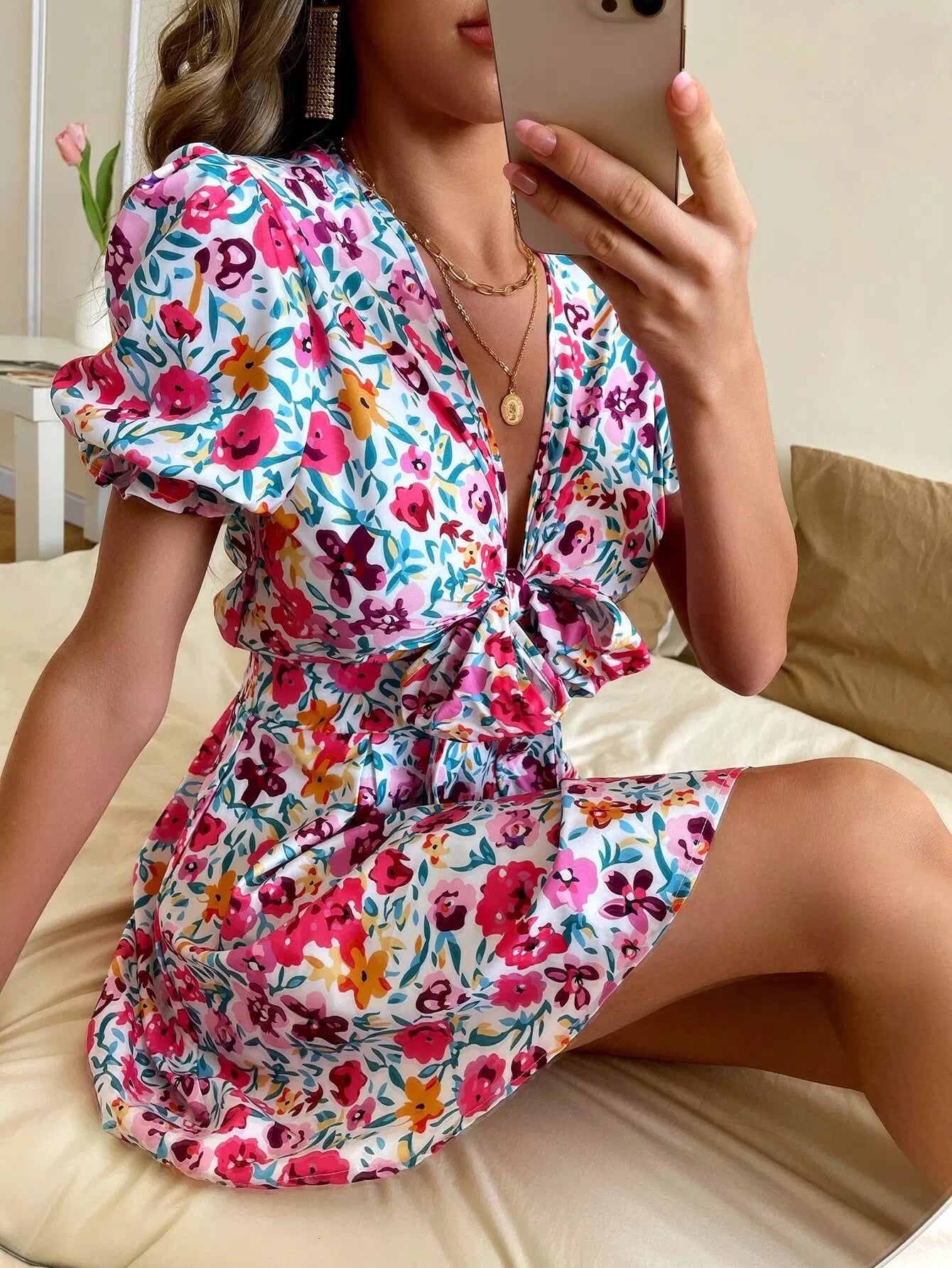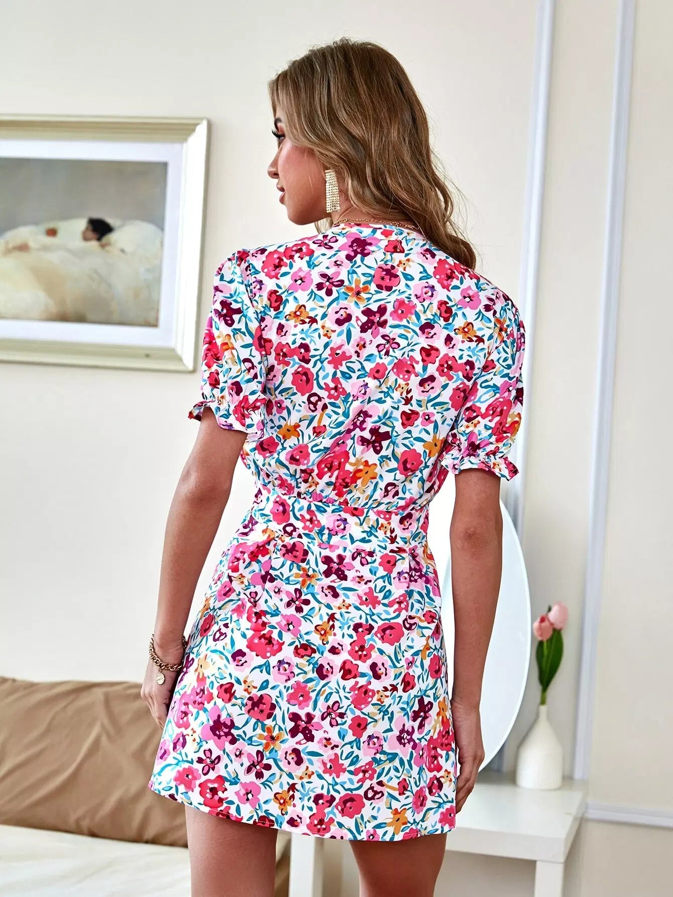 فستان بفتحة رقبة أمامية بفتحة رقبة مكشوف من الأمام بفتحة رقبة واسعة فوق الزهور