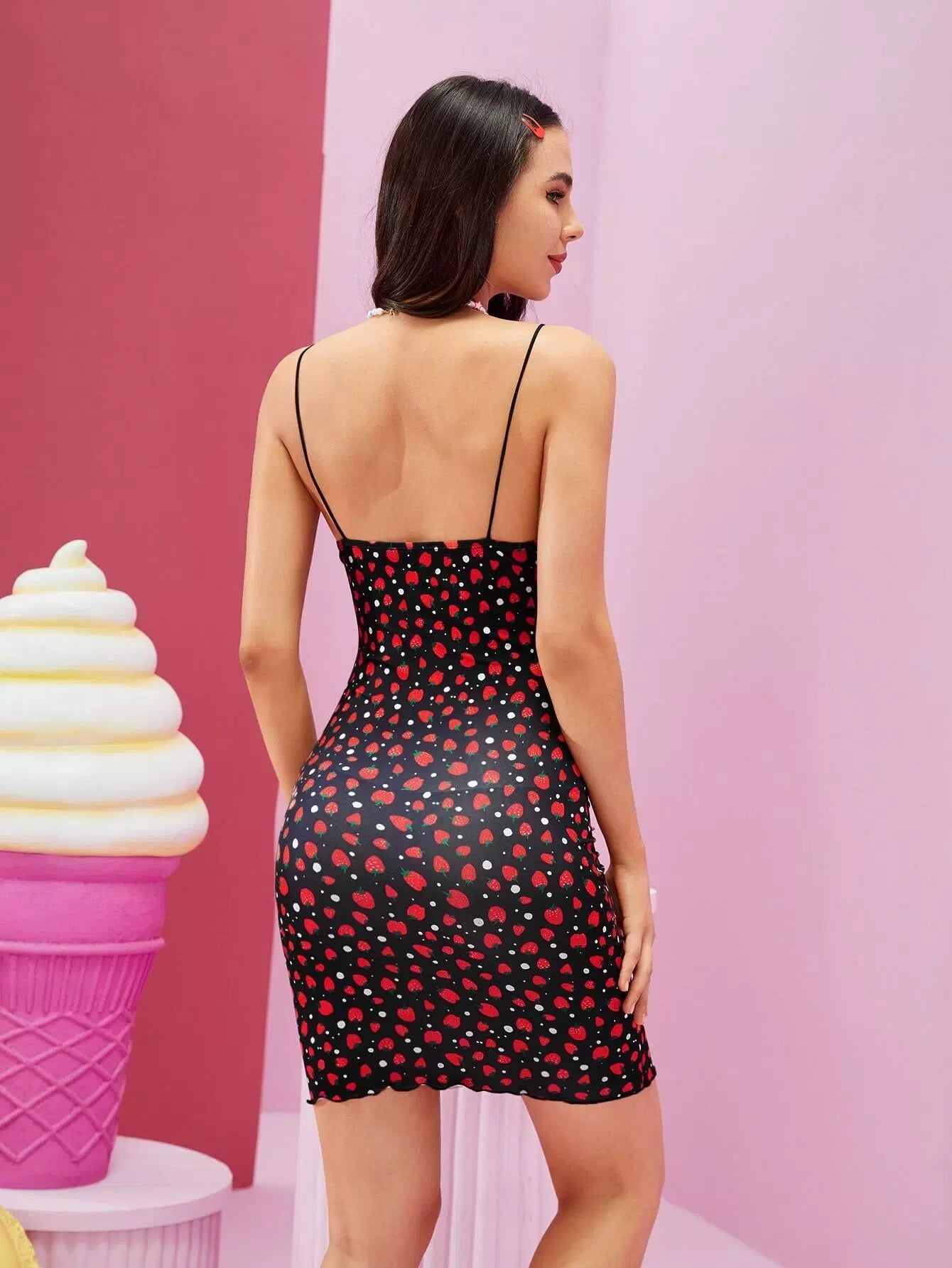 فستان من الدانتيل مطبوع بطبعة فراولة مزركشة بالدانتيل