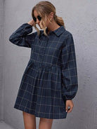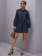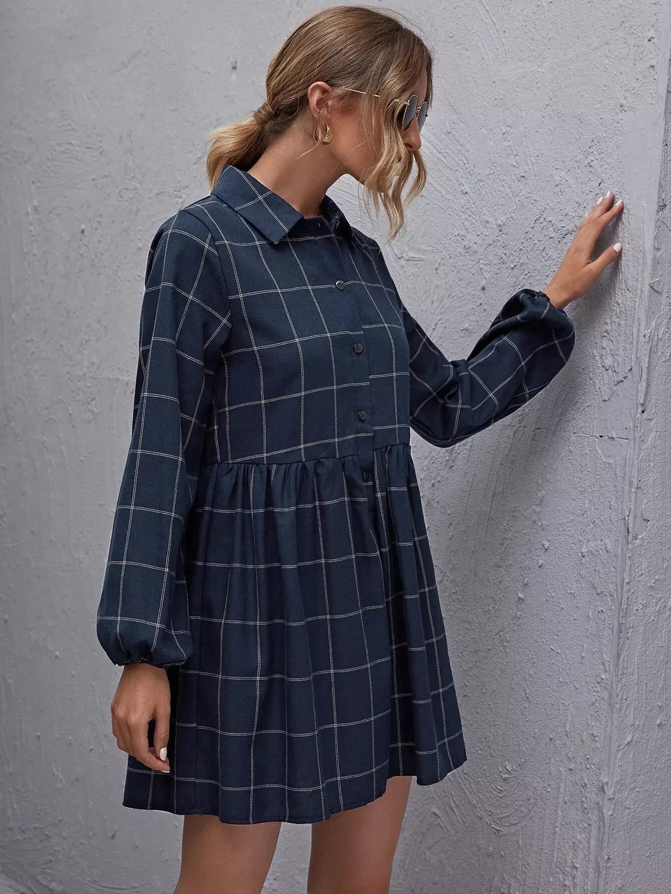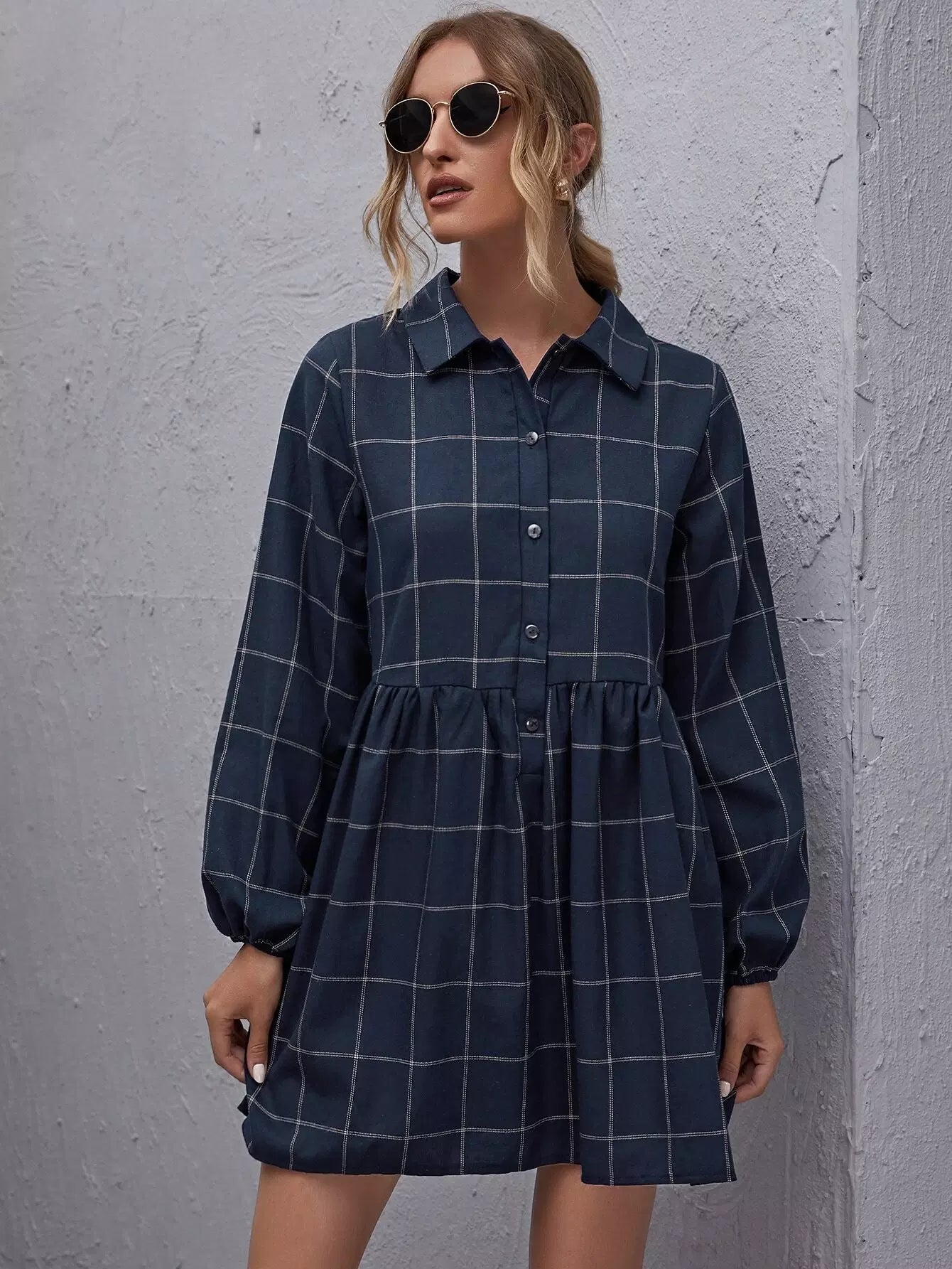 فستان بأكمام فانوس بأزرار أمامية منقوشة بأزرار منقوشة