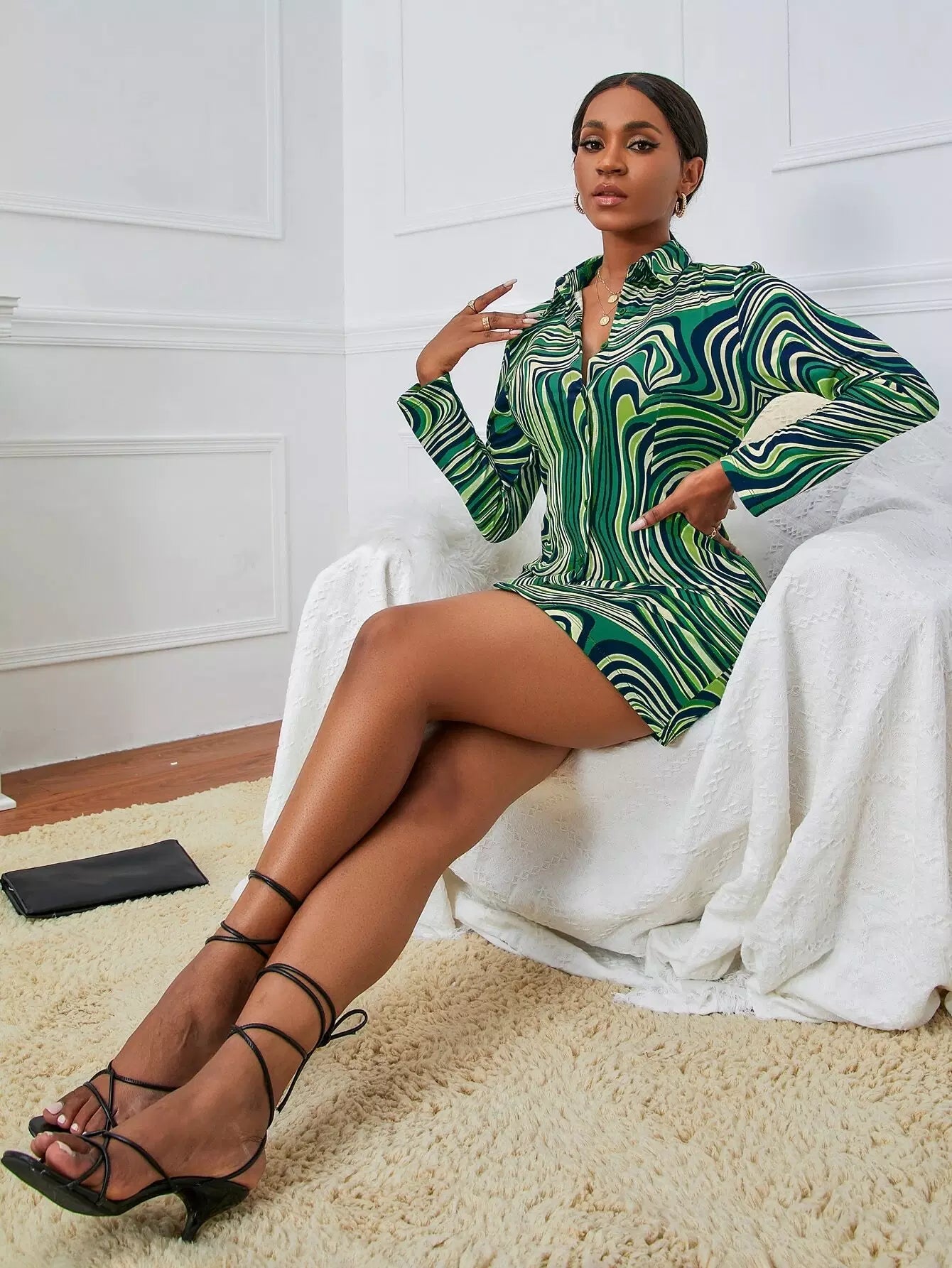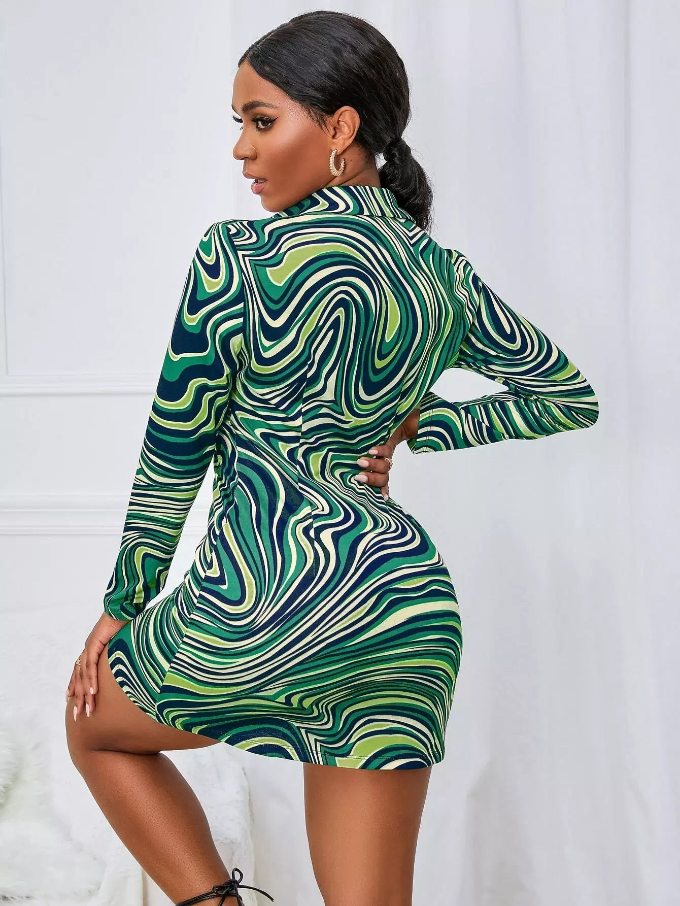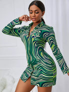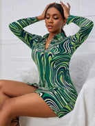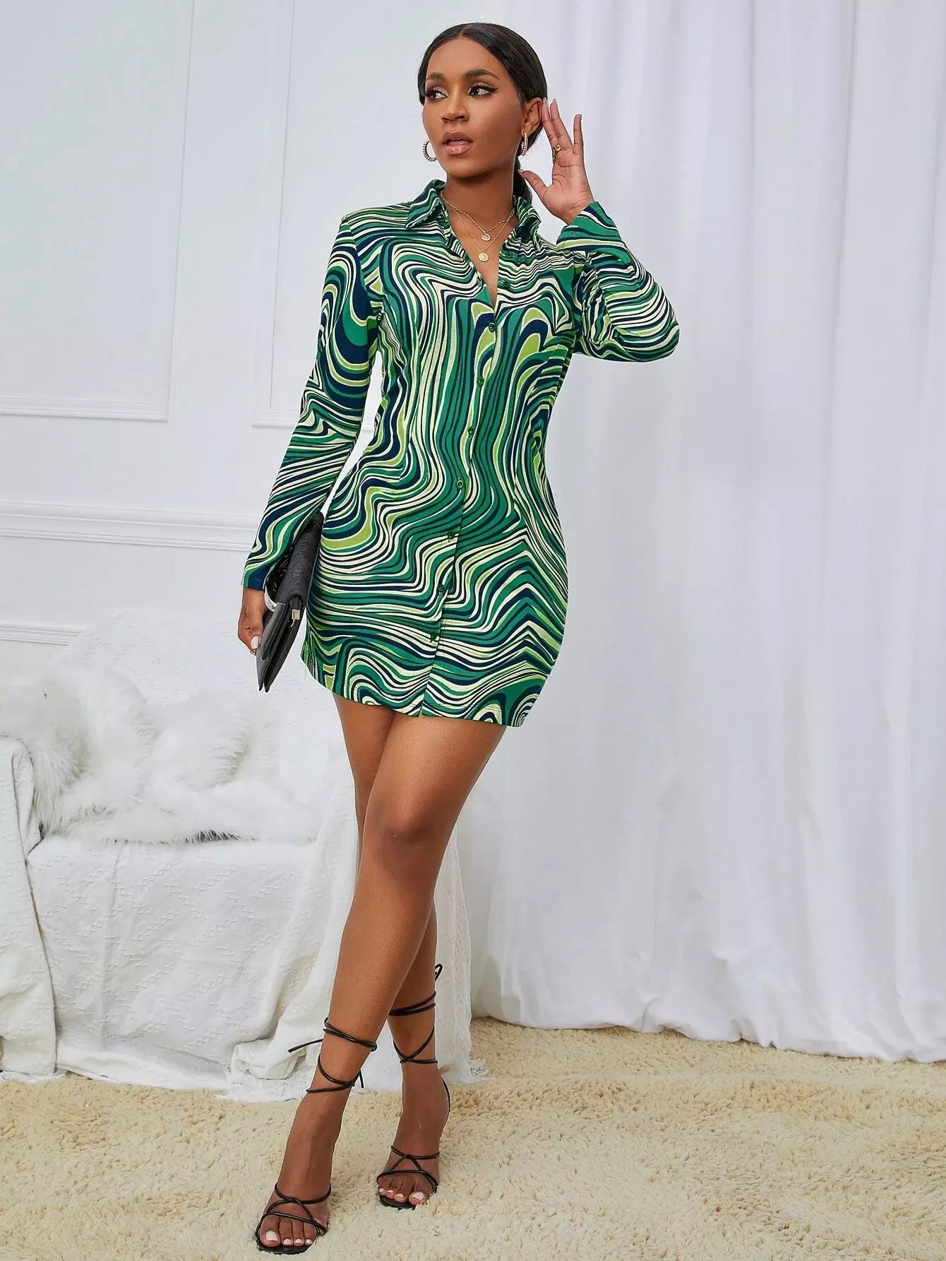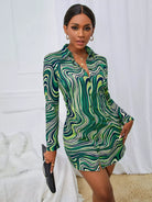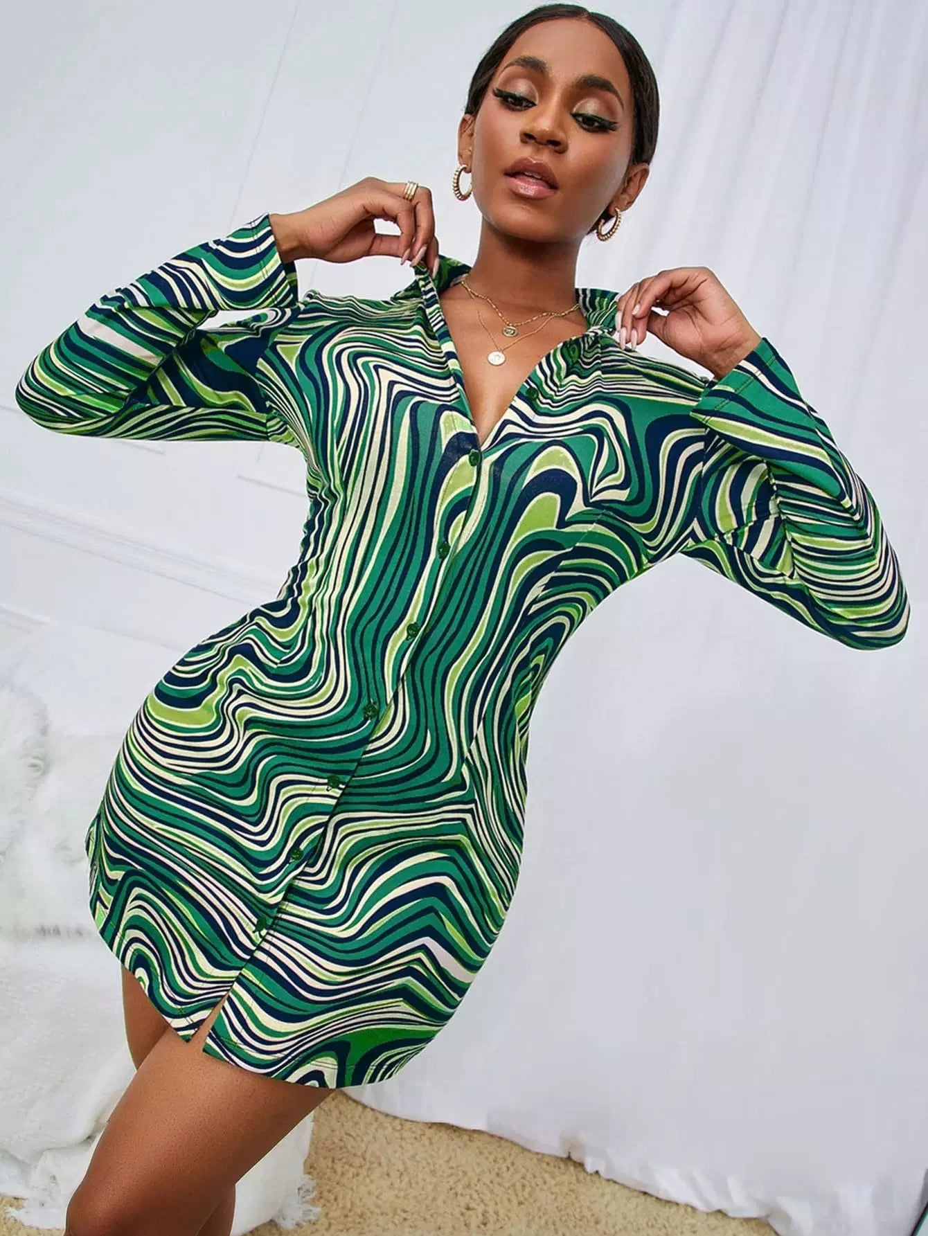 فستان بنقشة رخام بطبعة رخام بأزرار فوق الساقين
