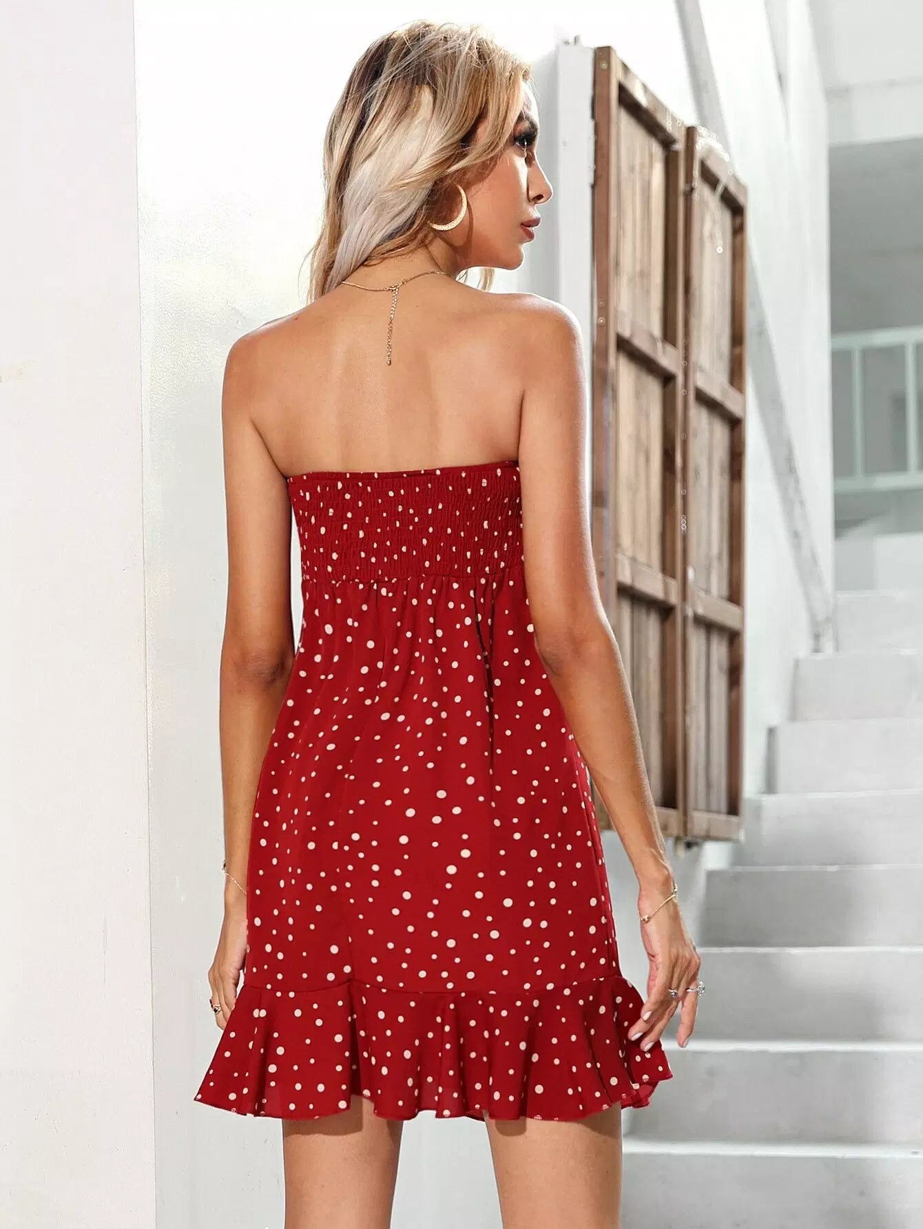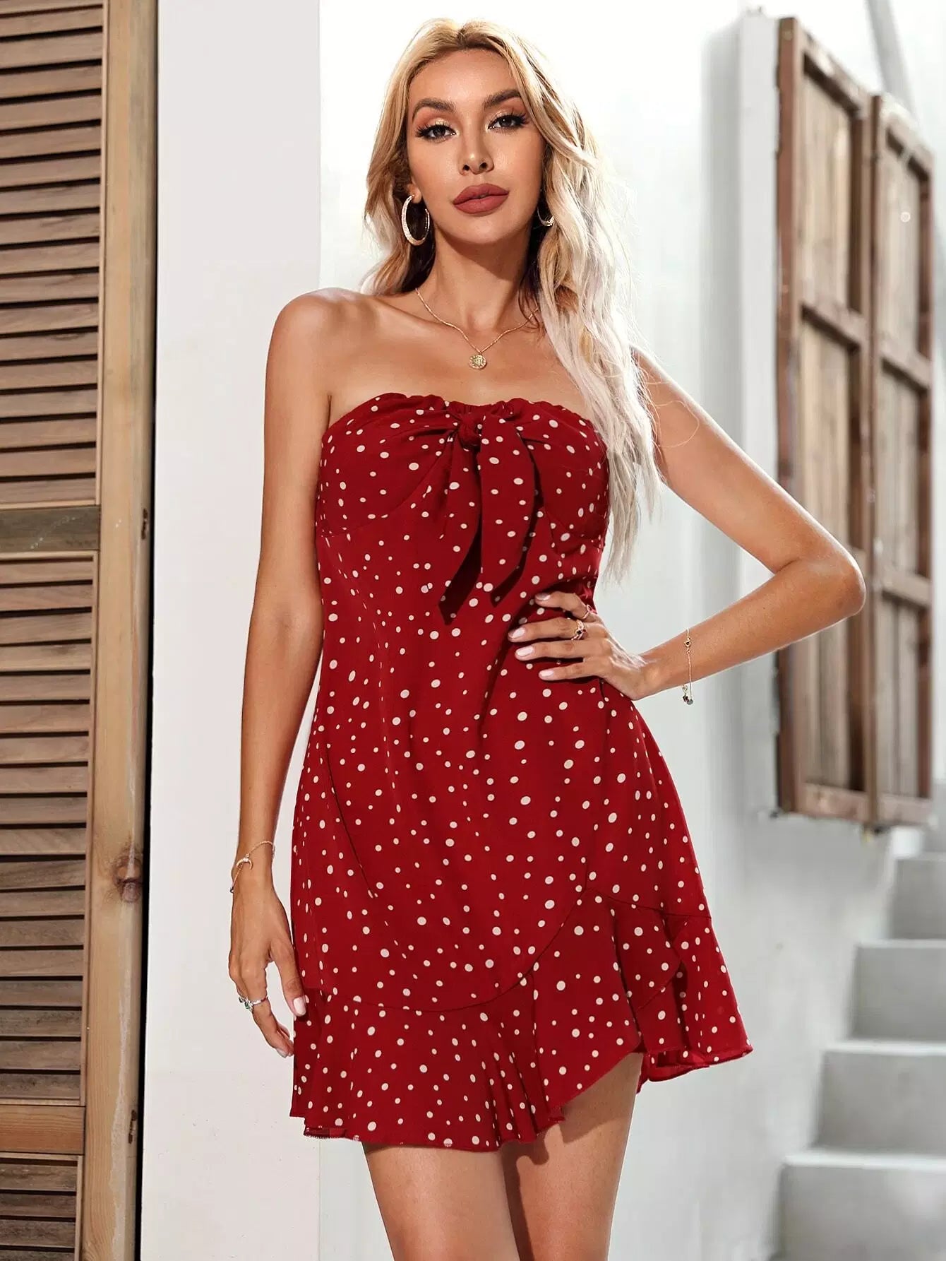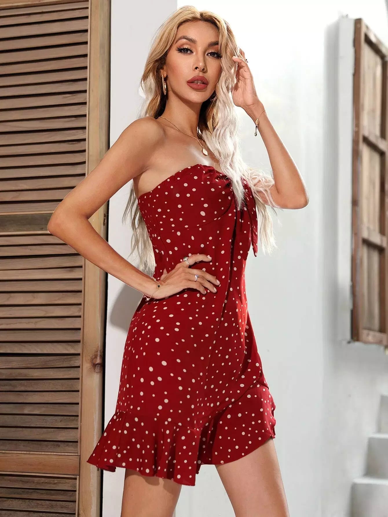 فستان أنبوبي منقّط منقّط بعقدة على الصدر وكشكش على الحافة