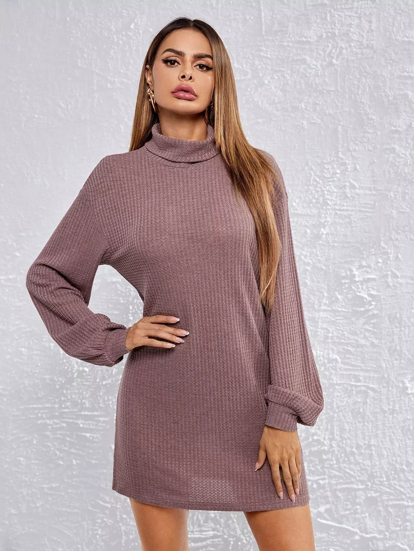 فستان تي شيرت محبوك بفتحة رقبة ملفوفة وأكمام فانوس