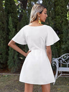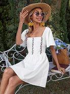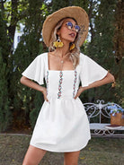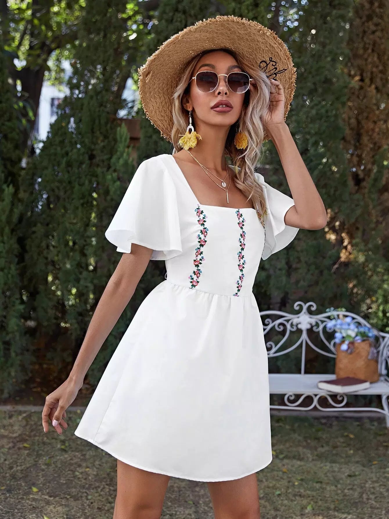 فستان بأكمام مربعة برقبة مربعة وتطريزات زهور على شكل فراشة