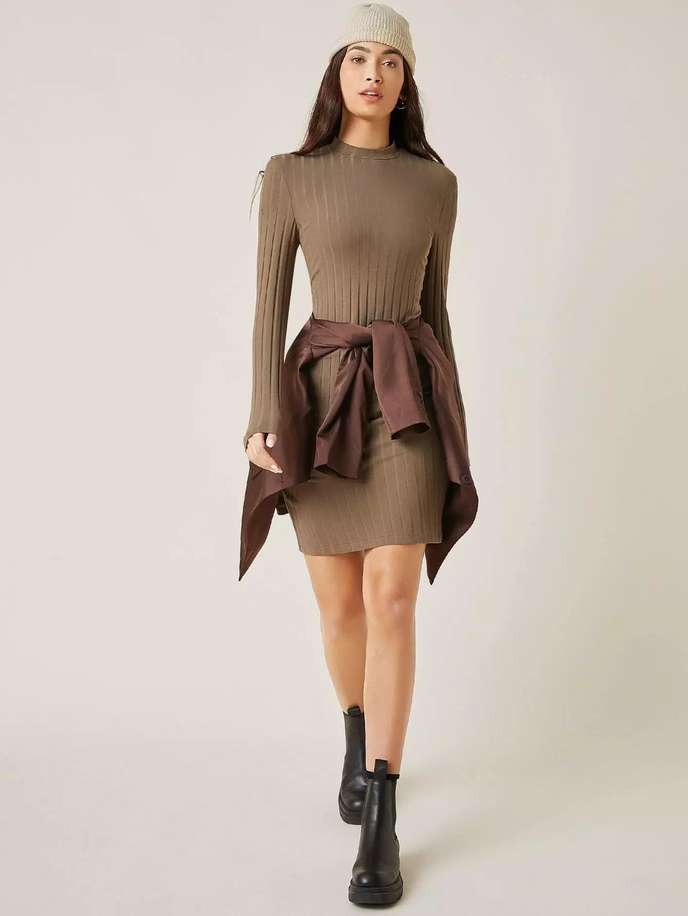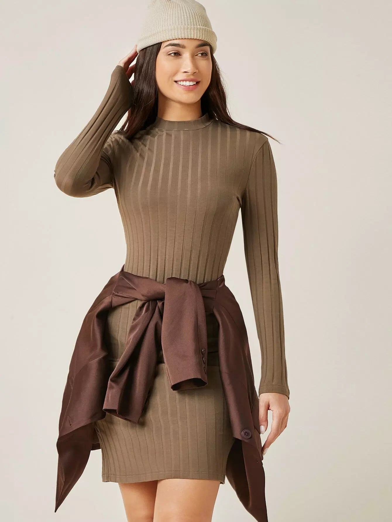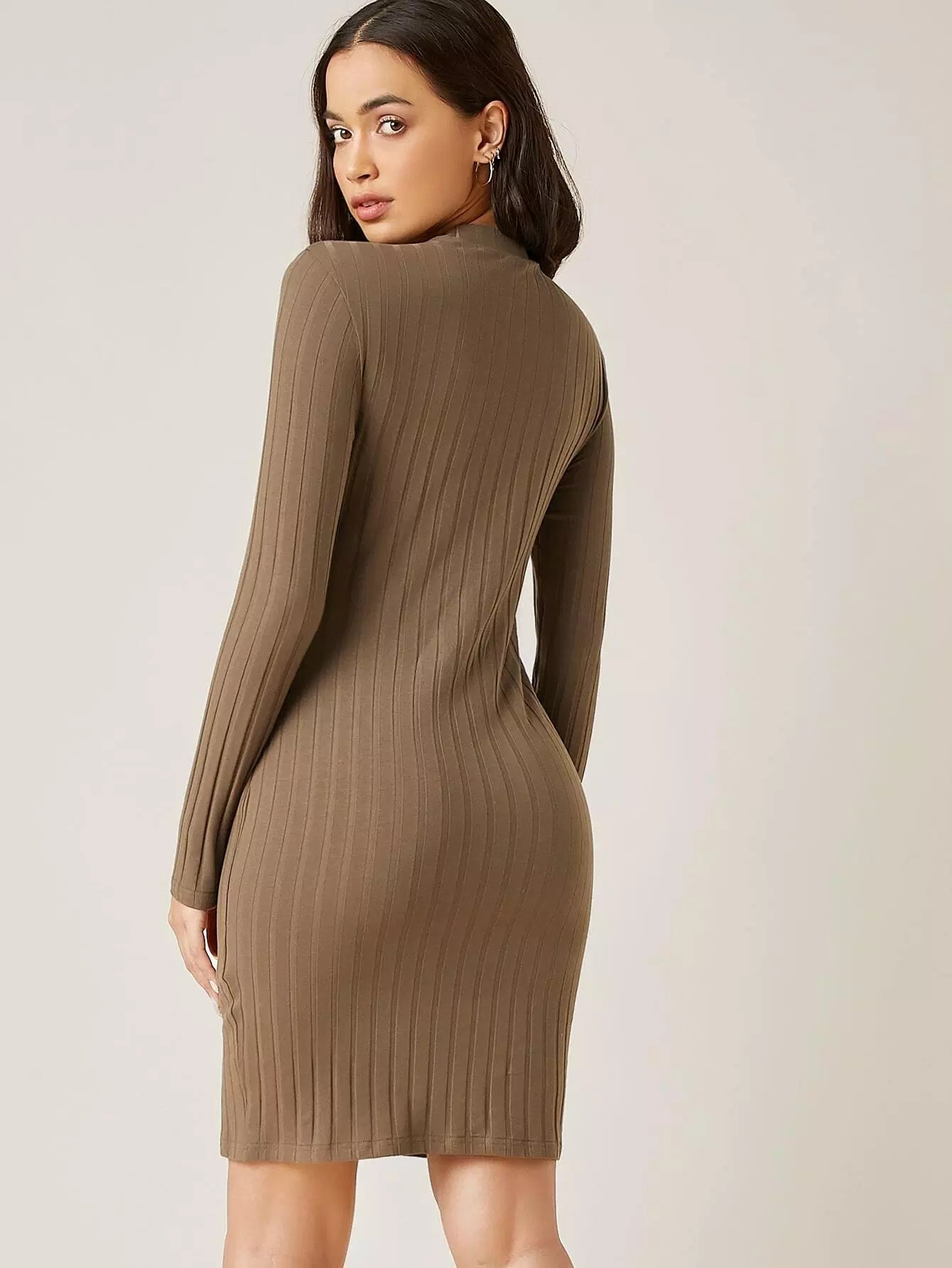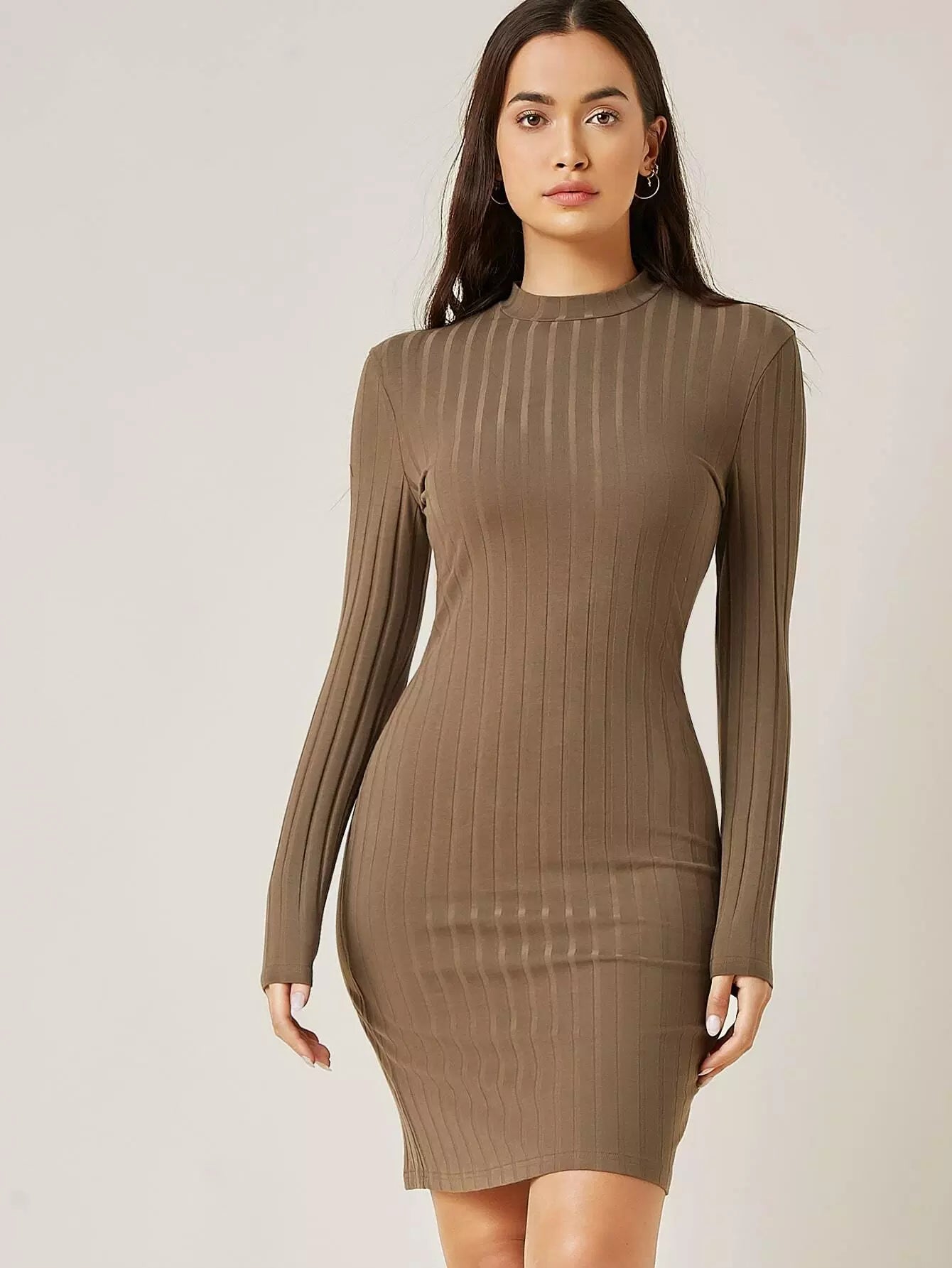 فستان بياقة مستقيمة محبوك على شكل ضلع محبوك بياقة مستقيمة
