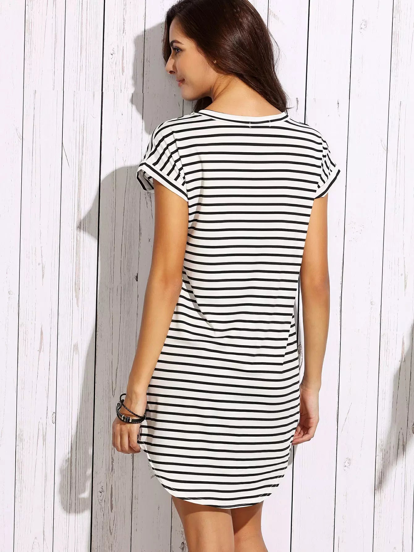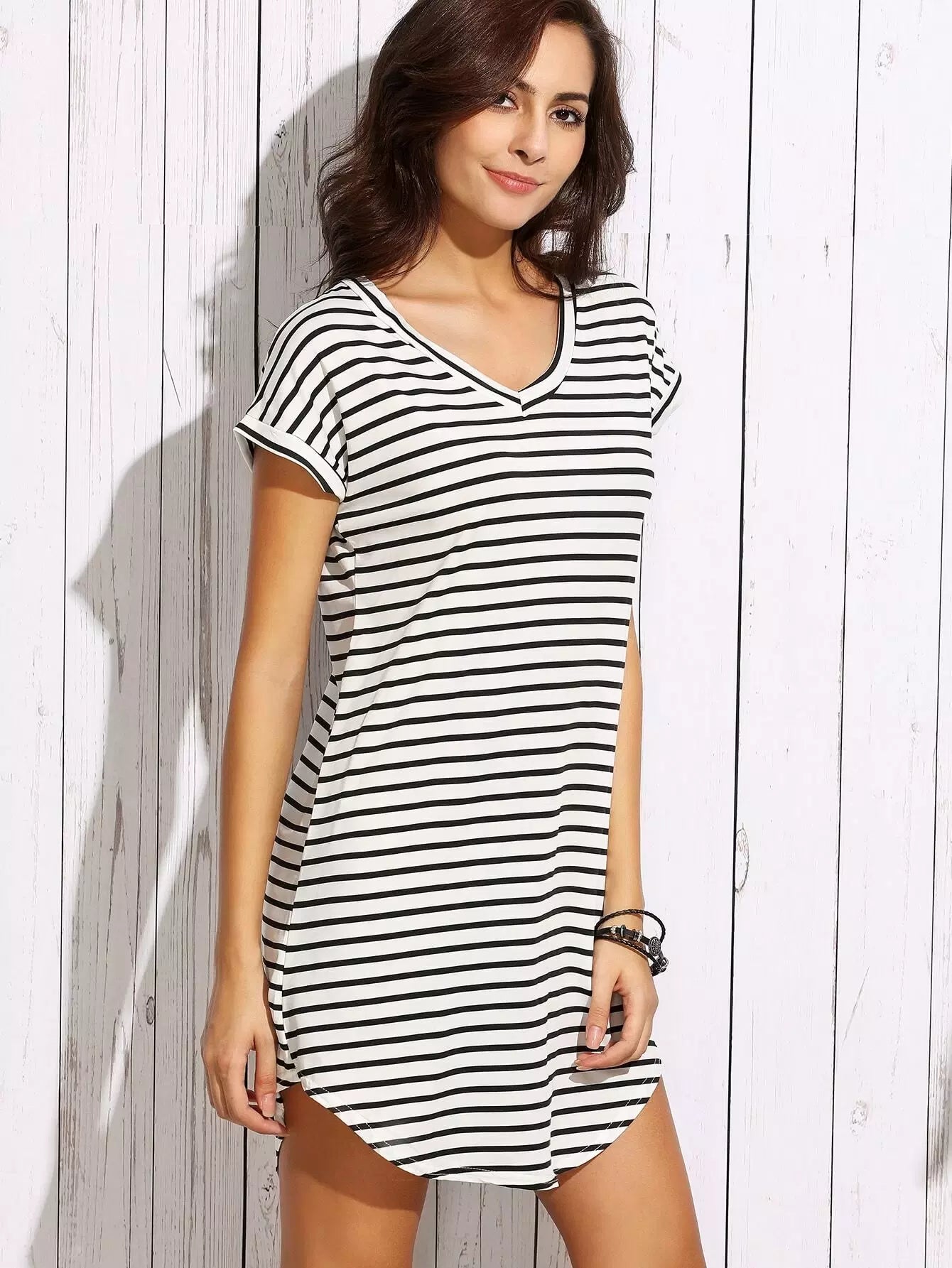 فستان تي شيرت مخطط بياقة على شكل حرف V بحافة منحنية