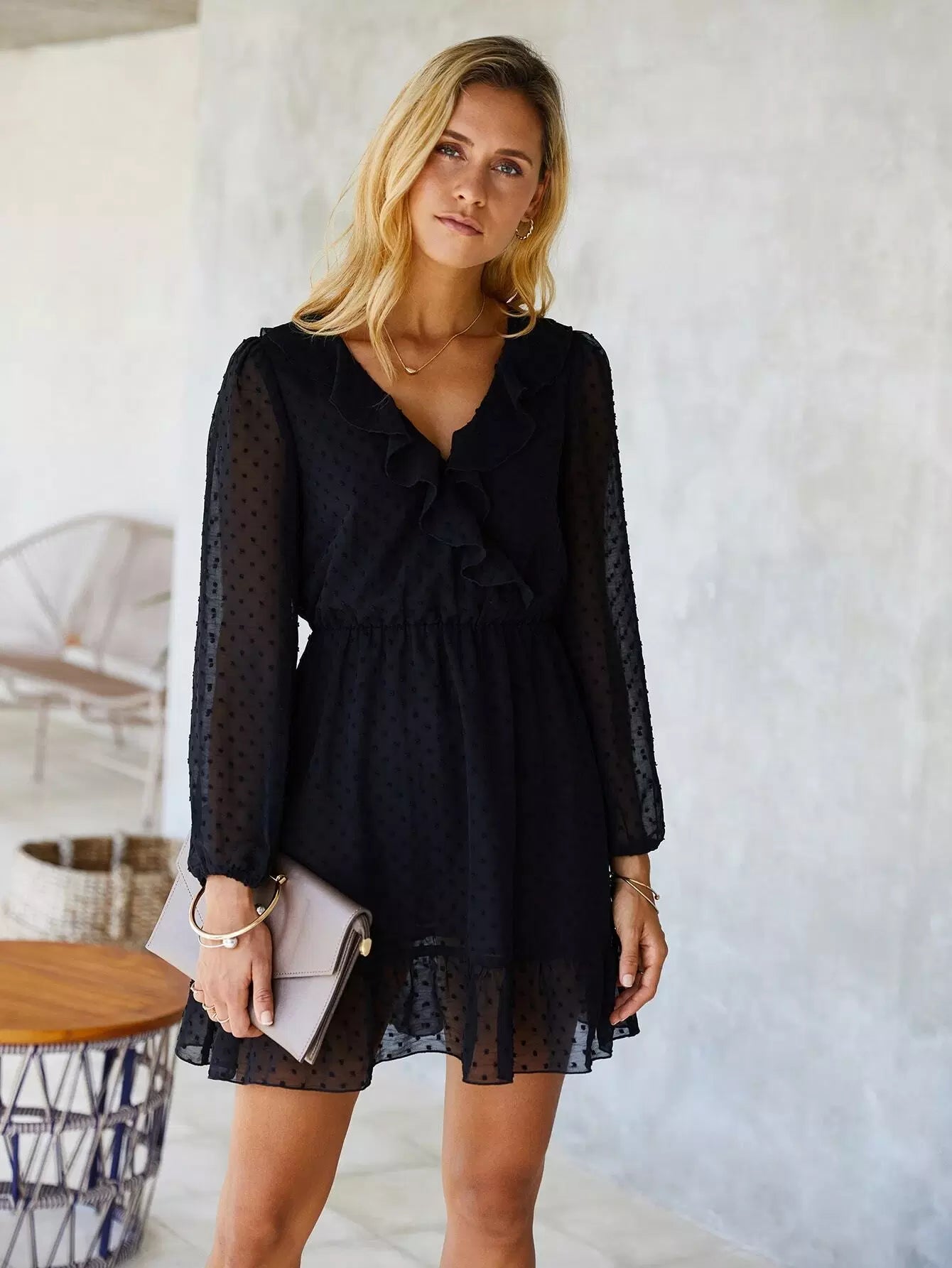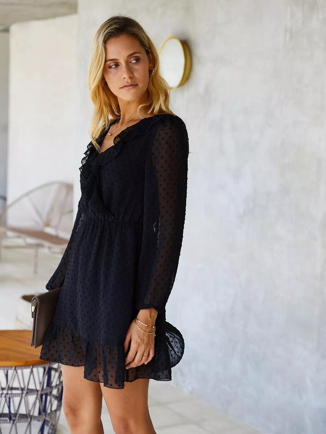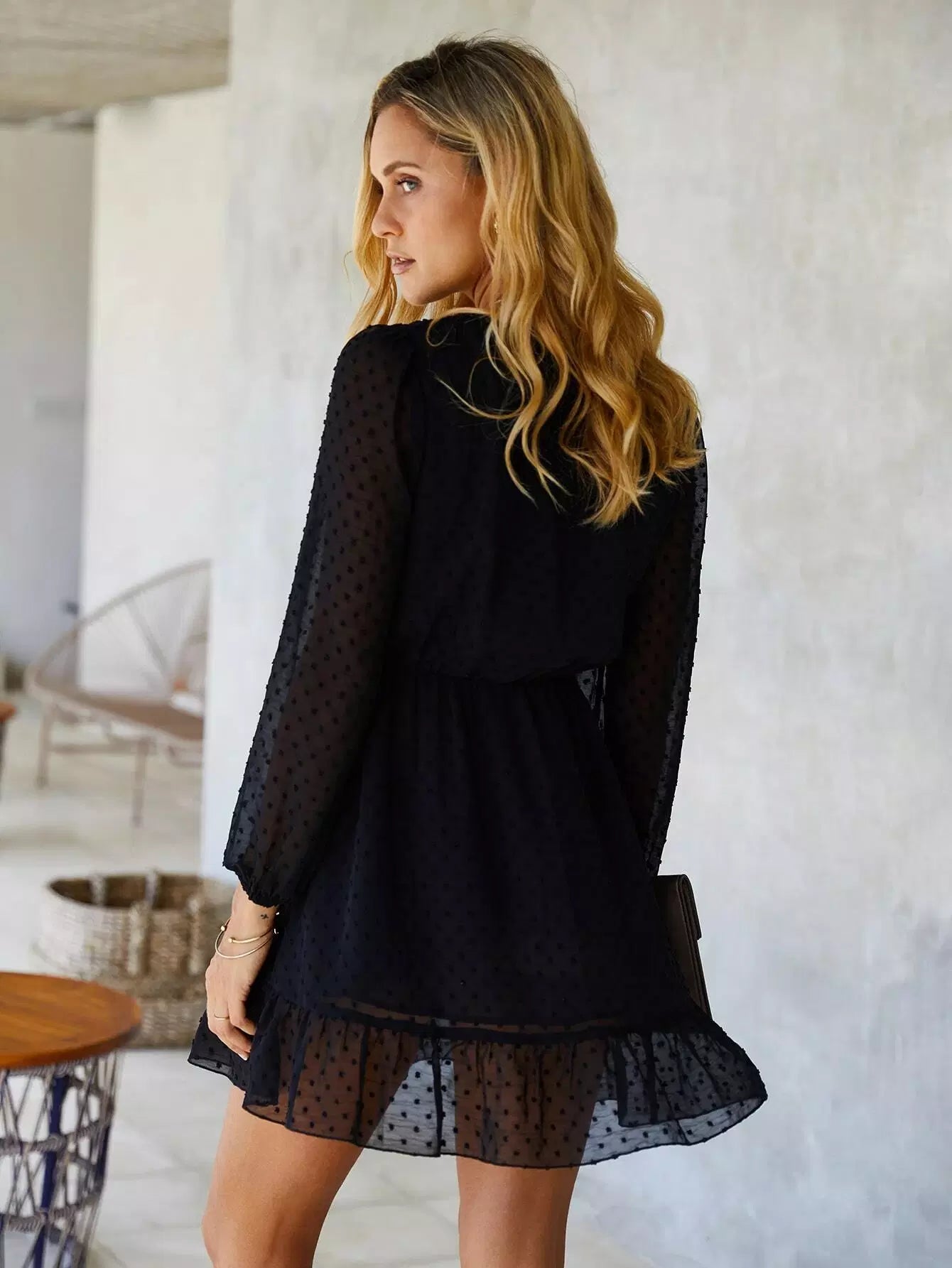 فستان بحواف مكشكشة منقطة سويسرية على شكل حرف A