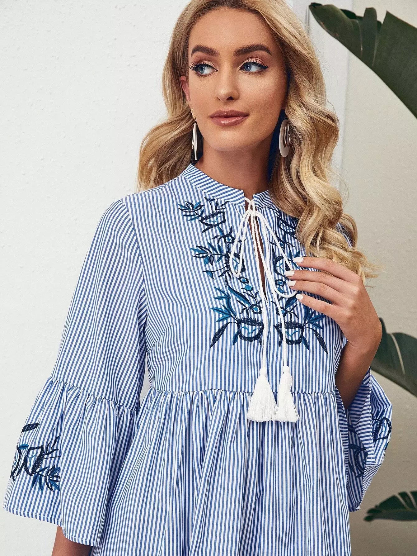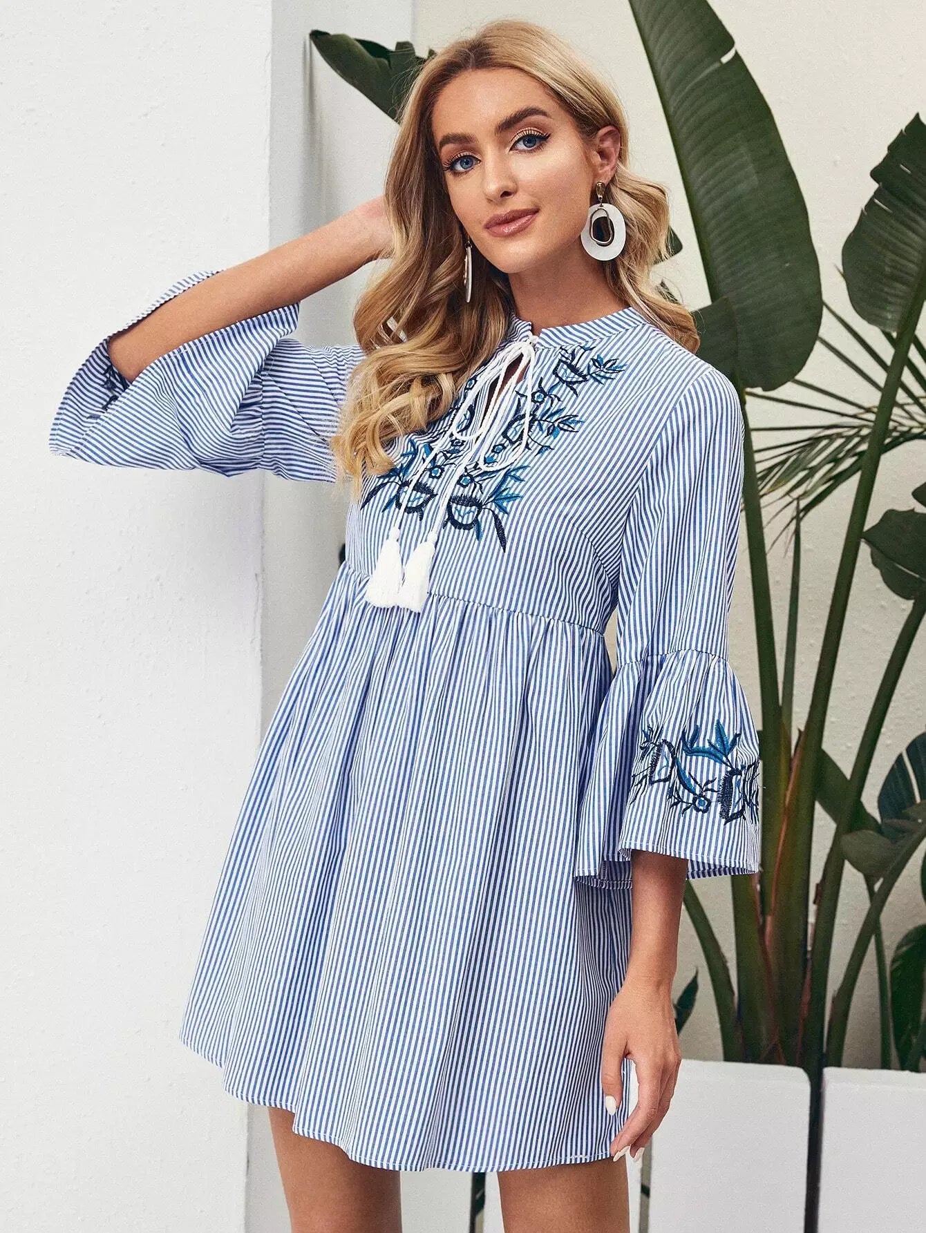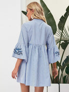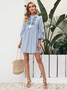 فستان مخطط بأربطة عنق مزين بتطريزات زهرية مخططة بشرابة
