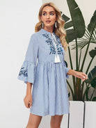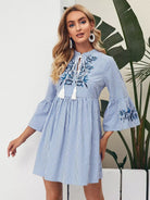 للنساء - فستان مخطط مزين بالزهور ومطرز بربطة عنق وشرابة