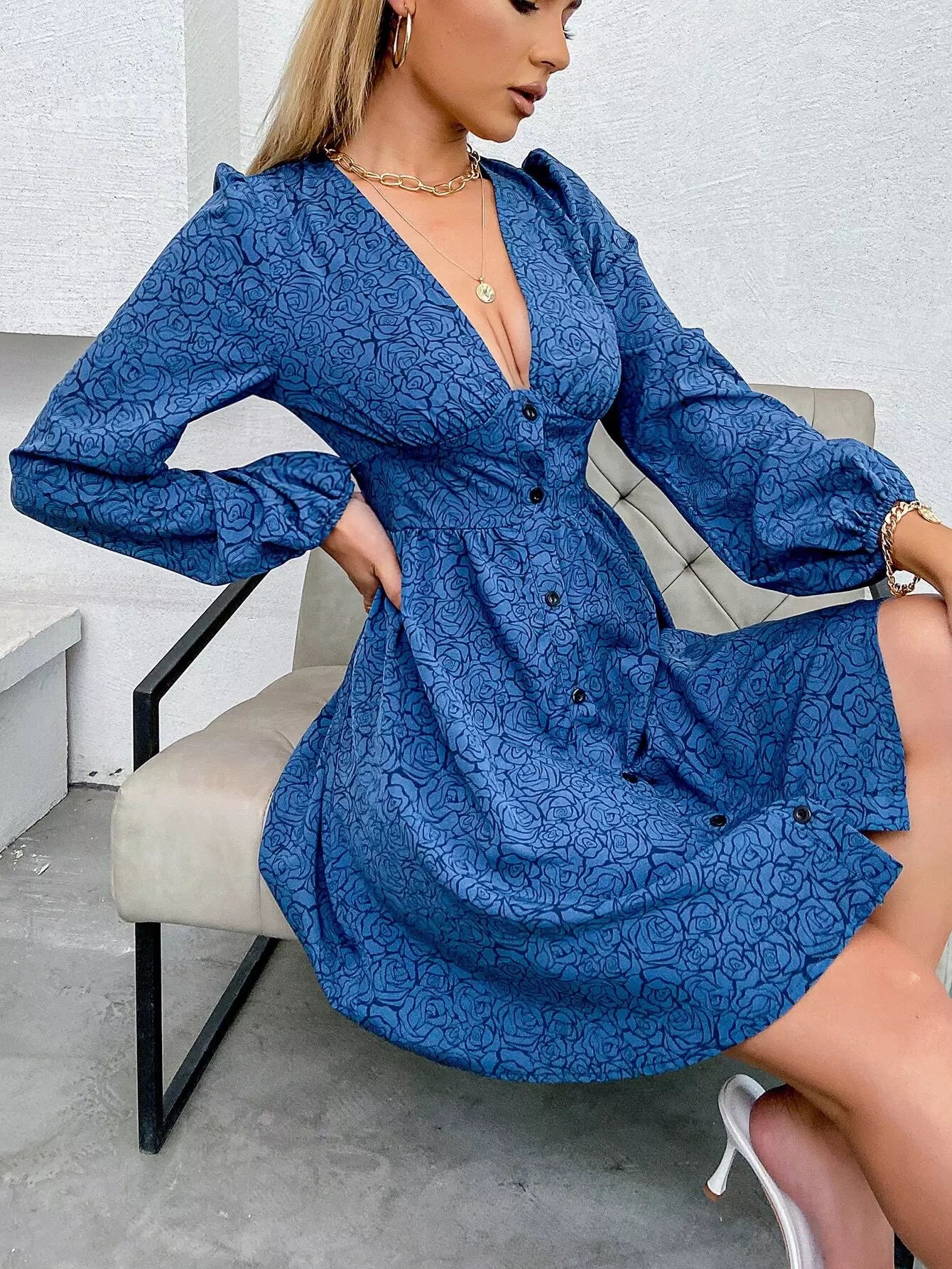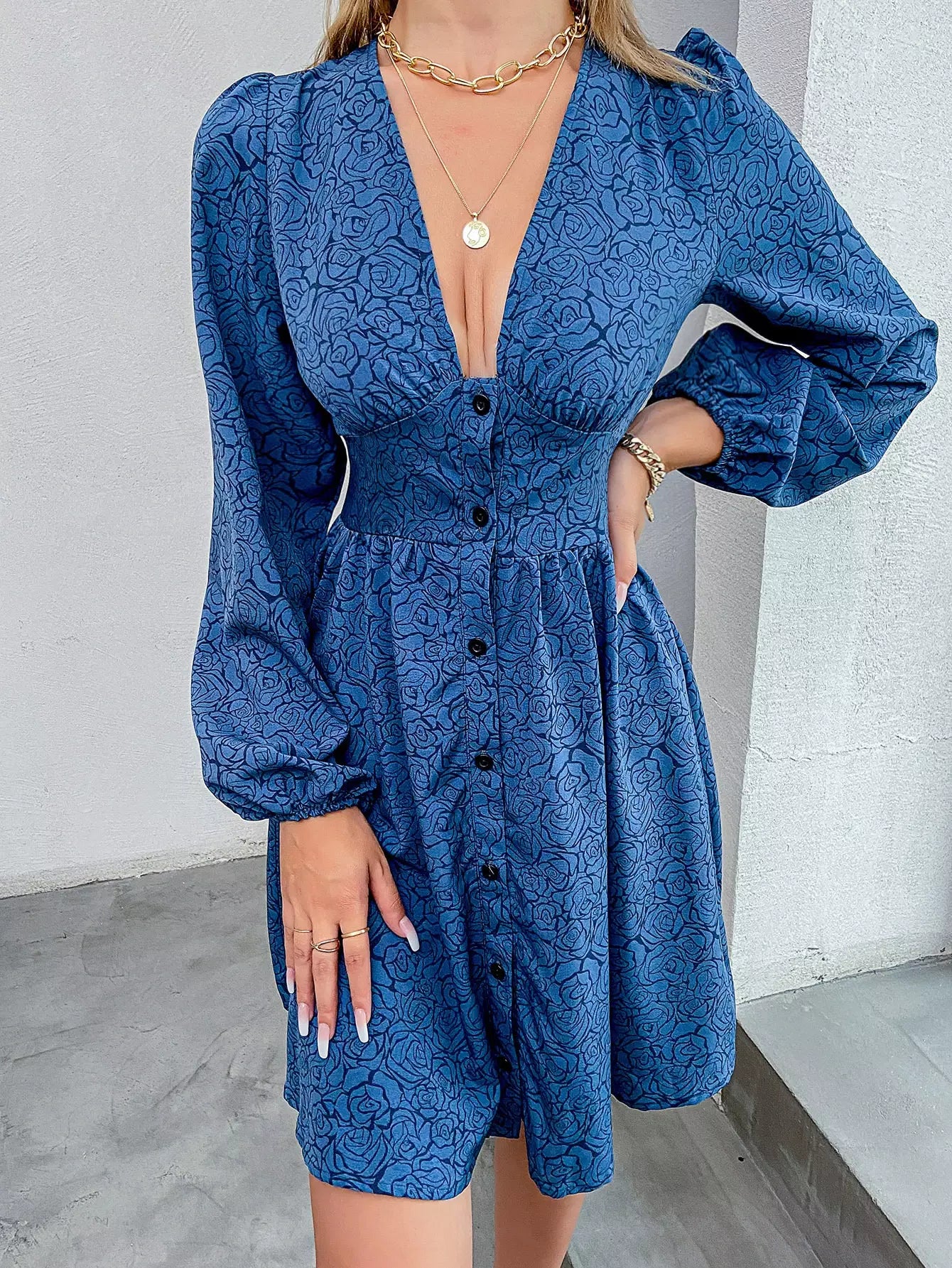 فستان بأكمام على شكل زهور مطبوع بالكامل على شكل زهور بأكمام على شكل حرف V عميق برقبة على شكل فانوس