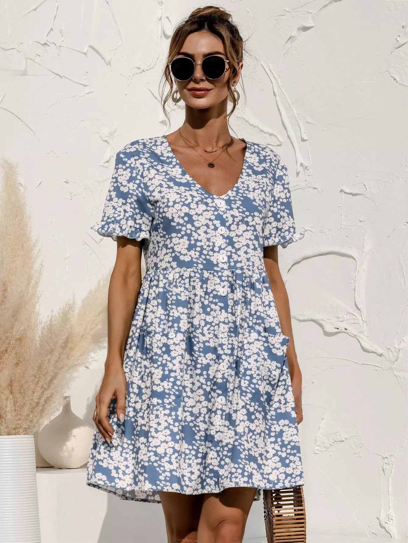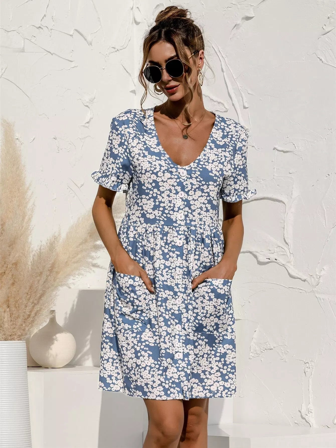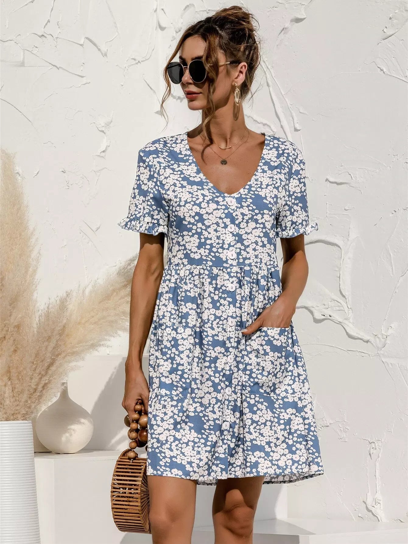 فستان مزين بطبعة زهور مطبوع على الجيب بالكامل