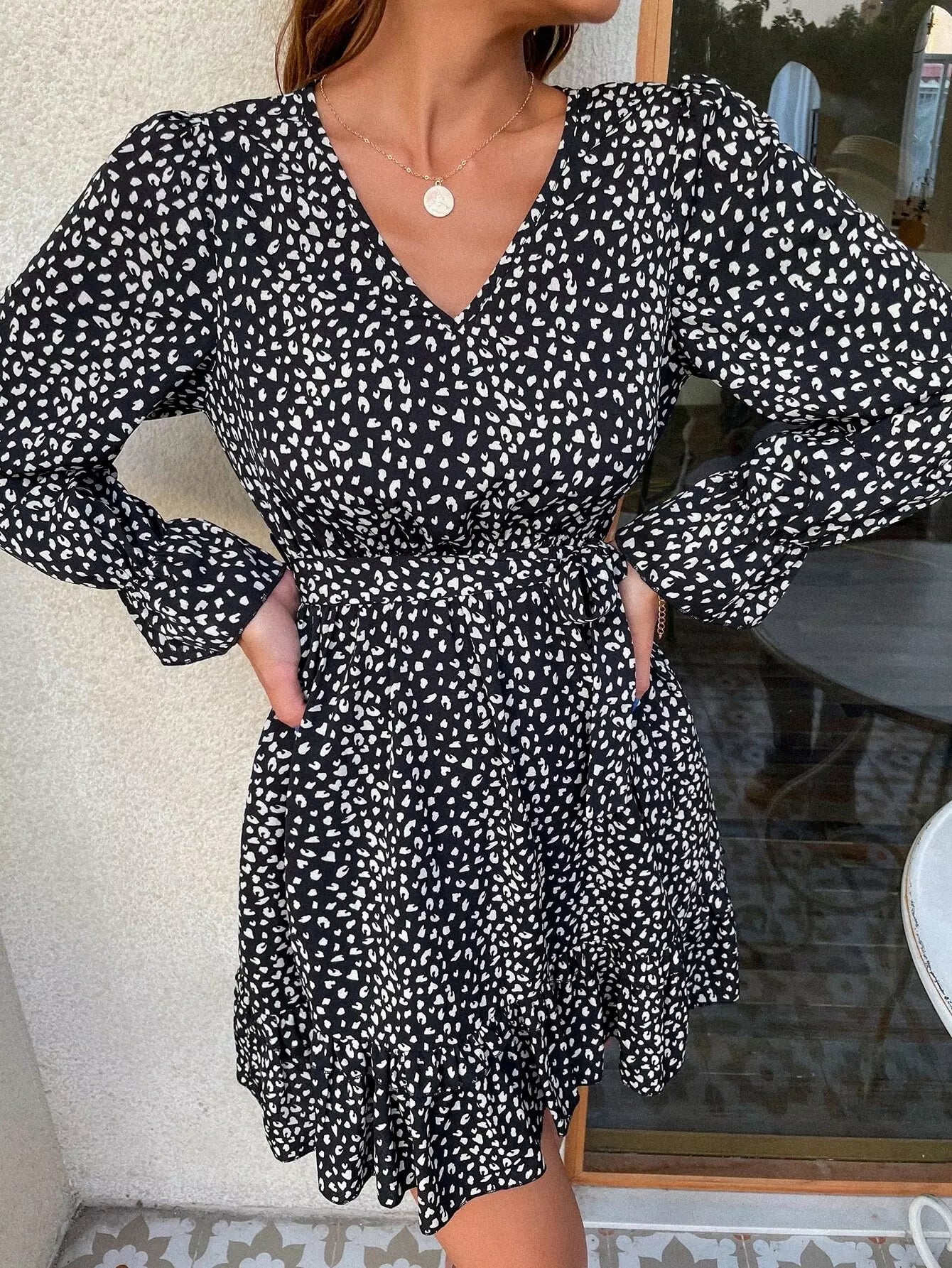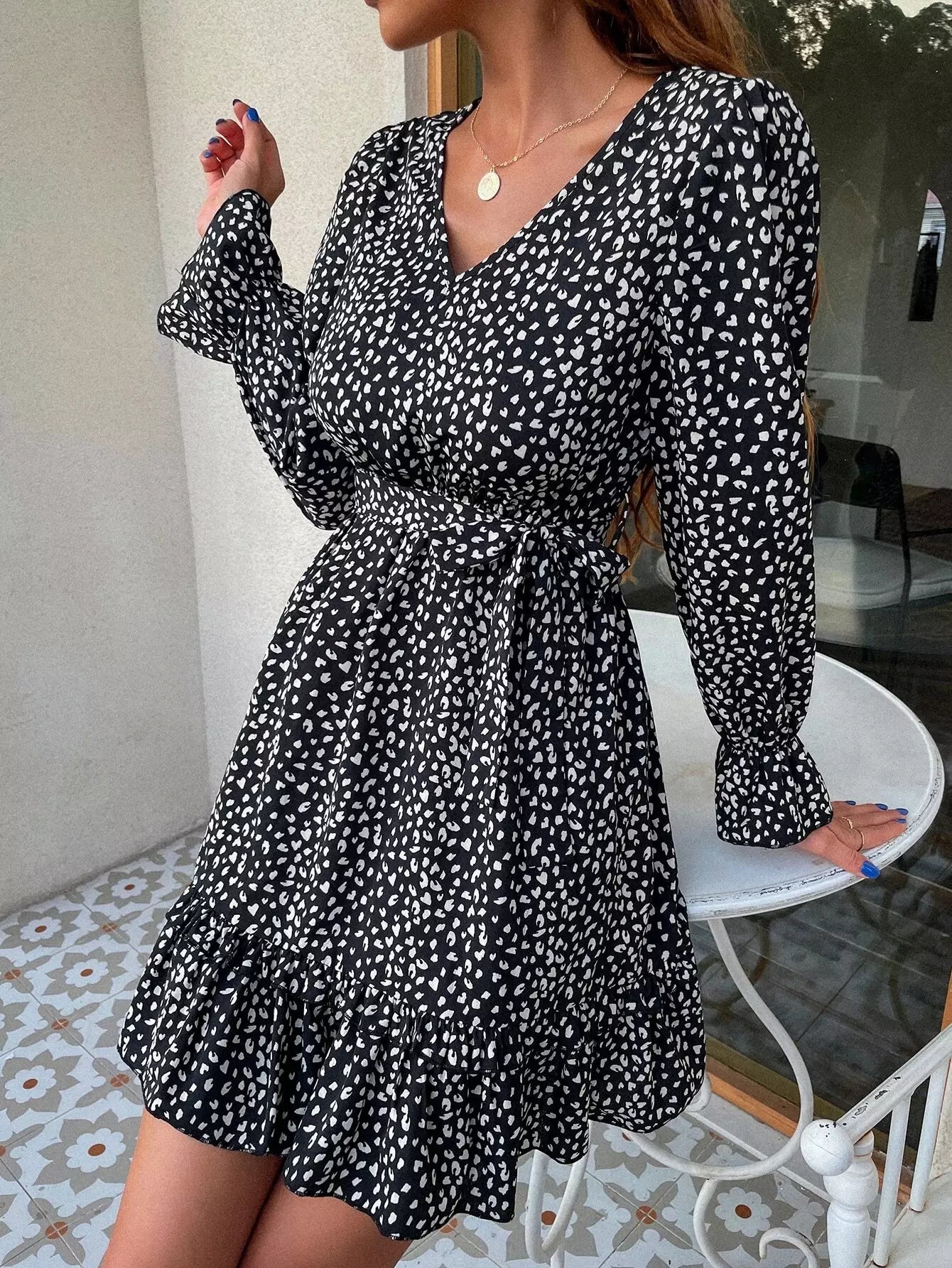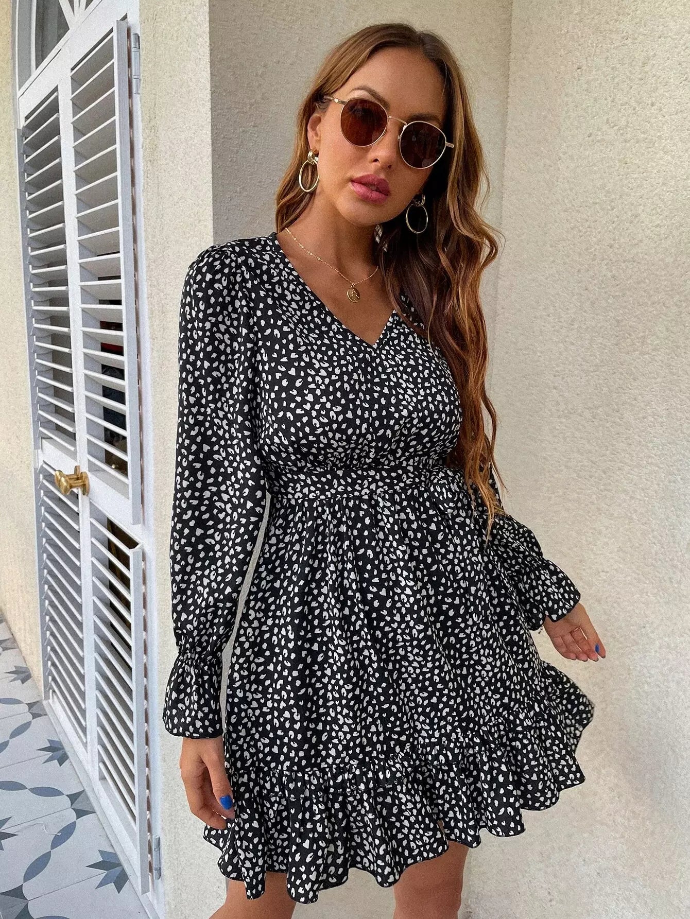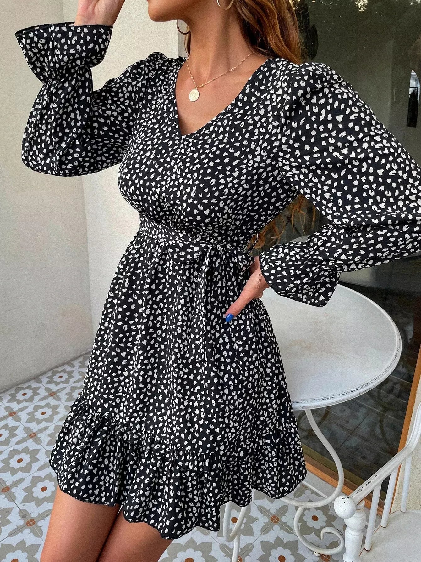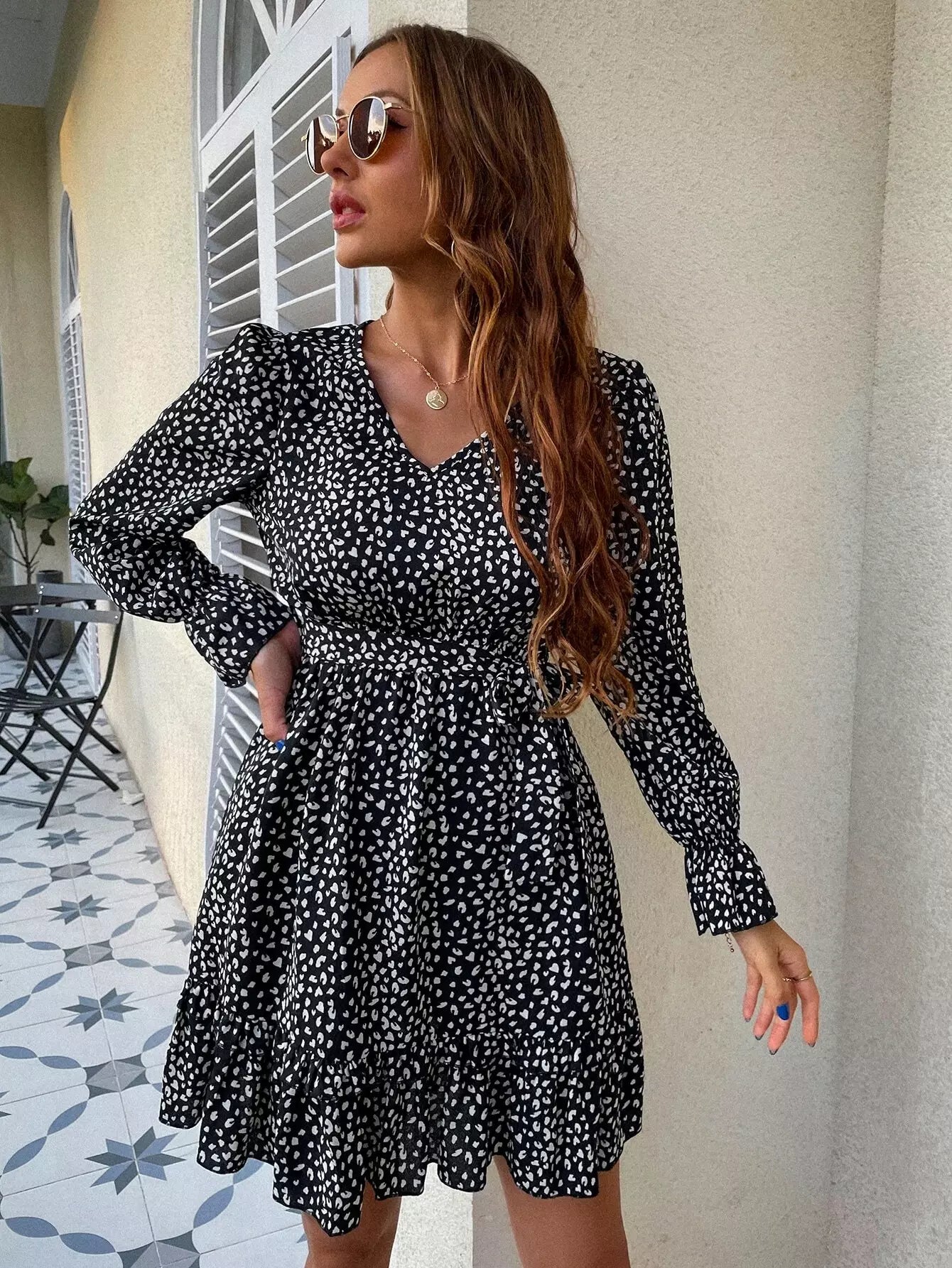 فستان بأكمام واسعة ومطبوع بالكامل بدون حزام